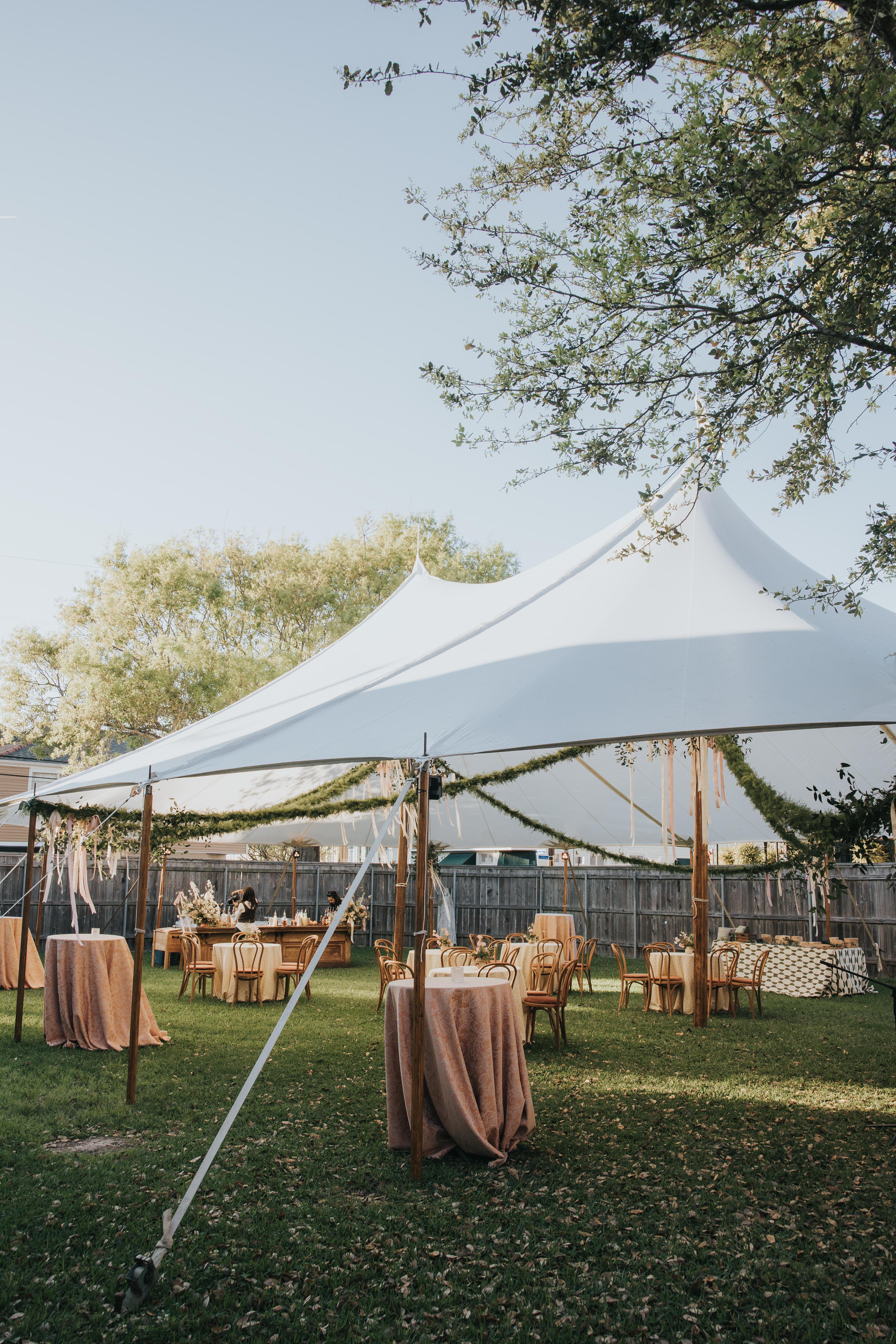 This courtyard rests on high ground and doesn't flood easily. It can fit as large as a 40x40 tent and dance floor, as well as a catering tent (or up to 3 food trucks) and portable restrooms. Note: We can supply power hookups for catering but don't provide a full kitchen. The courtyard is surrounded by a wooden fence and has multiple entry points.