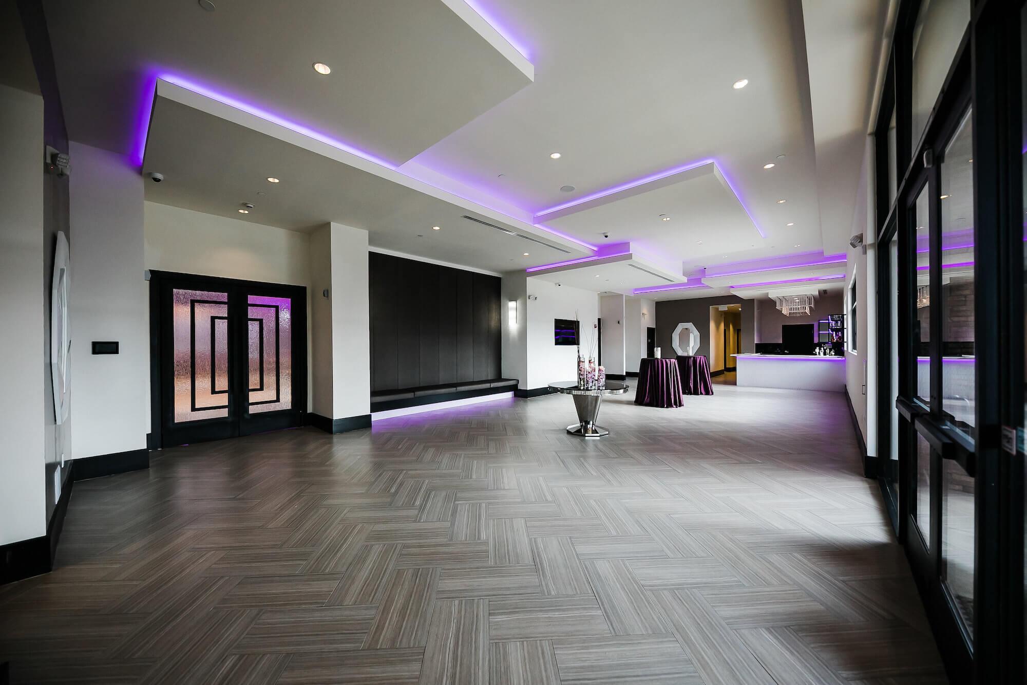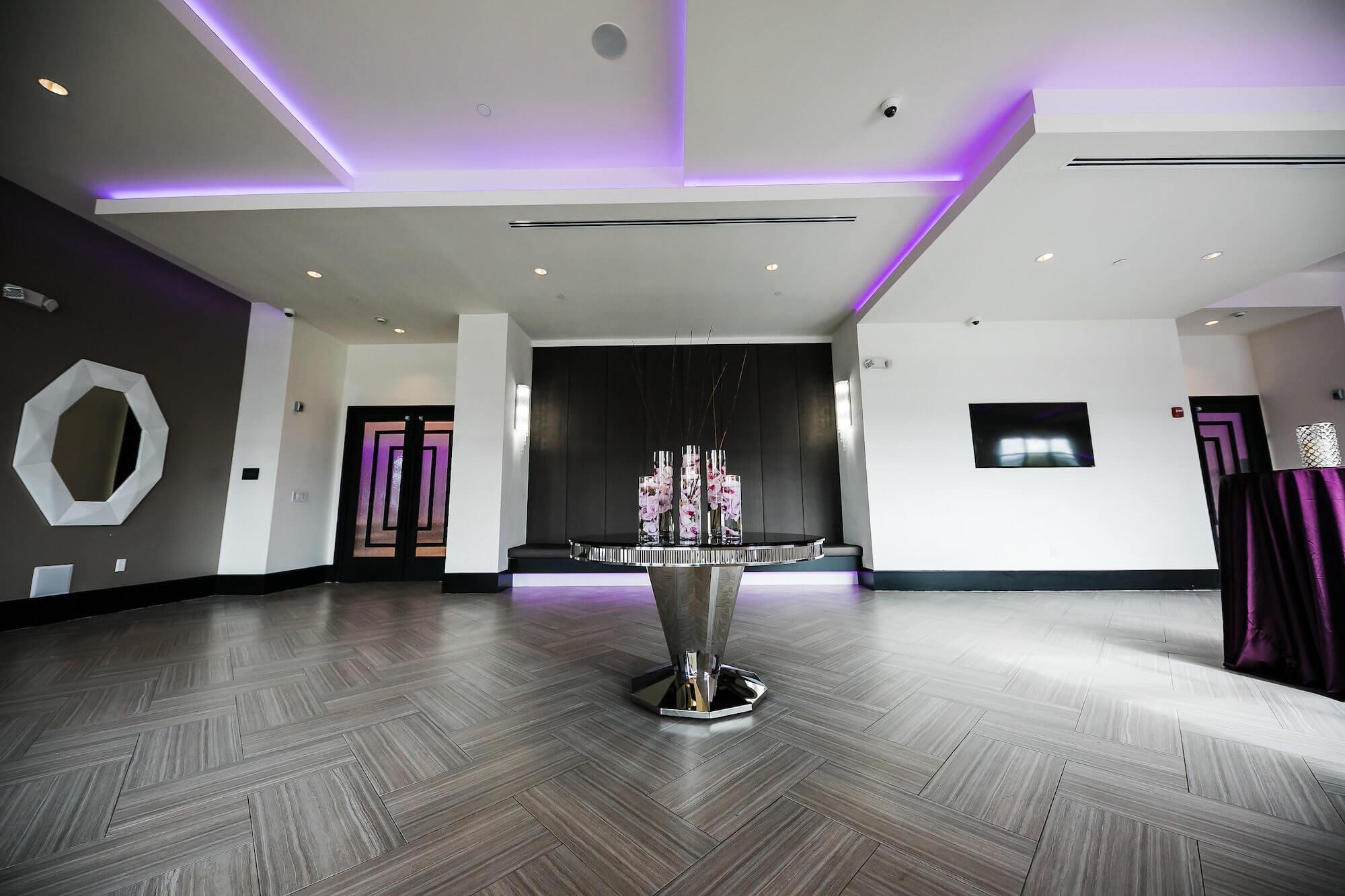 Three stunning crystal chandeliers, custom iron doors, and a built-in dance floor that compliments its modern structure and appeal. | Welcome your guests through a private covered entrance into our modern designed cocktail lobby with built-in bar. | Fully integrated, state of the art audiovisual system complete with a drop down projector, sound system throughout the venue, and a digital display in the lobby. | Custom colored LED lighting, spotlights, and audio-motion lights to get the party going. | Private restrooms. | Optional VIP suite. | Optional use of the outdoor Veranda.