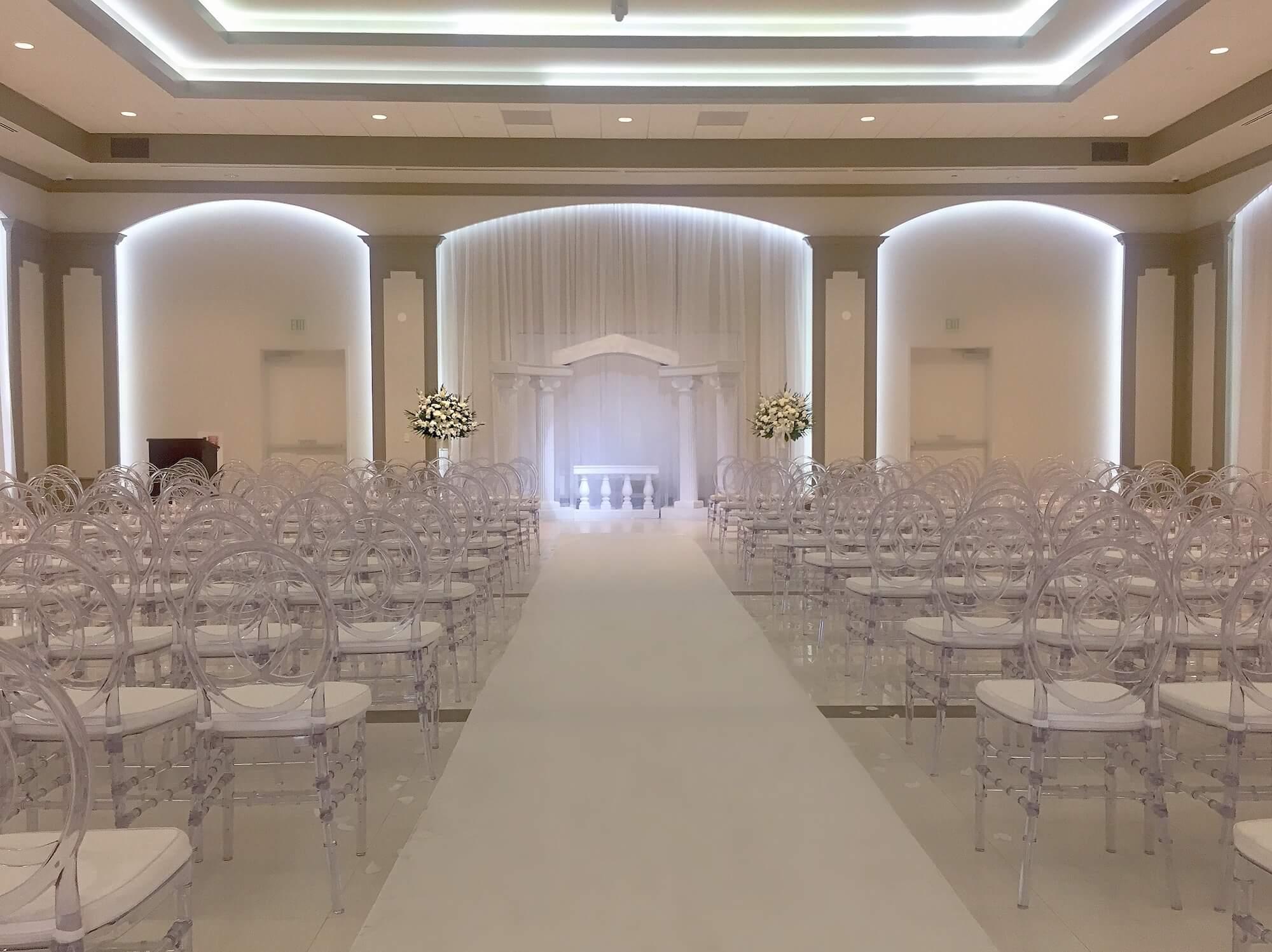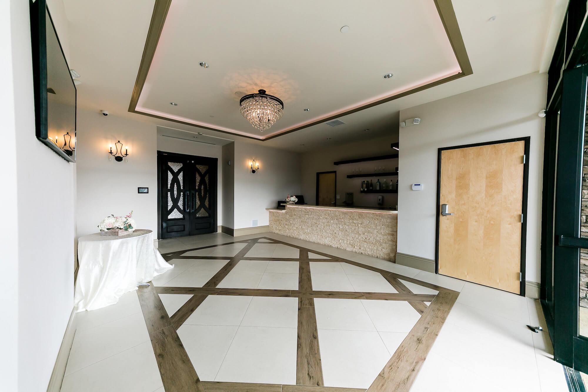 Unforgettable 11 foot wide crystal chandelier, crystal wall sconces throughout, and a built-in dance floor that compliments its transitional structure and appeal. | Welcome your guests through a private covered entrance into our transitionally designed cocktail lobby with built-in bar. | Fully integrated, state of the art audiovisual system complete with a drop down projector, sound system throughout the venue, and a digital display in the lobby. | Custom colored LED lighting, spotlights, and audio-motion lights to get the party going. | Private restrooms. | Optional VIP suite. | Optional use of the outdoor courtyard.