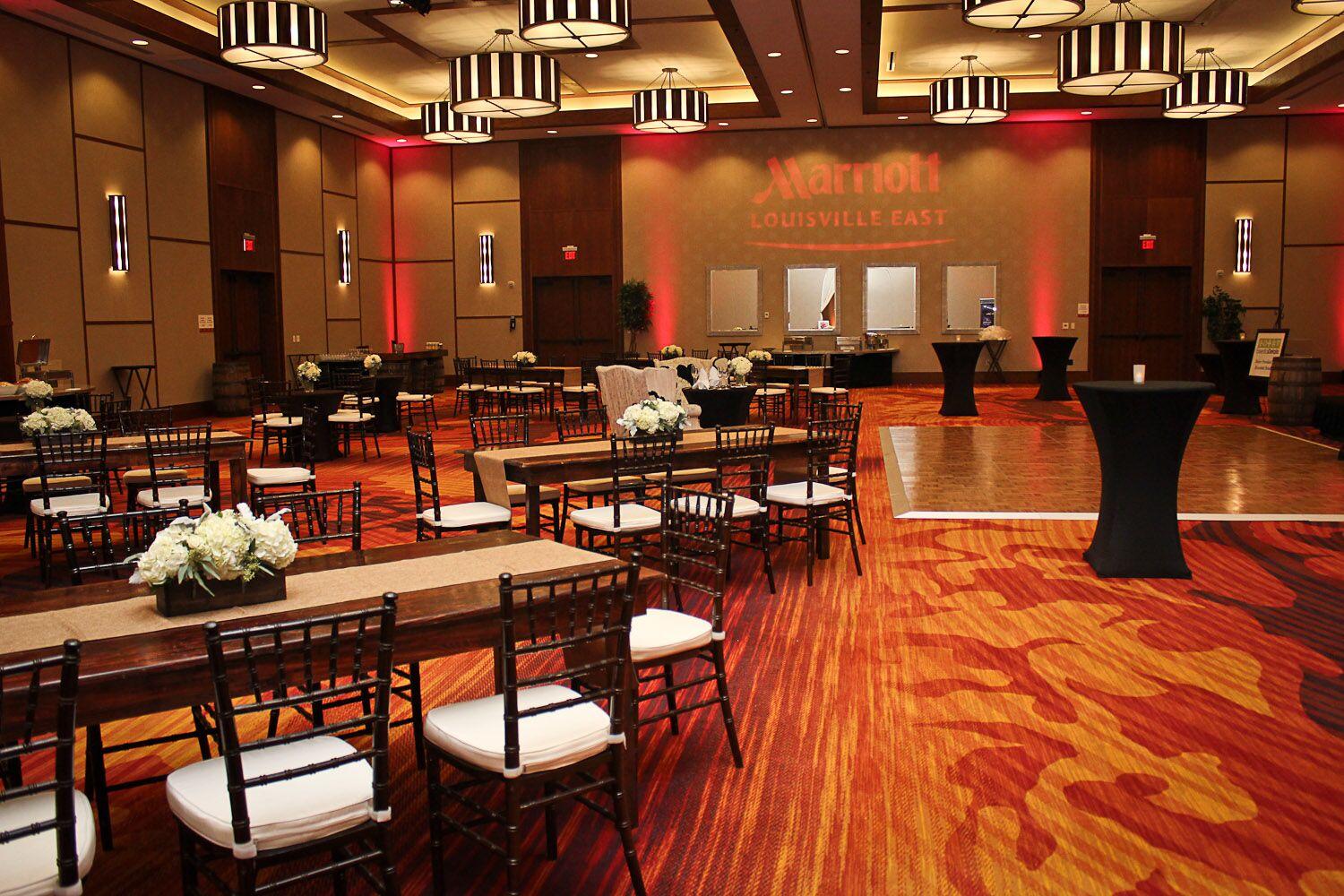 With 17 rooms and over 18,500 square feet of meeting and event space, the hotel has a variety of areas to host occasions. The largest venue at Louisville Marriott East is the 8,000-square-foot Commonwealth Grand Ballroom, which can accommodate up to 600 wedding guests. Other spaces include the Bluegrass Ballroom, Commonwealth Salon, and Colonel Room.