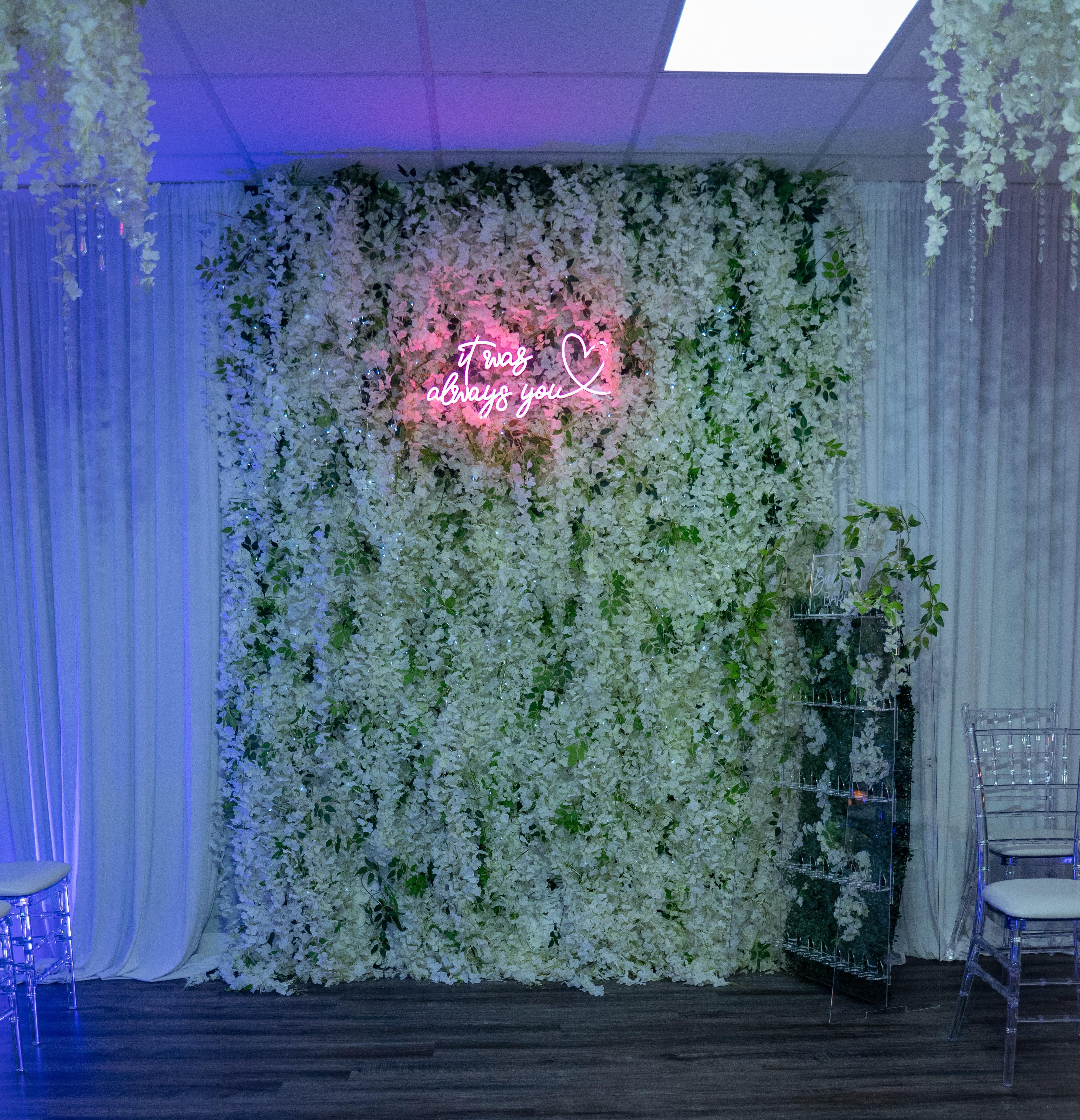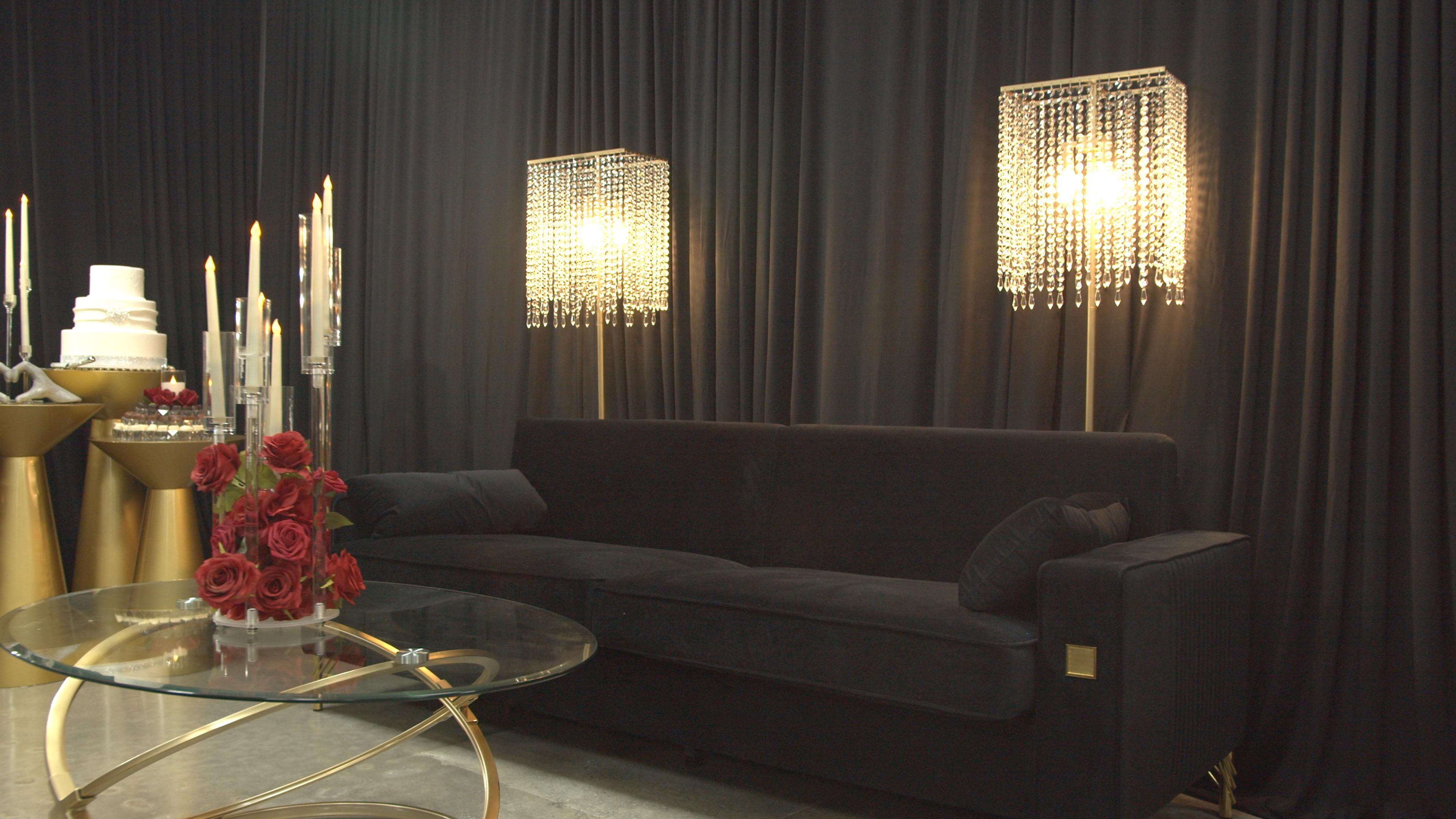 Imagine walking down the rose petal covered aisle, candles illuminating the room, a rose arch, and your soon to be spouse waiting for you to only take their hand. The Lover's Lounge is our modern take on a classic color scheme with a bash of sexy. The space is draped with black fabric, estate style seating, two VIP seating areas, luxury glass bar height tables accompanied with bar stools and a stages buffet area. It is sure to please the modern-day bride!
