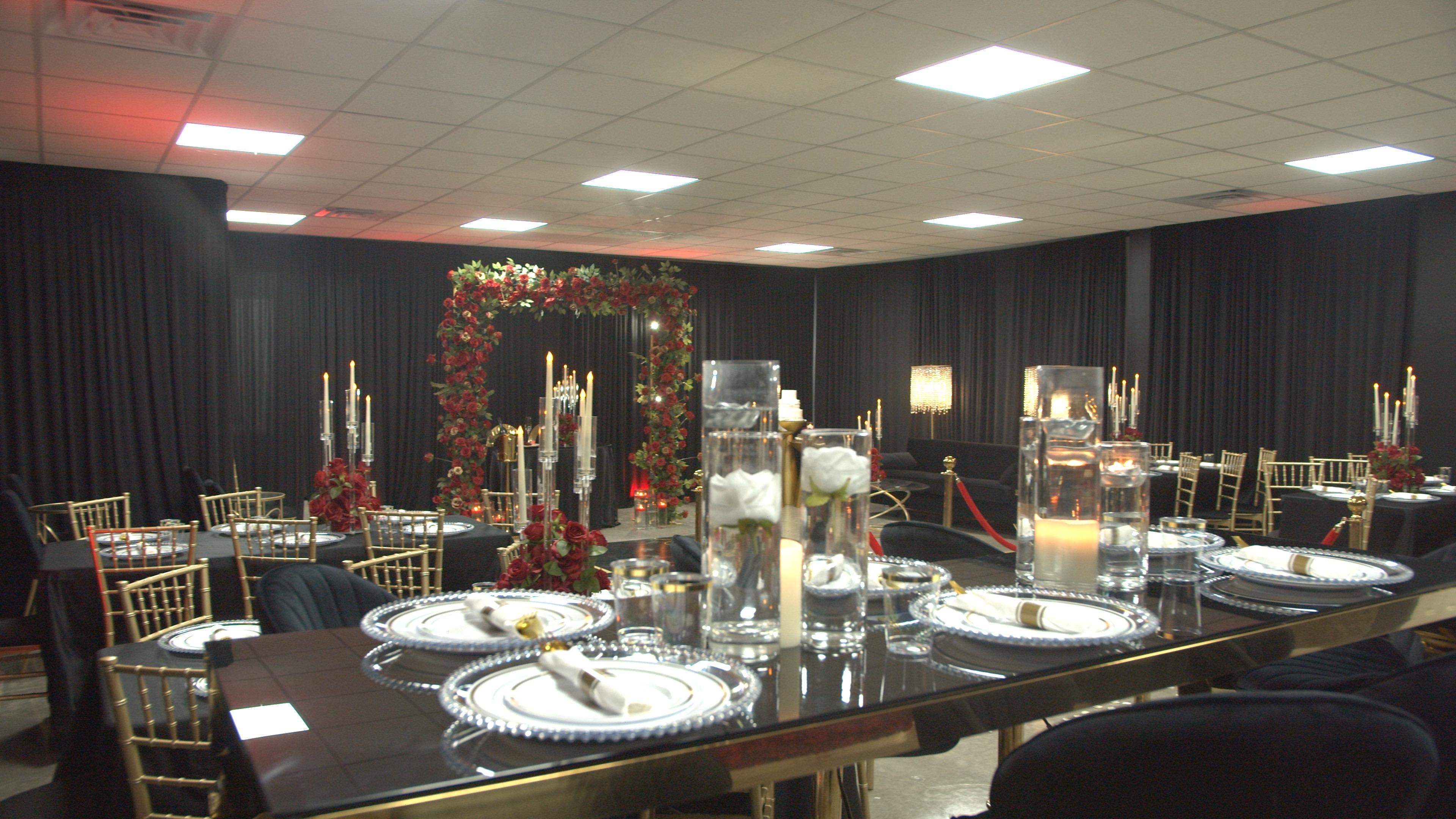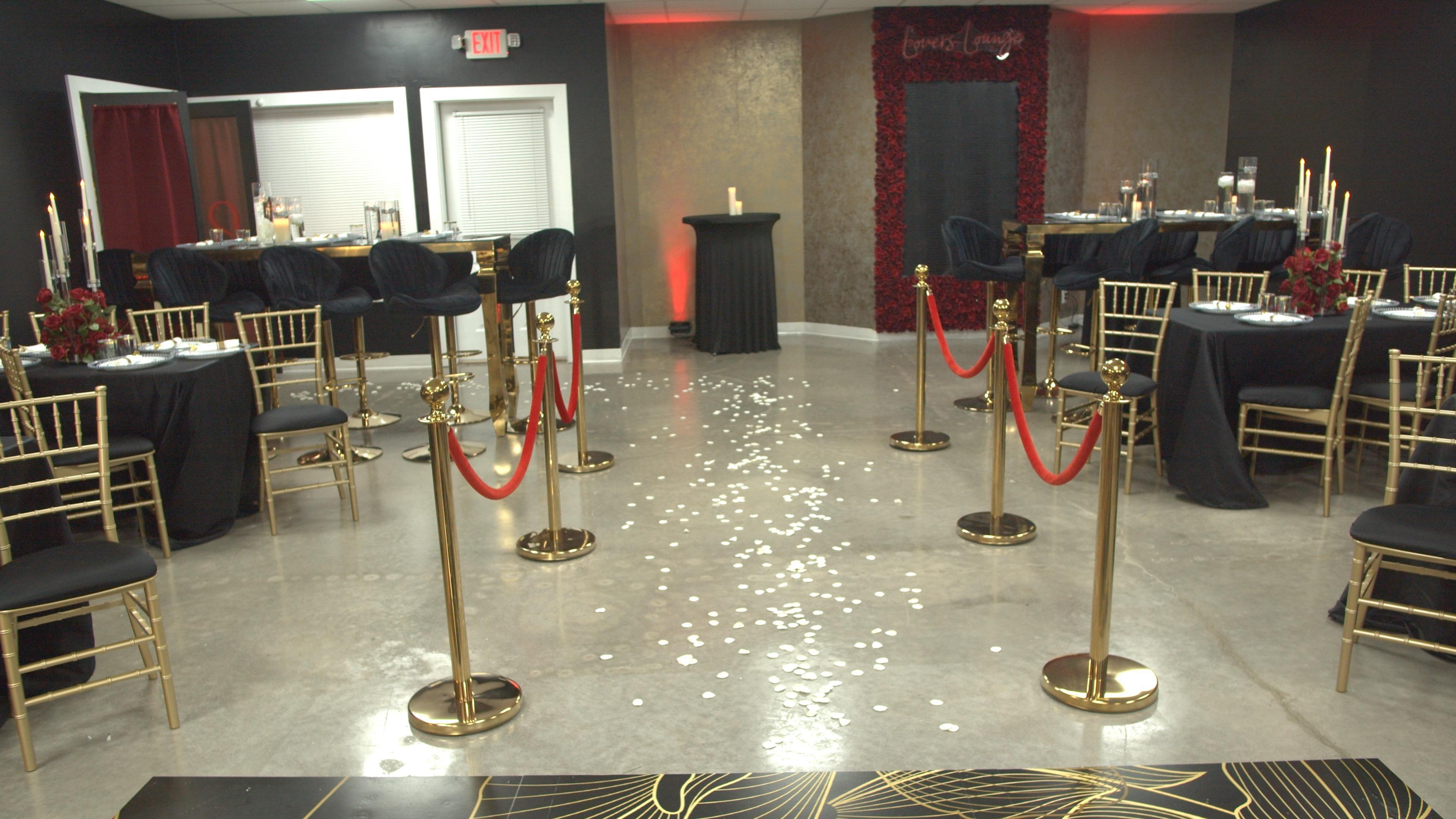 Imagine walking down the rose petal covered aisle, candles illuminating the room, a rose arch, and your soon to be spouse waiting for you to only take their hand. The Lover's Lounge is our modern take on a classic color scheme with a bash of sexy. The space is draped with black fabric, estate style seating, two VIP seating areas, luxury glass bar height tables accompanied with bar stools and a stages buffet area. It is sure to please the modern-day bride! (photo C)