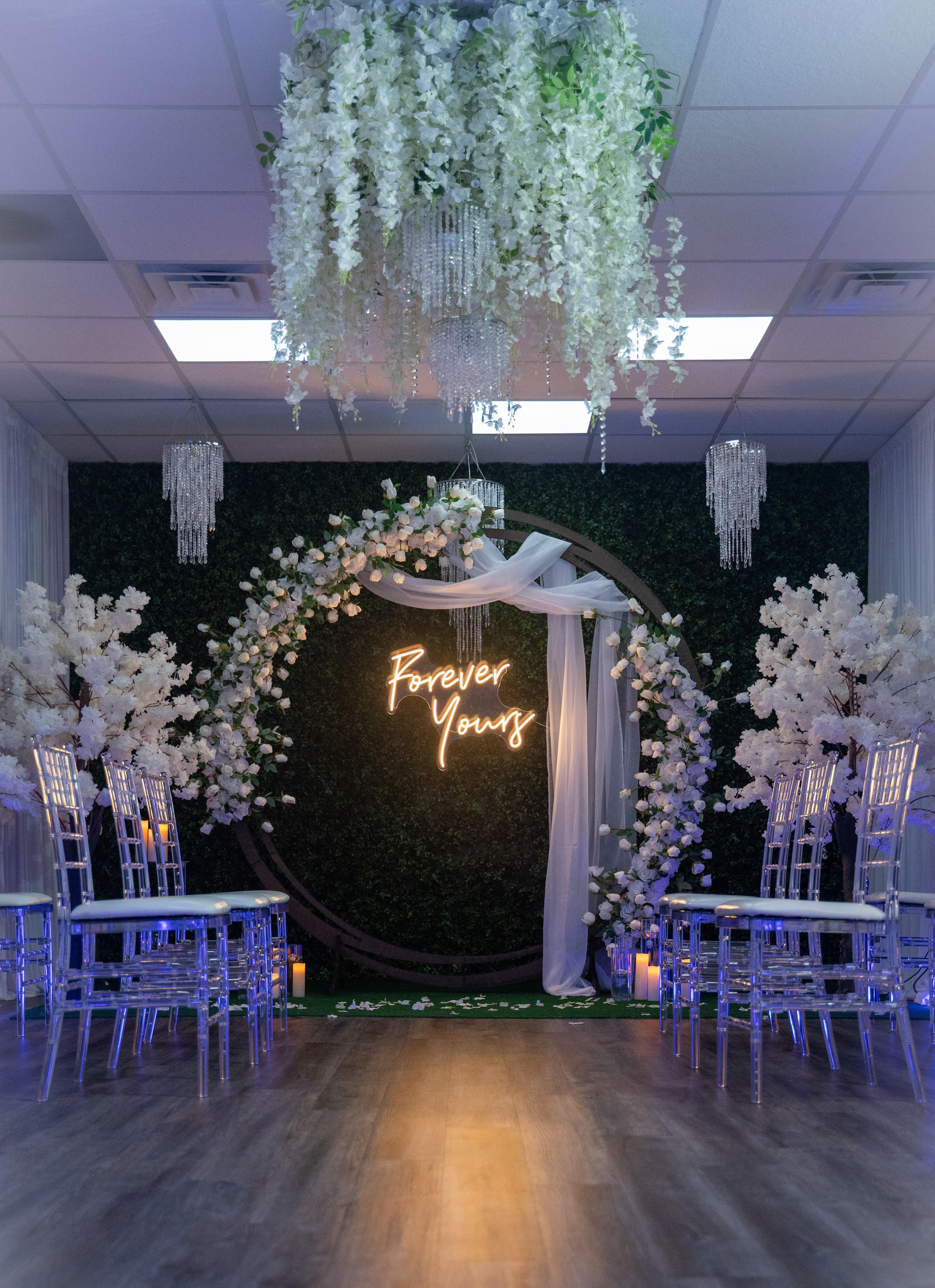 The Magical Garden room couldn't be more perfect for an intimate wedding ceremony and elopements. Draped in white fabric, covered in white flowers, an aisle lined with clear chivari chairs, cherry blooms trees and floating candles, this room is sure to compliment any wedding color scheme!