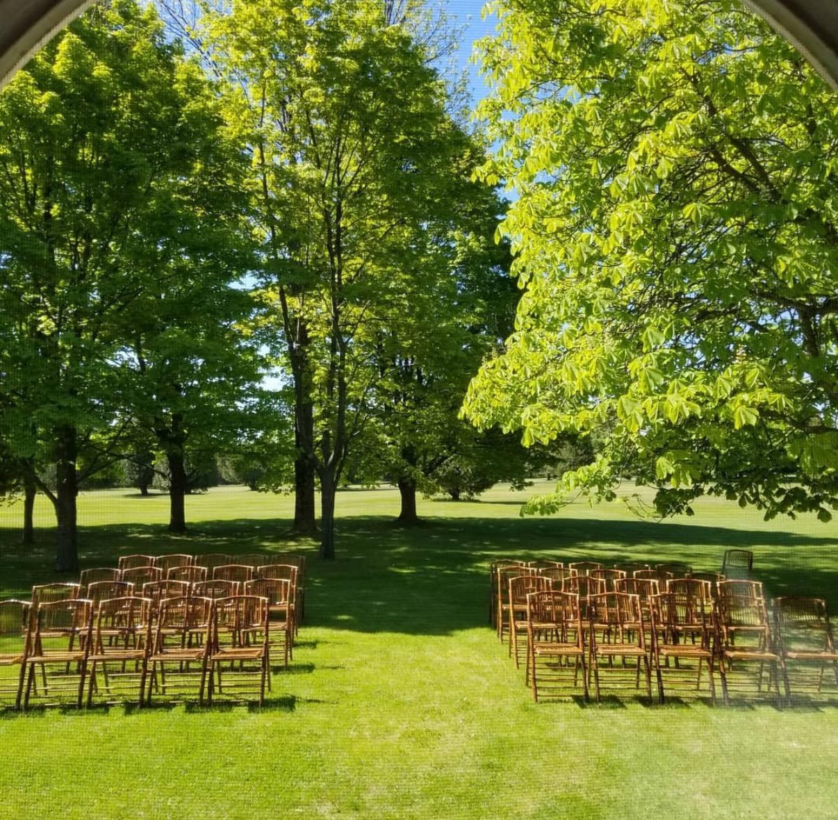 Grassy area located under a gorgeous canopy of 100 year old maple and chestnut trees. Say “I do” in a serene space centered around nature, overlooking the golf course and stone lodge. Stunning in the summer and fall.