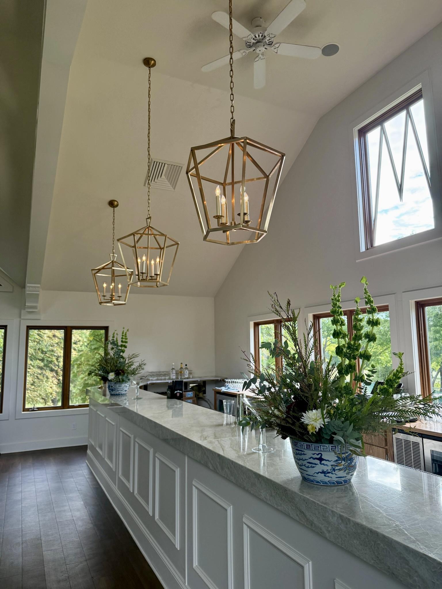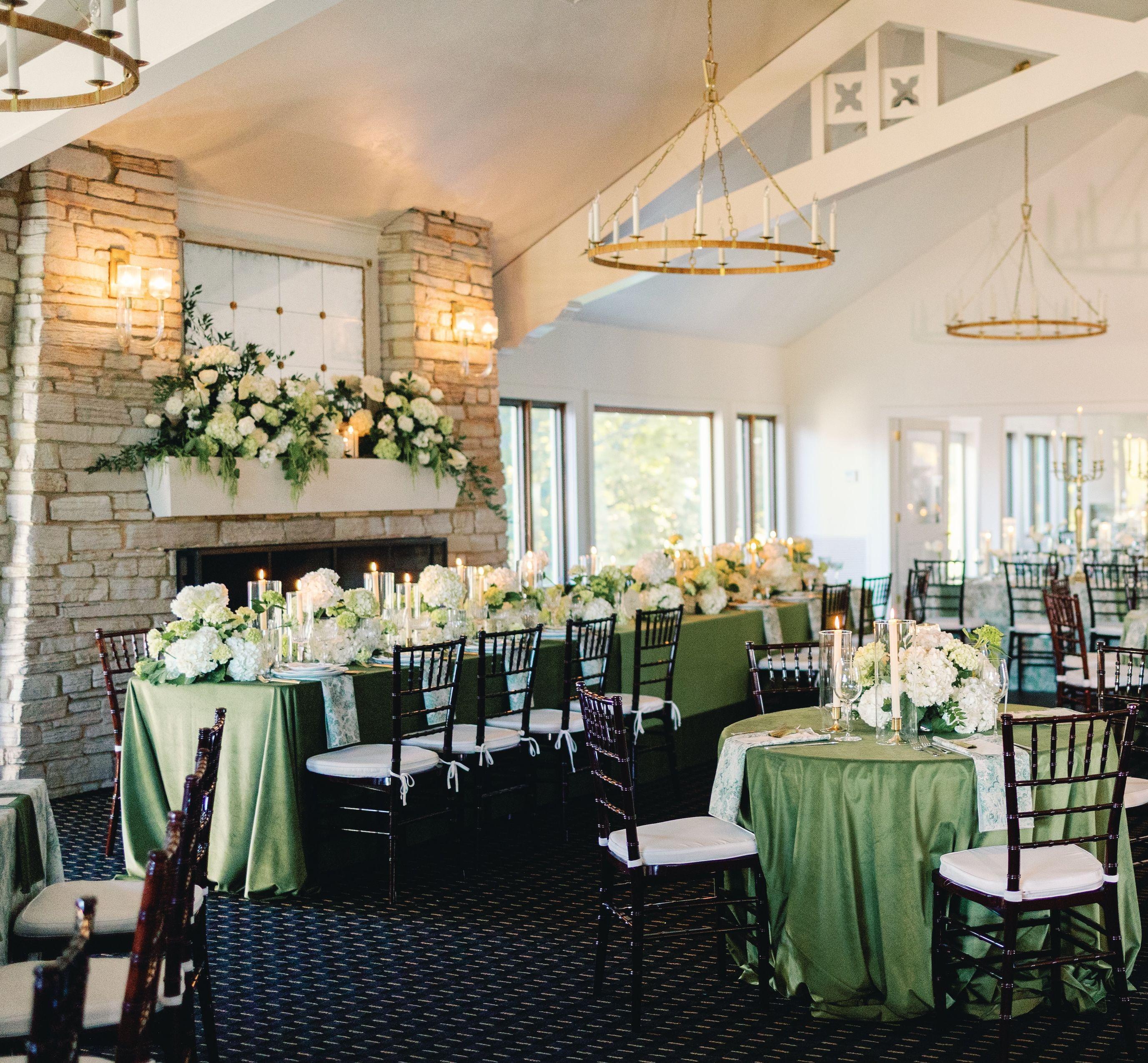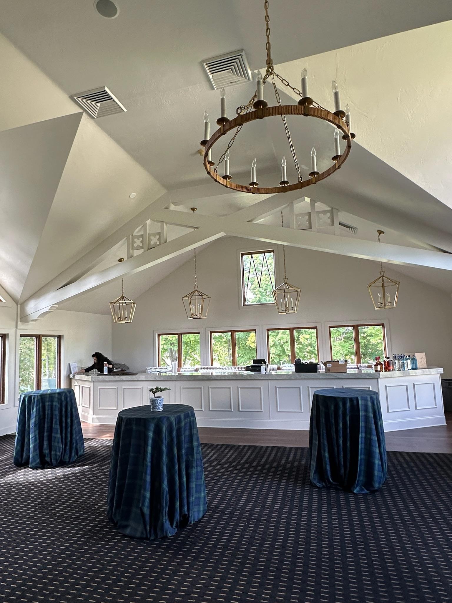 This newly renovated space beautifully blends vintage charm with modern elegance. It features tall ceilings with exposed wooden beams, beautiful chandeliers, and a grand stone fireplace with timeless accents. Expansive windows offer sweeping views of the property grounds and golf course. This space also includes a white granite full-length bar, a dance floor, private restrooms, and a fully equipped kitchen for catering.