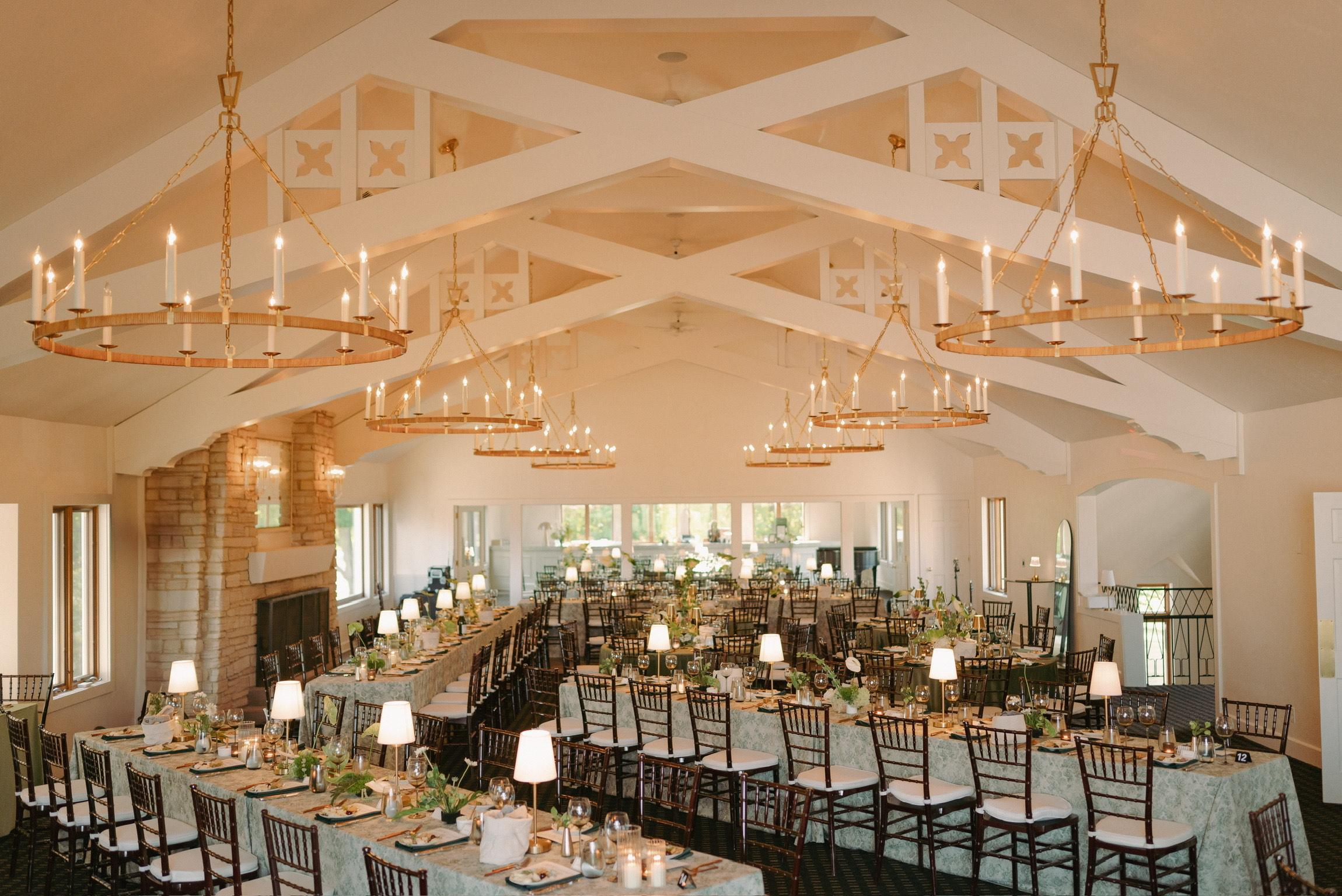 -Chandeliers with warm lighting -Stone fireplace -Bar area off to the side -Dance Floor -17 long 8 ft tables, 10 banquet 60" round tables -Silverware, flatware, and glassware for up to 200 guests -White table linens - enough for each table -200 Chiavari chairs -6 cocktail tables