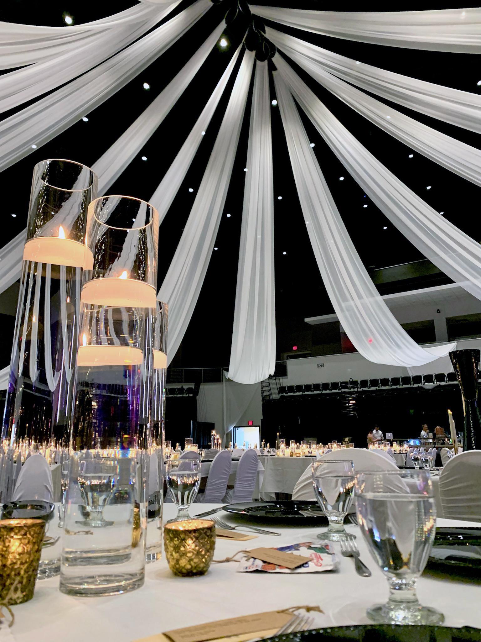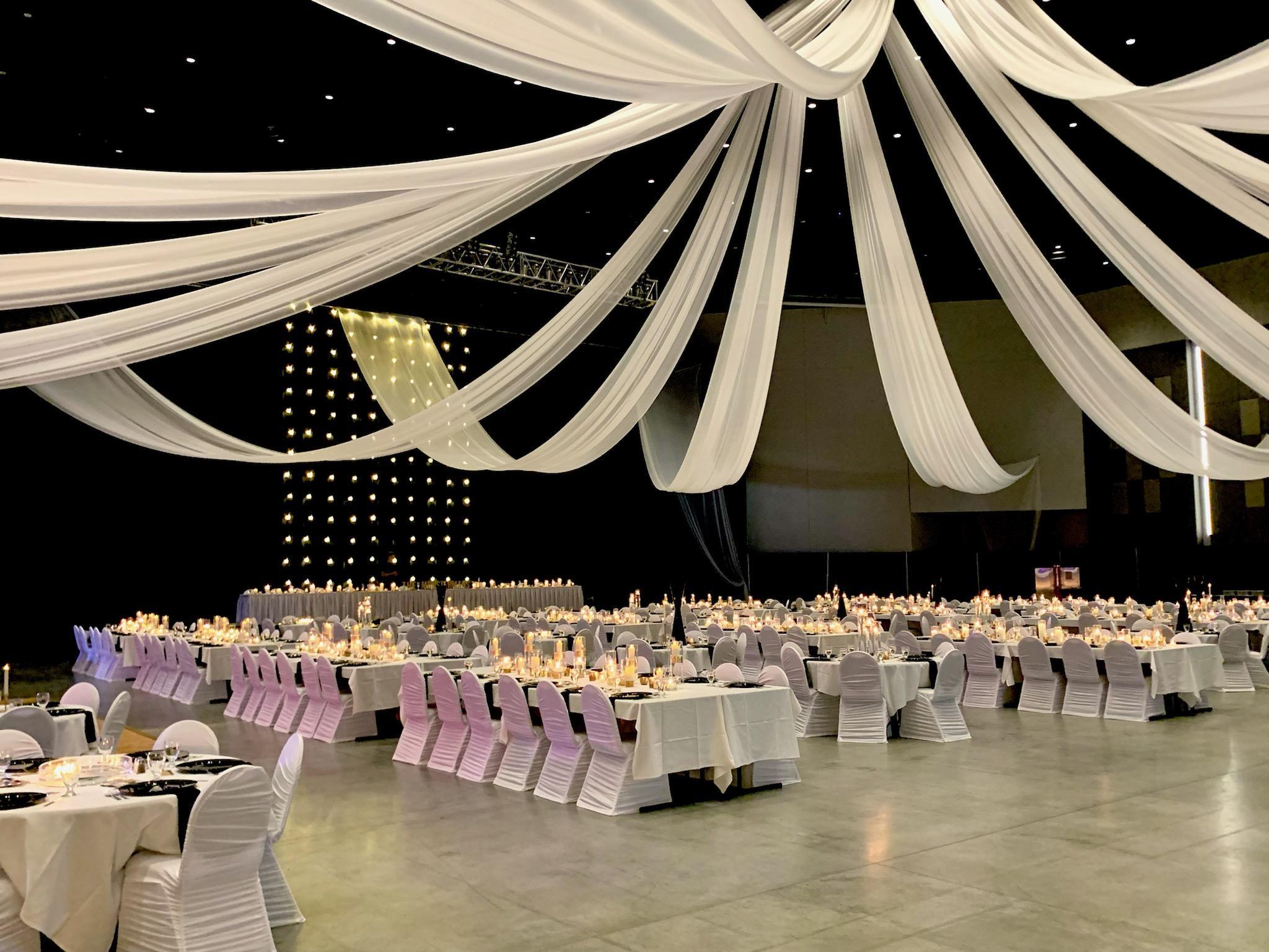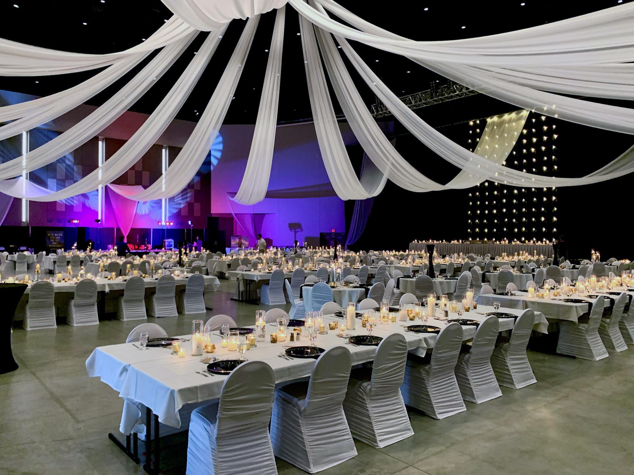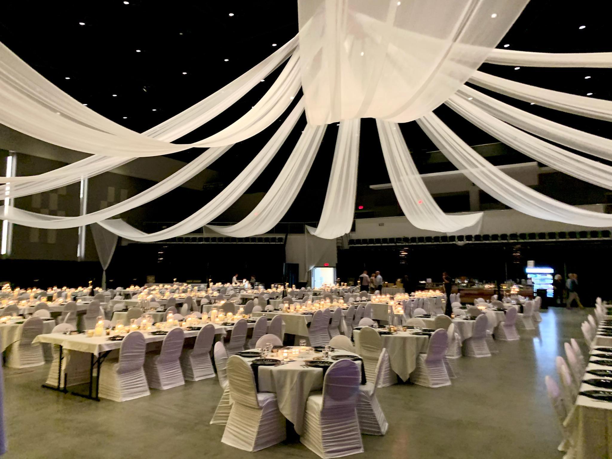 Included with the room is a choice of round, rectangle, and cabaret tables, chairs, your choice of white, black, or ivory table linens, black or gray table skirting, tableware and napkins in a variety of colors, 4 drop-down projection screens, 2 wireless handheld microphones, a customizable stage perfect for the head table, and customizable digital & static signage. Setup, tear down, & basic cleaning costs are also included.