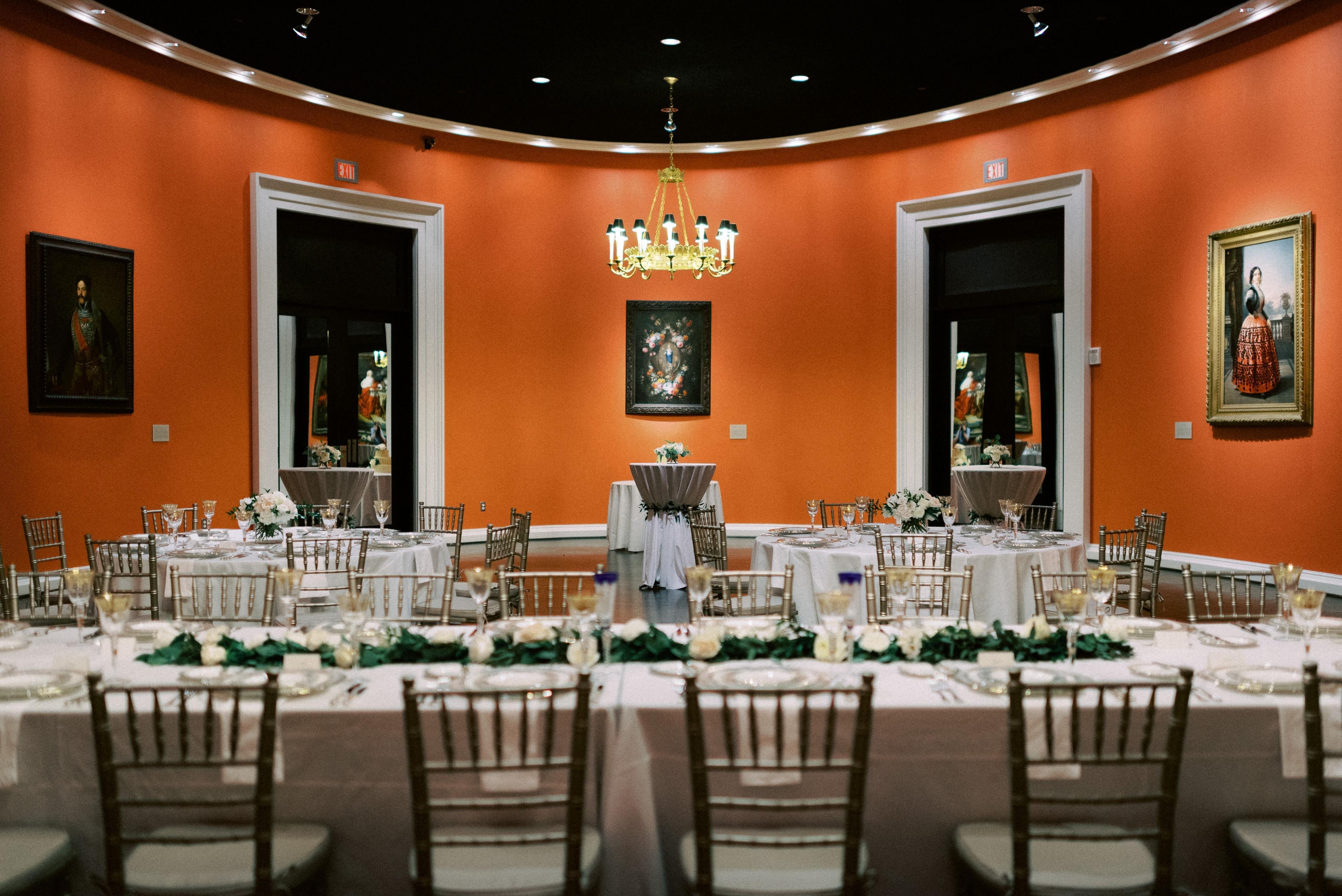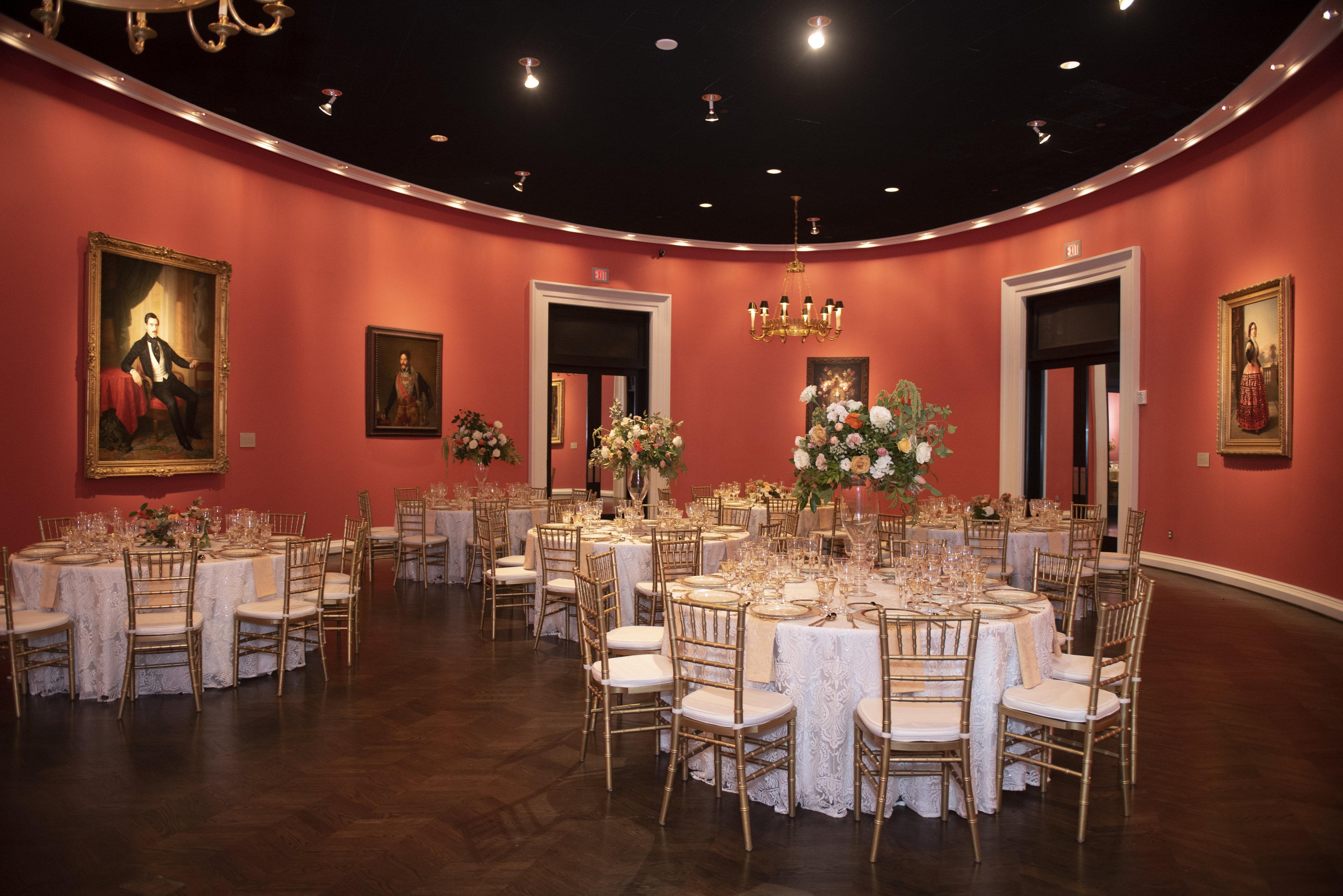 The Jones Great Hall is one of the most versatile and frequently used areas of the Meadows Museum. The oval-shaped room. painted a vibrant shade of coral and primarily hung with elegant portraits of Spanish nobility, will accommodate up to 200 guests for receptions and more than 100 for seated dinners.