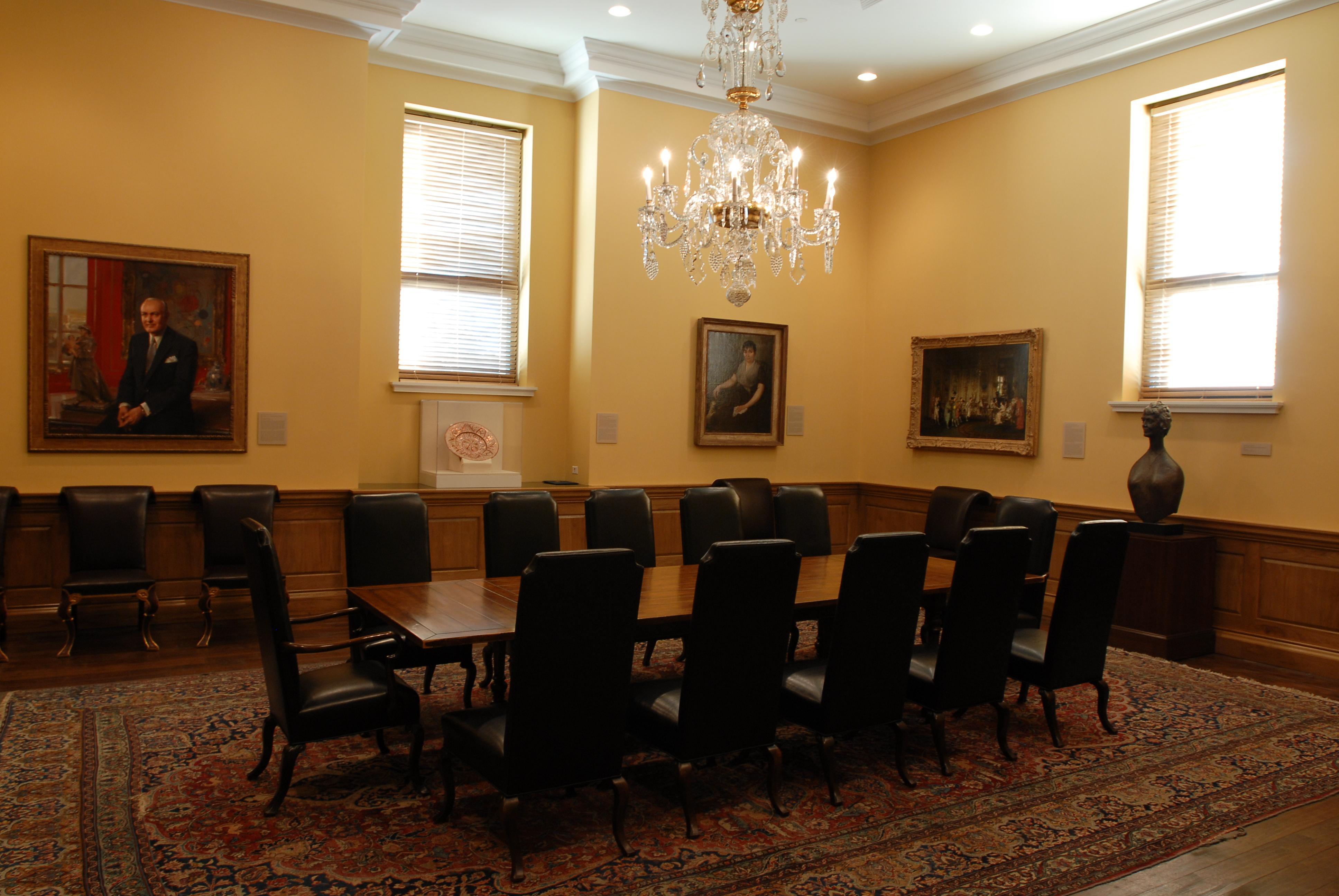 The Founder's Room is an elegant space featuring a large oak conference table that seats twelve and an 18th-century Spanish chandelier.