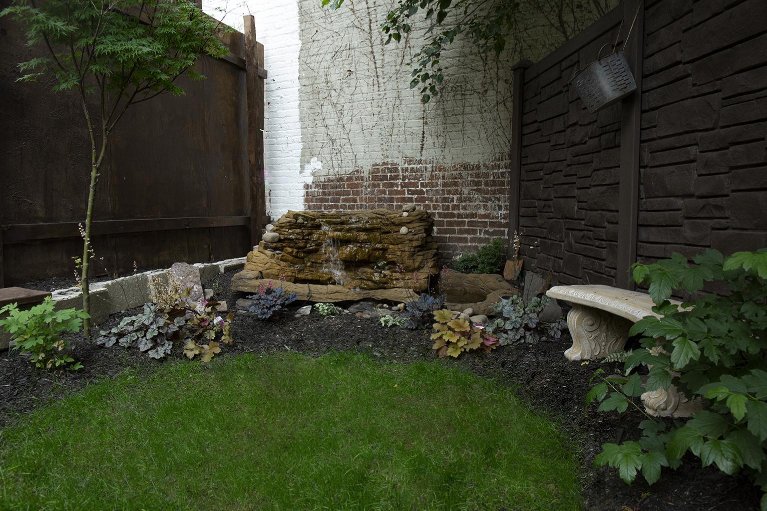 We have a bar to welcome you into the space organized with shelves, an ice bin, a fridge with microwave and tv. This leads into plenty of space with details and decor that leads all the way to the backyard which has a deck and waterfall.