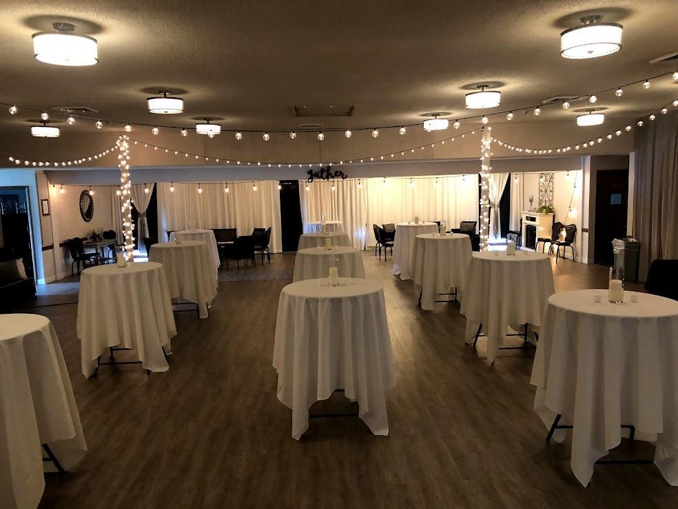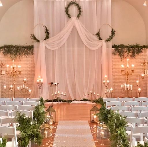 String Lights, 20-foot white sheers, Greenery, tables & chairs, free arch, additional fee Décor Rentals & Linens