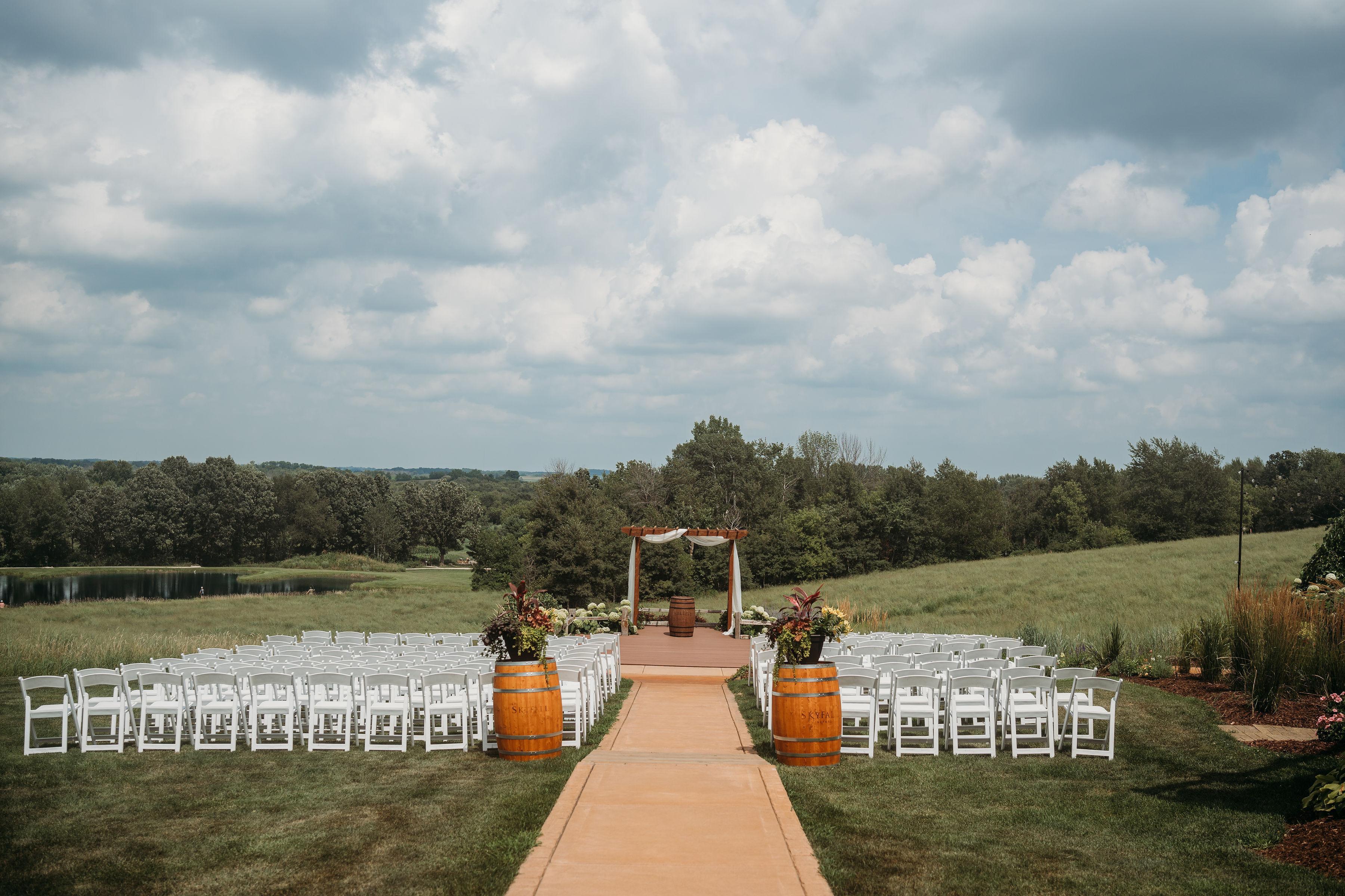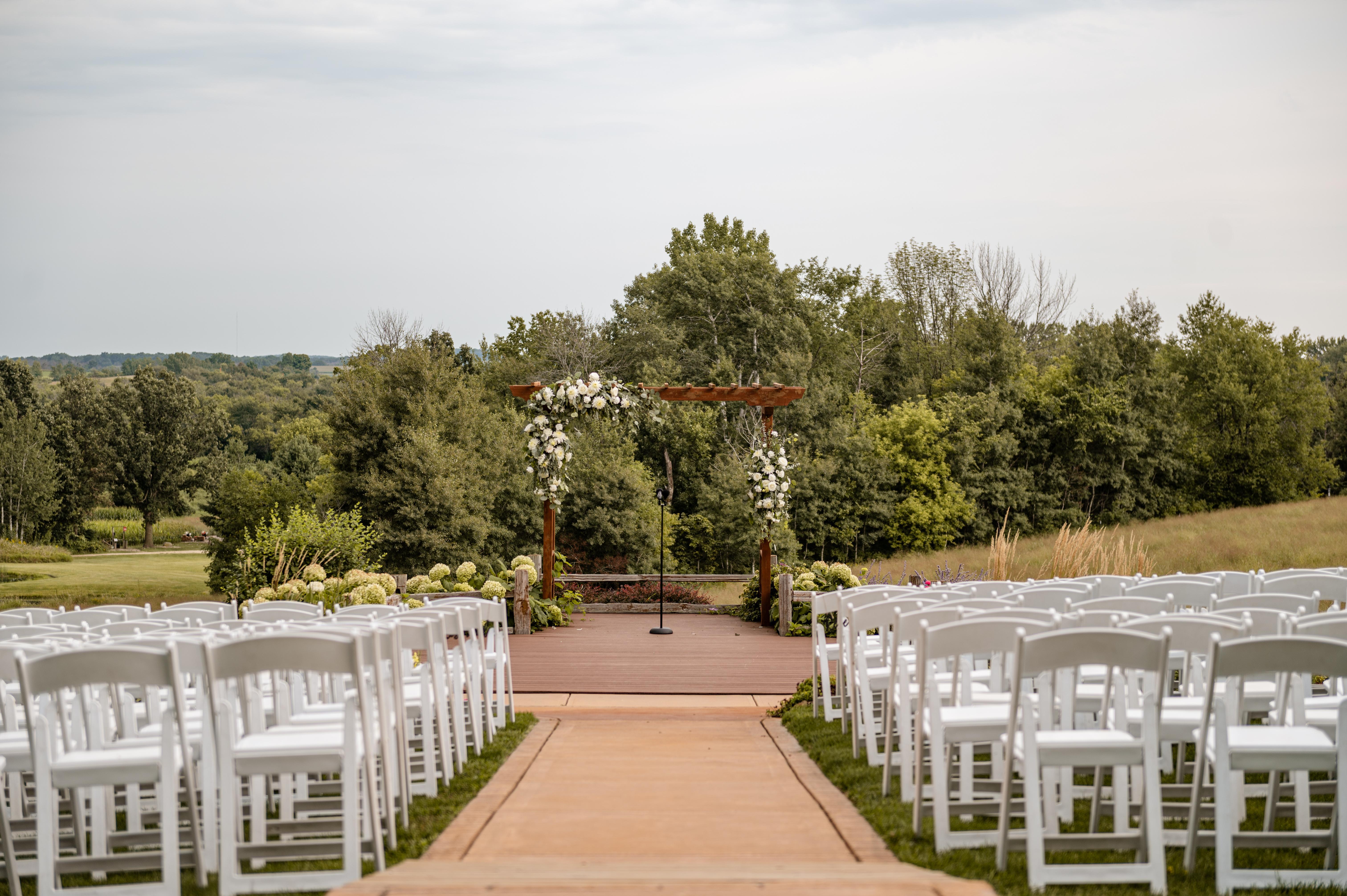 At the top of the hill overlooking our Clubhouse ceremony site, patio, pond and hunting fields, the Clubhouse is your dream wedding venue. Featuring a fully staffed wrap around bar, two fireplaces, ample deck space, our Clubhouse can comfortably accommodate large gatherings. With varying seasonal landscaping, each wedding is truly one of a kind. The Clubhouse Ceremony site NE facing is situated just outside the Clubhouse overlooking the pond and hunting fields and includes white ceremony chairs.