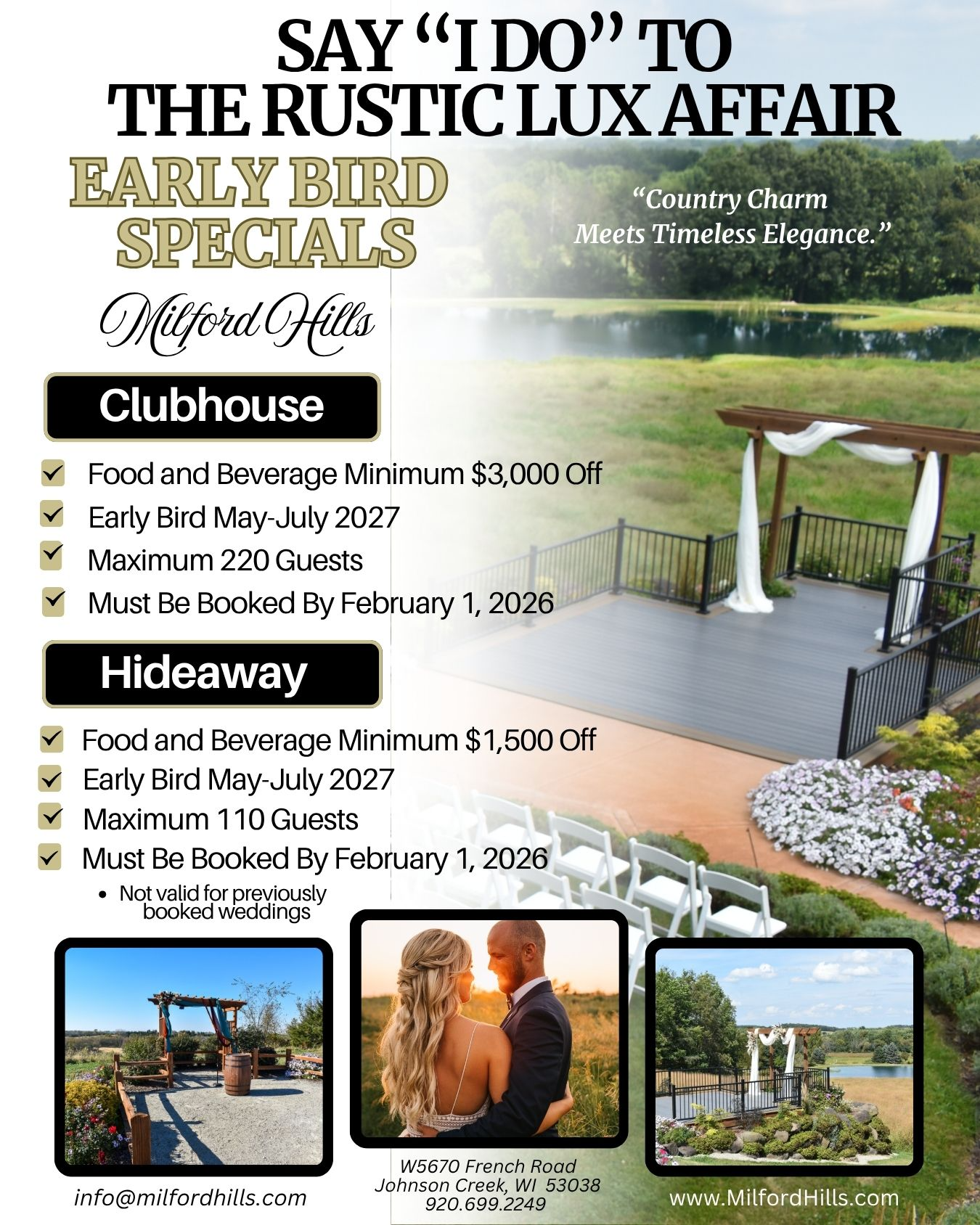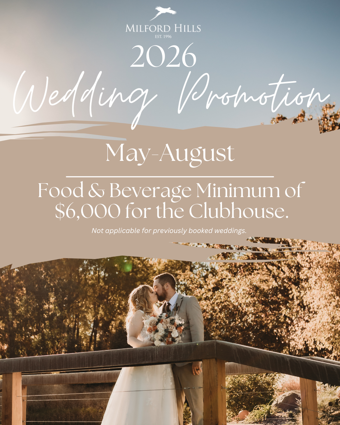 Valid on Weddings May-July of 2027. $3,000 off the Clubhouse Food & Beverage Min. and $1,500 off the Hideaway Food & Beverage Min. Must be booked by 2/1/2026. Not valid on previously booked weddings.