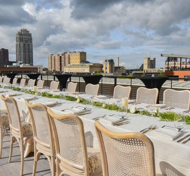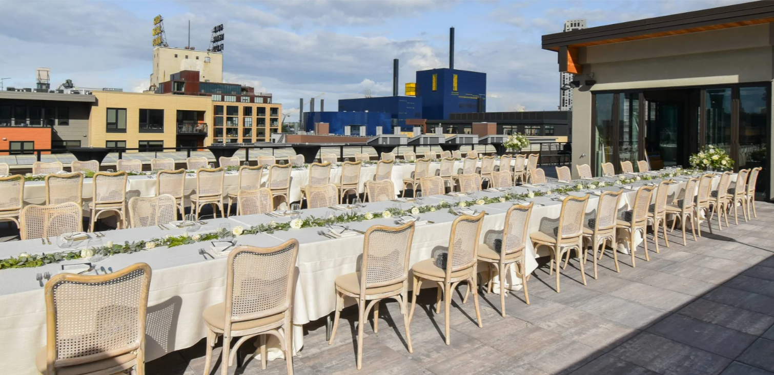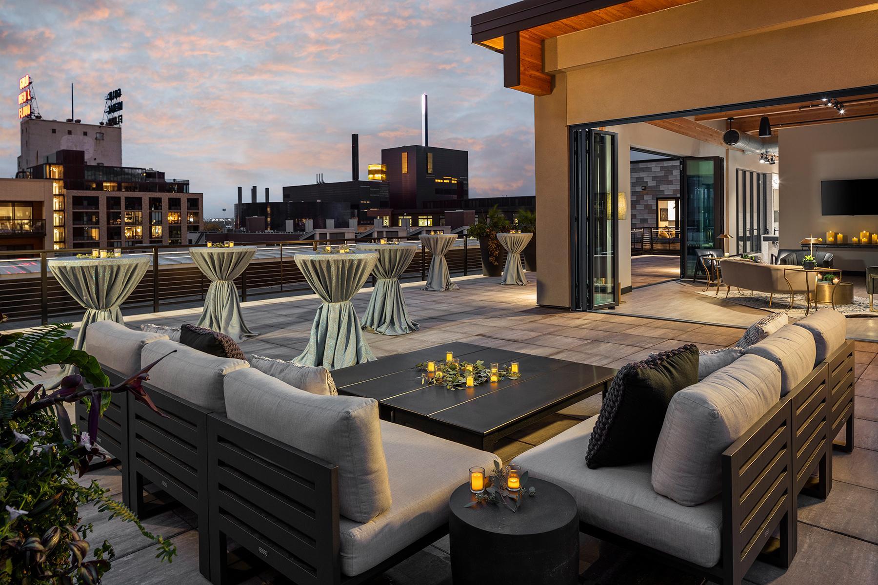 The rooftop becomes a glowing backdrop where laughter mixes with city lights, toasts are raised under the stars, and photographs capture moments against one of the most picturesque vistas in Minneapolis. With open air for dancing or mingling, plus indoor-outdoor flow for comfort and flexibility, the terrace feels both expansive and intimate. Perfect for creating a relaxed, elevated vibe that still feels personal and connected.