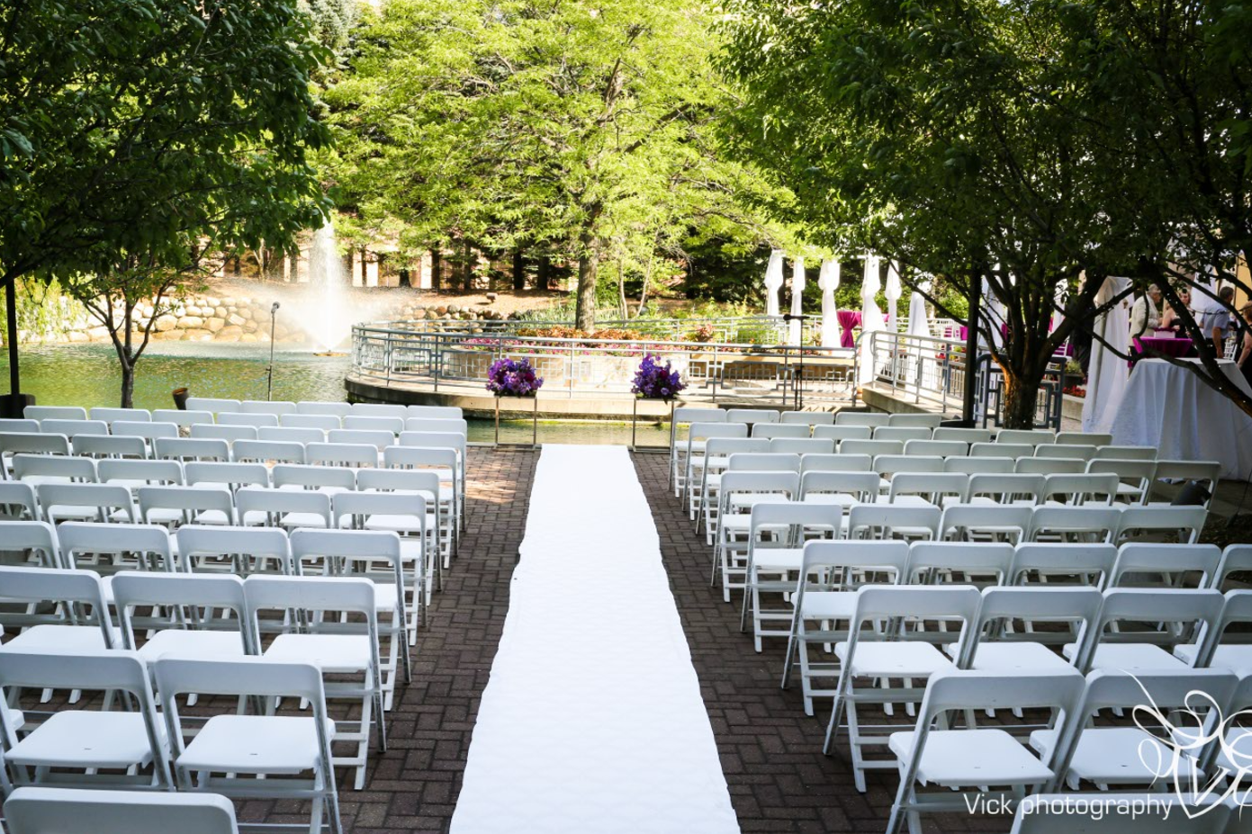 The Blue Birch Patio is a beautiful outdoor space beside a peaceful pond, offering 3,000 square feet ideal for elegant wedding ceremonies and receptions. With room for up to 250 seated guests or 400 standing, it combines natural beauty and intimacy to create a memorable setting for your celebration. Plus, a complimentary indoor ballroom is reserved as a backup, ensuring your special day goes smoothly rain or shine. Enjoy breathtaking views, flexibility, and peace of mind at the Blue Birch Patio.
