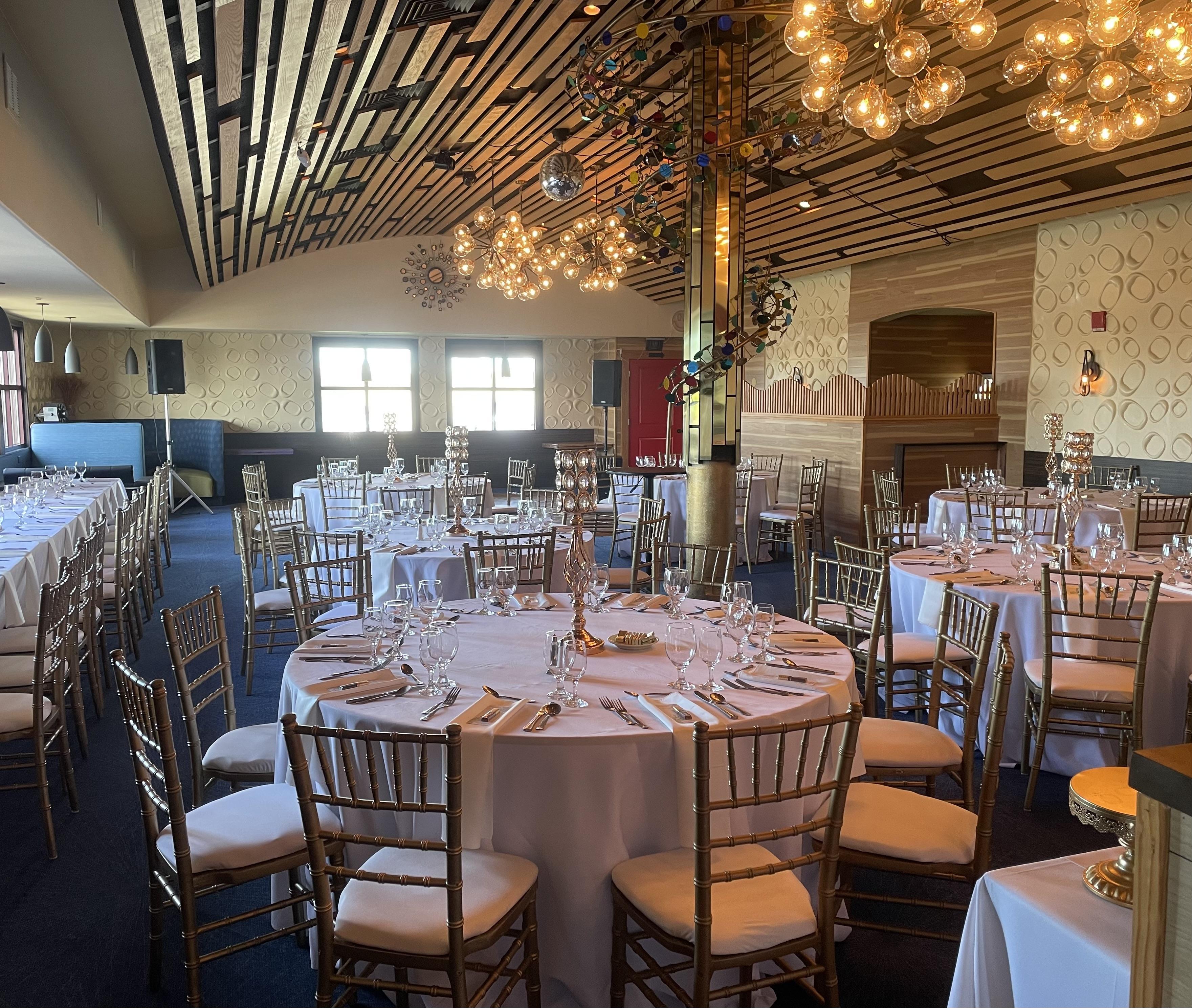 Intimate space with soft wall lighting and 3 chandeliers, dance floor and DJ stage.