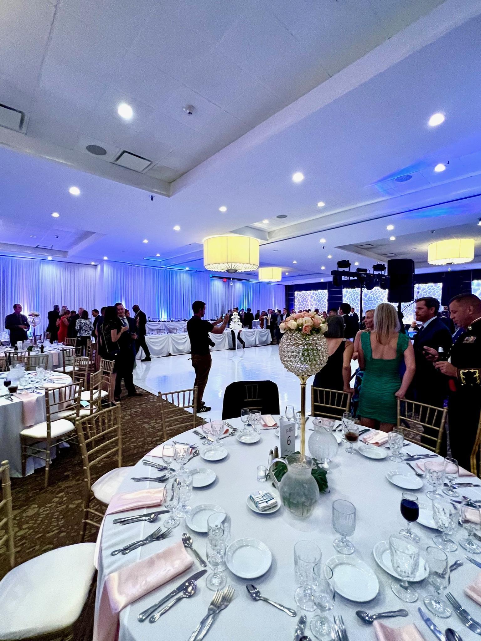 Spectacular room with lighted walls that can be color coordinated to your theme, 5 chandeliers, large dance floor.