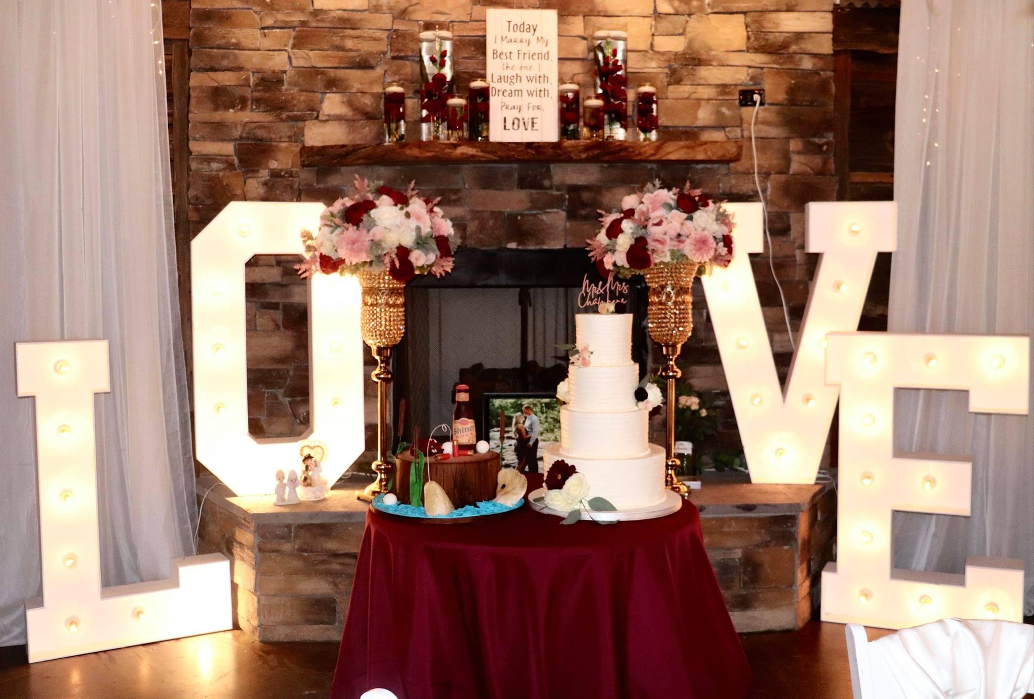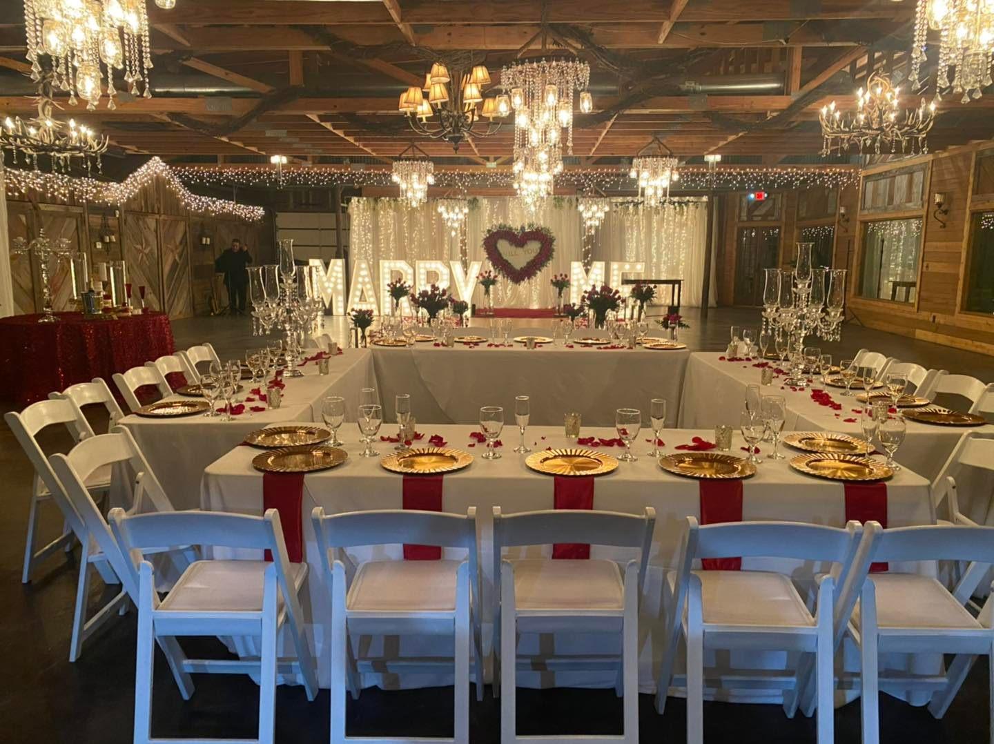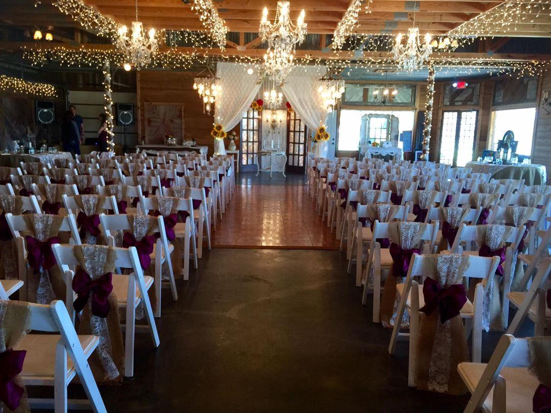 Exchange vows under the open sky or within our elegant indoor space! The reception area features a charming gazebo, A/C, heat, a cozy gas fireplace, and stunning chandeliers. For your convenience, we offer a fully equipped kitchen and an oak bar. Enjoy the natural beauty of our 27 private acres, adorned with majestic oak trees, or take advantage of our indoor space for dancing and dining.