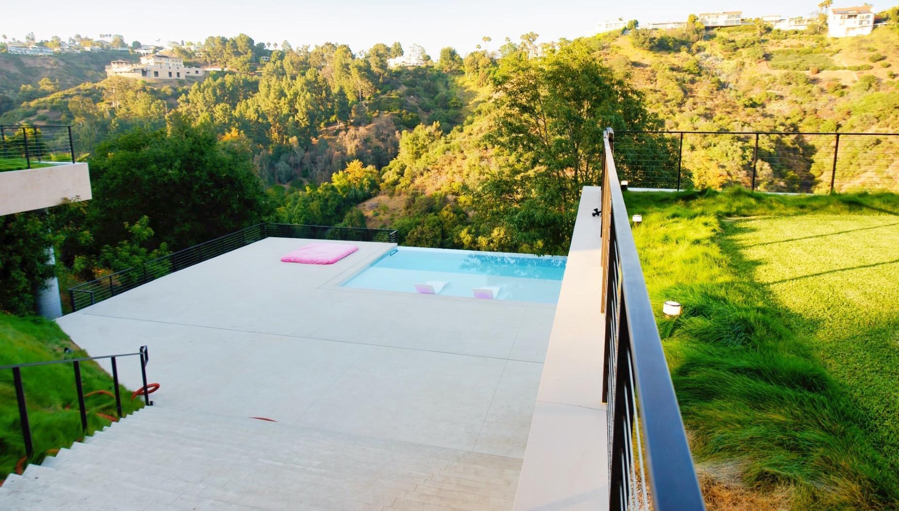 A sleek pavilion overlooking a sparkling infinity-edge pool, where water seems to spill into the canyon below. This stylish space is perfect for cocktail hours, lounge seating, or sunset photos, with panoramic views that stretch from lush hillsides to the glittering Downtown LA skyline.