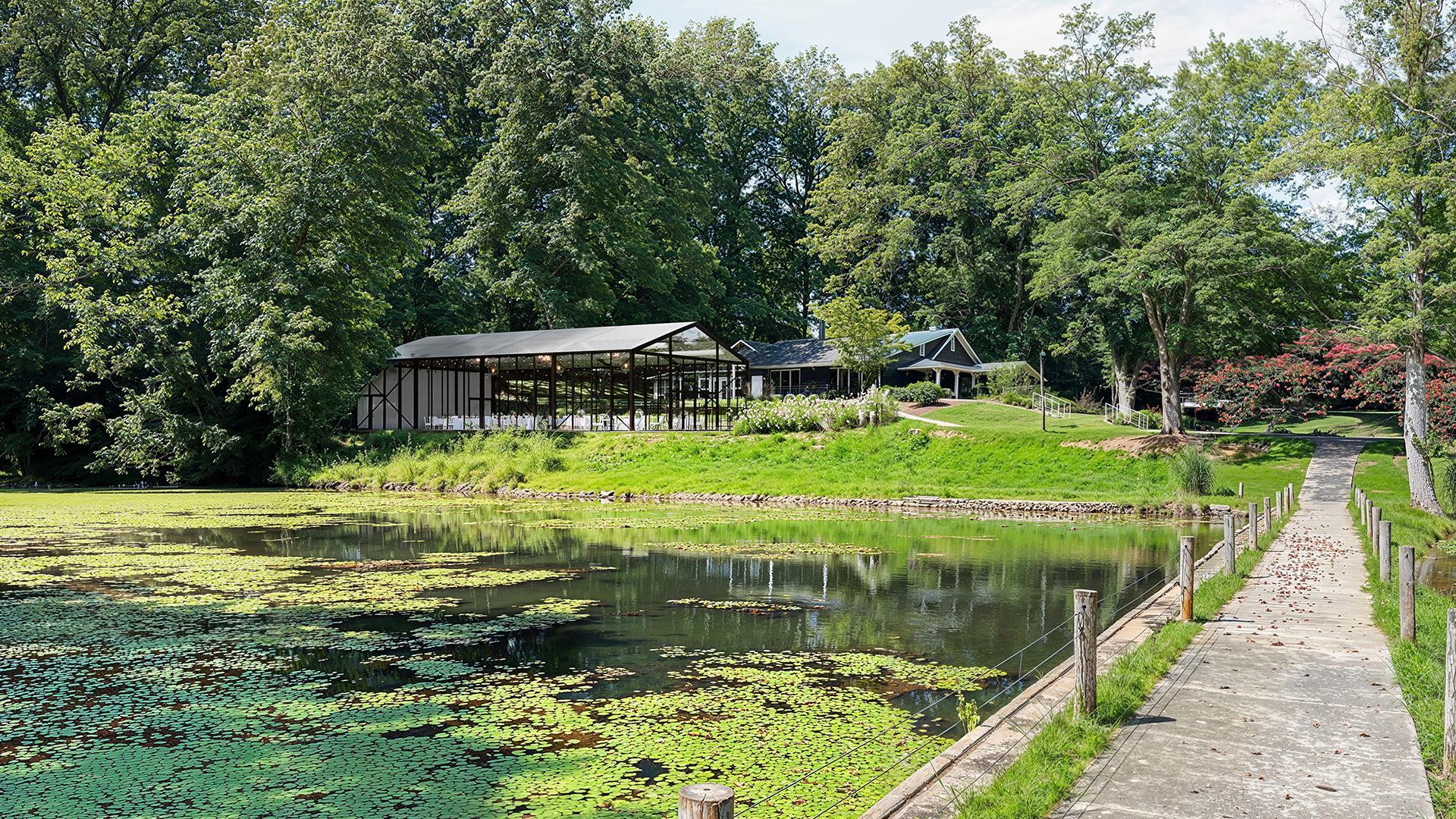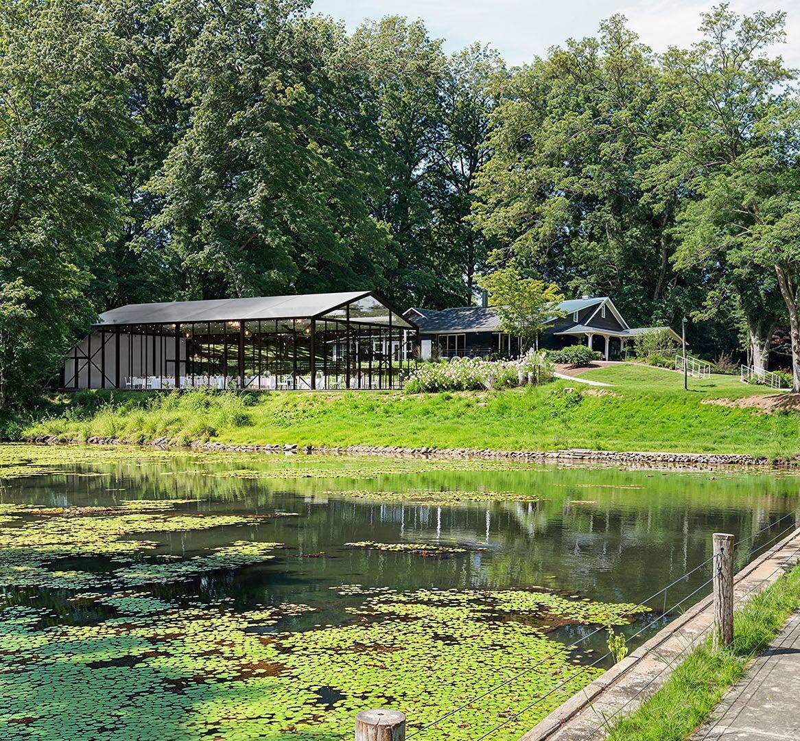 The Twin Lakes Pavilion is a stunning architectural showcase, featuring a dramatic black steel and glass structure that floats above the lily pad-dotted lake. This contemporary greenhouse-inspired space is adorned with crystal chandeliers and romantic bistro lighting, creating an ethereal ambiance. Floor-to-ceiling glass walls provide panoramic views of the serene lake and woodland, while ornamental grasses create a natural transition between the modern structure and its organic setting.