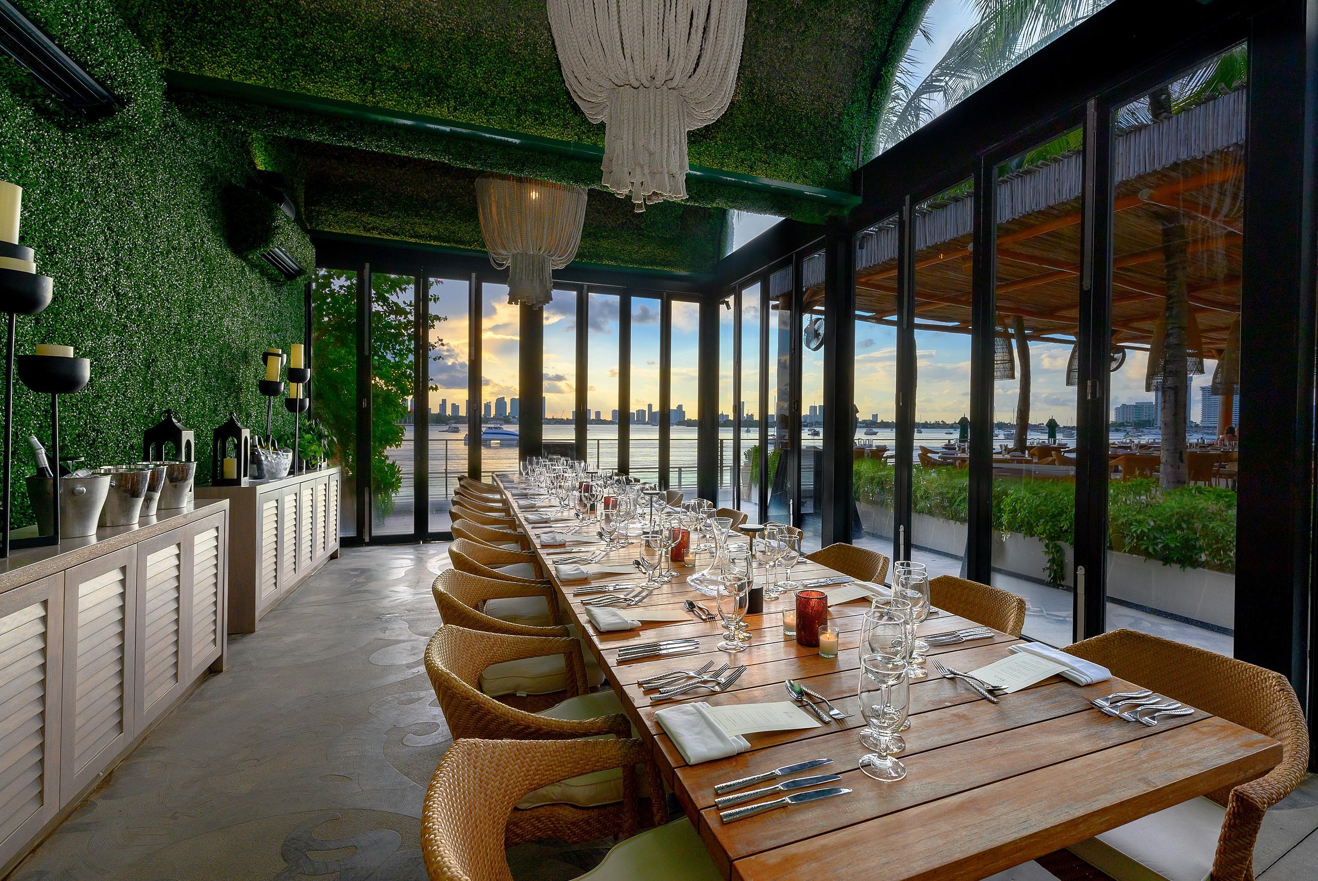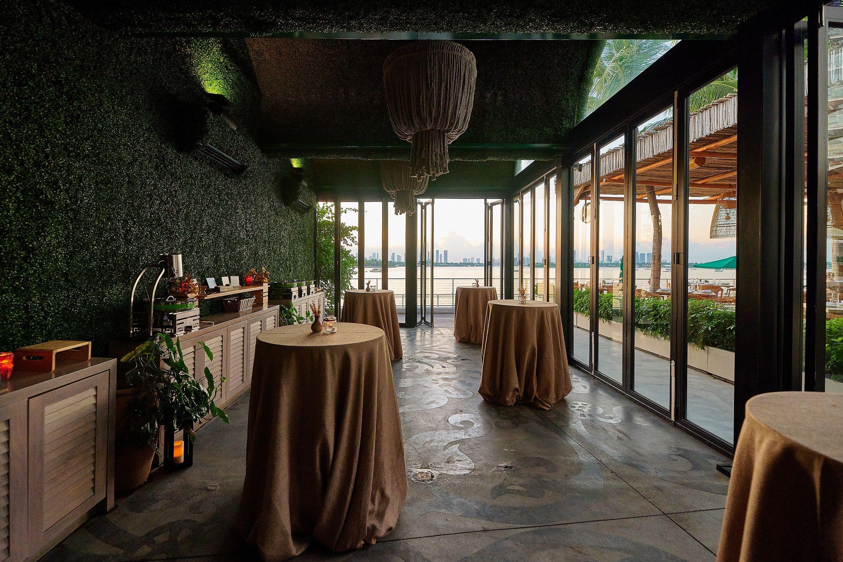 Baia Restaurant features an indoor dining room with sliding glass doors to the open air, and an outdoor terrace. The venue can be booked together for seated gatherings of up to 85 guests combined, or standing receptions of up to 100 combined.