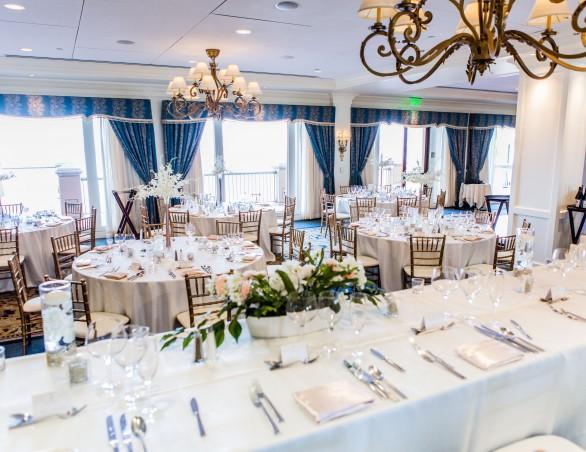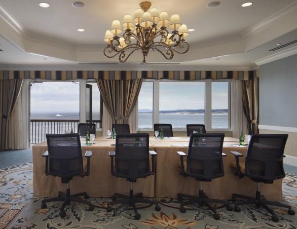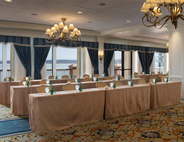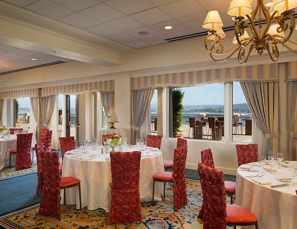 This ballroom has a spectacular view of the dolphins fountain and Monterey Bay. The gorgeous décor is inspired by the outdoor atmosphere, filling the room with coastal colors of aqua, deep marine blues, greens and sun-filled golds.