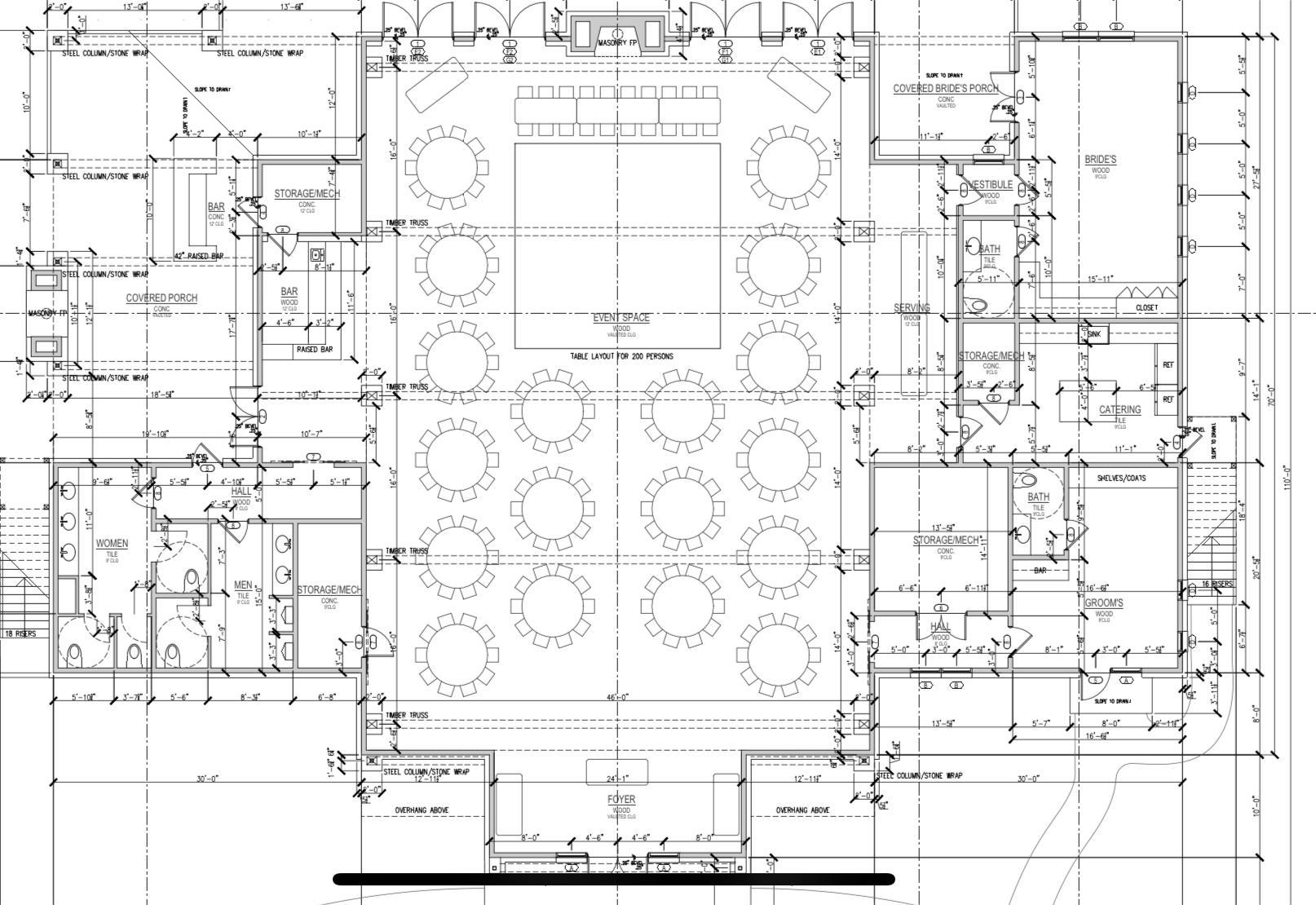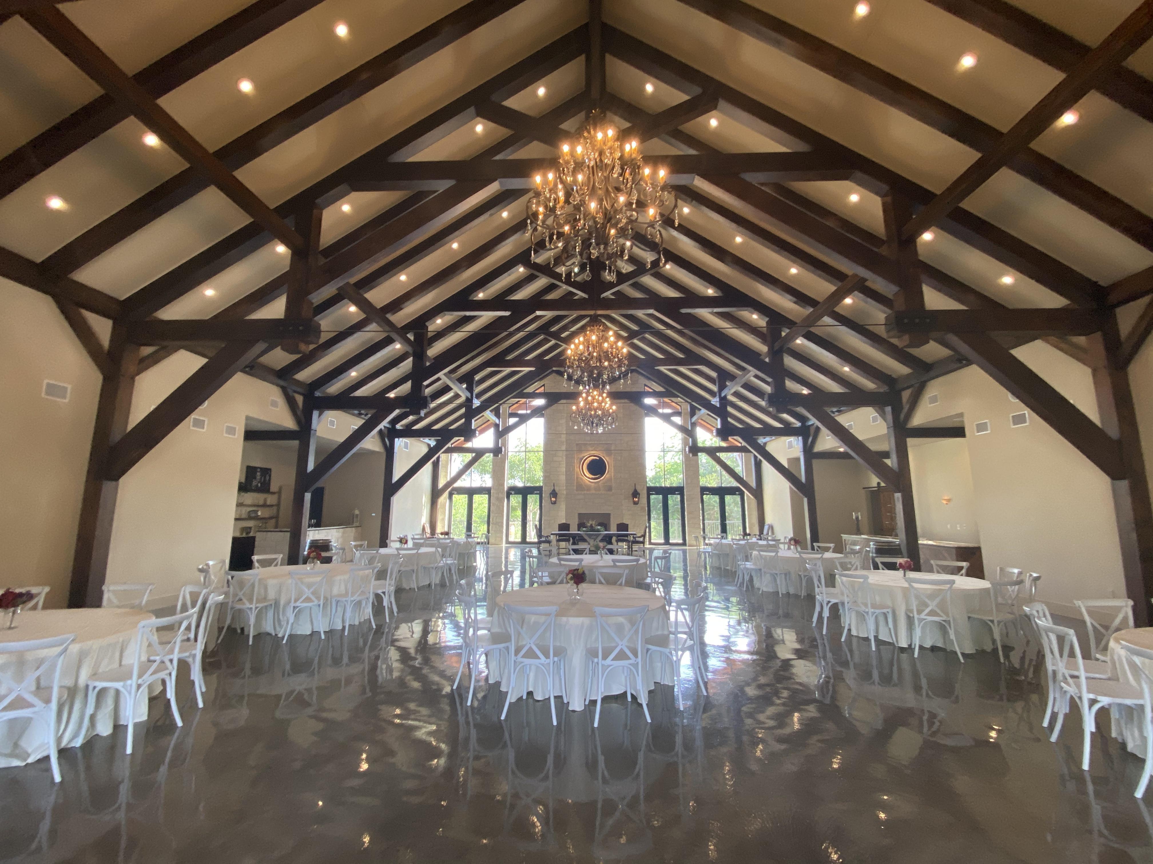 The main room in our lodge is 4000sqft, and will accommodate 200 people at round tables, along with a dance floor in the center. It has both indoor and outdoor bar areas and a buffet serving area next to the catering kitchen. It also has both bride and groom suites for ceremony preparations. There are both indoor and outdoor fireplaces and an outdoor covered patio area overlooking the creek.