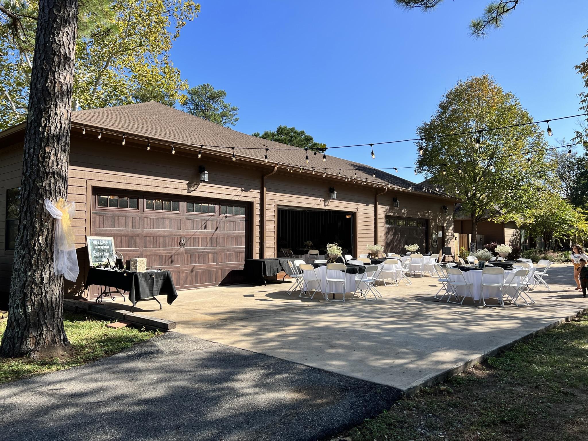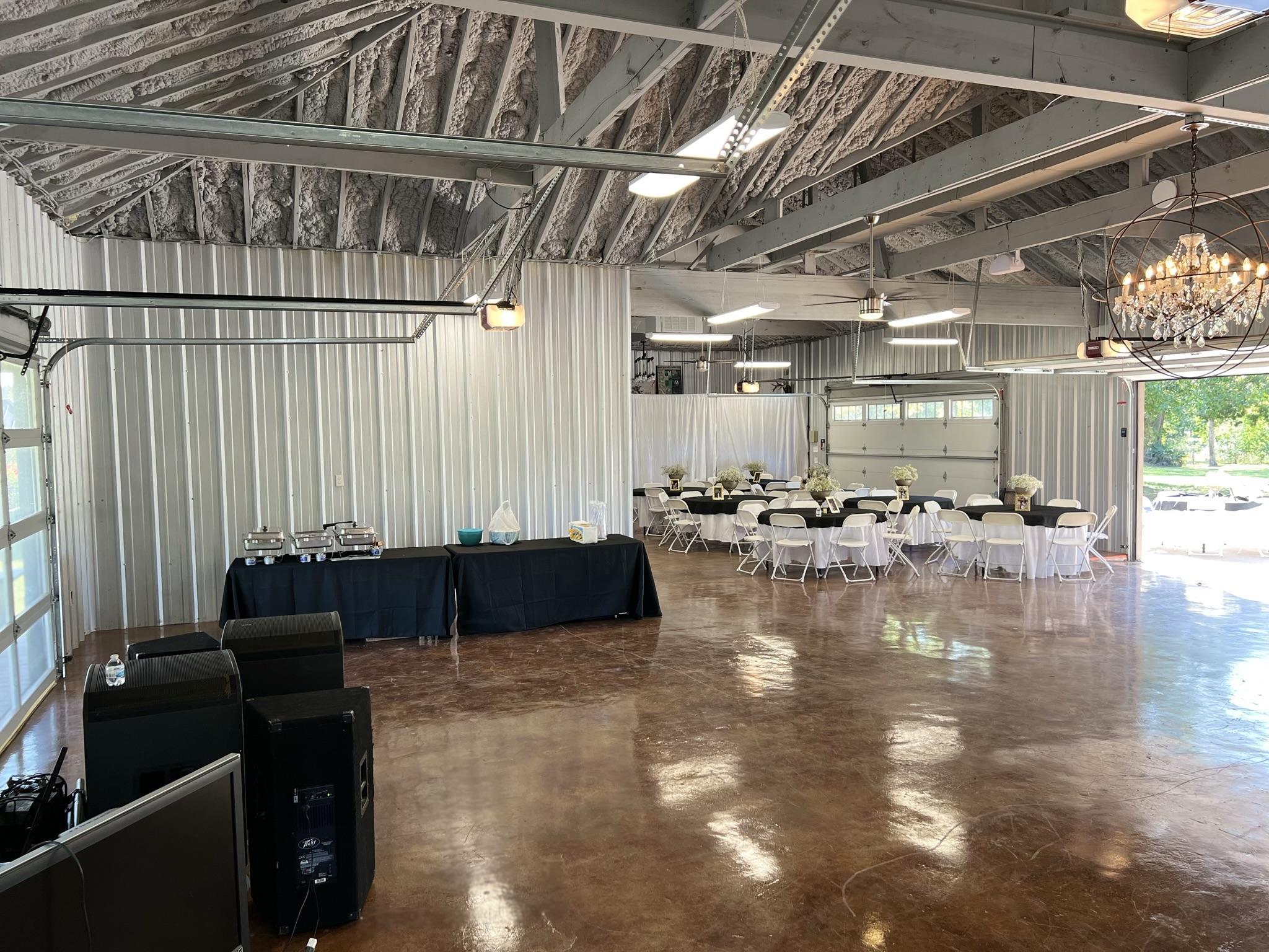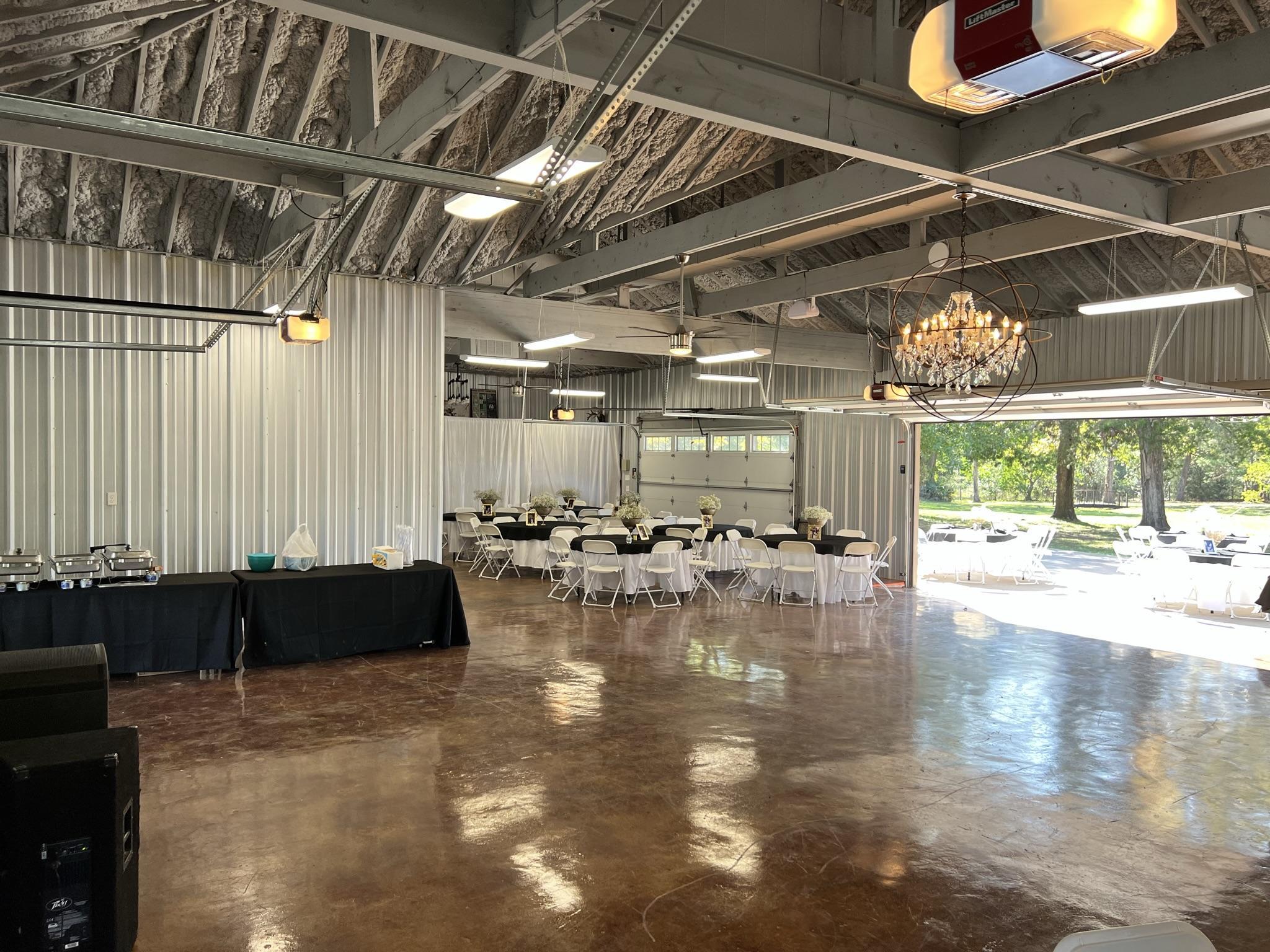 A large, air-conditioned space with a large patio attached to the back. There are three garage doors to lift when you need more space or just when the weather is feeling nice.