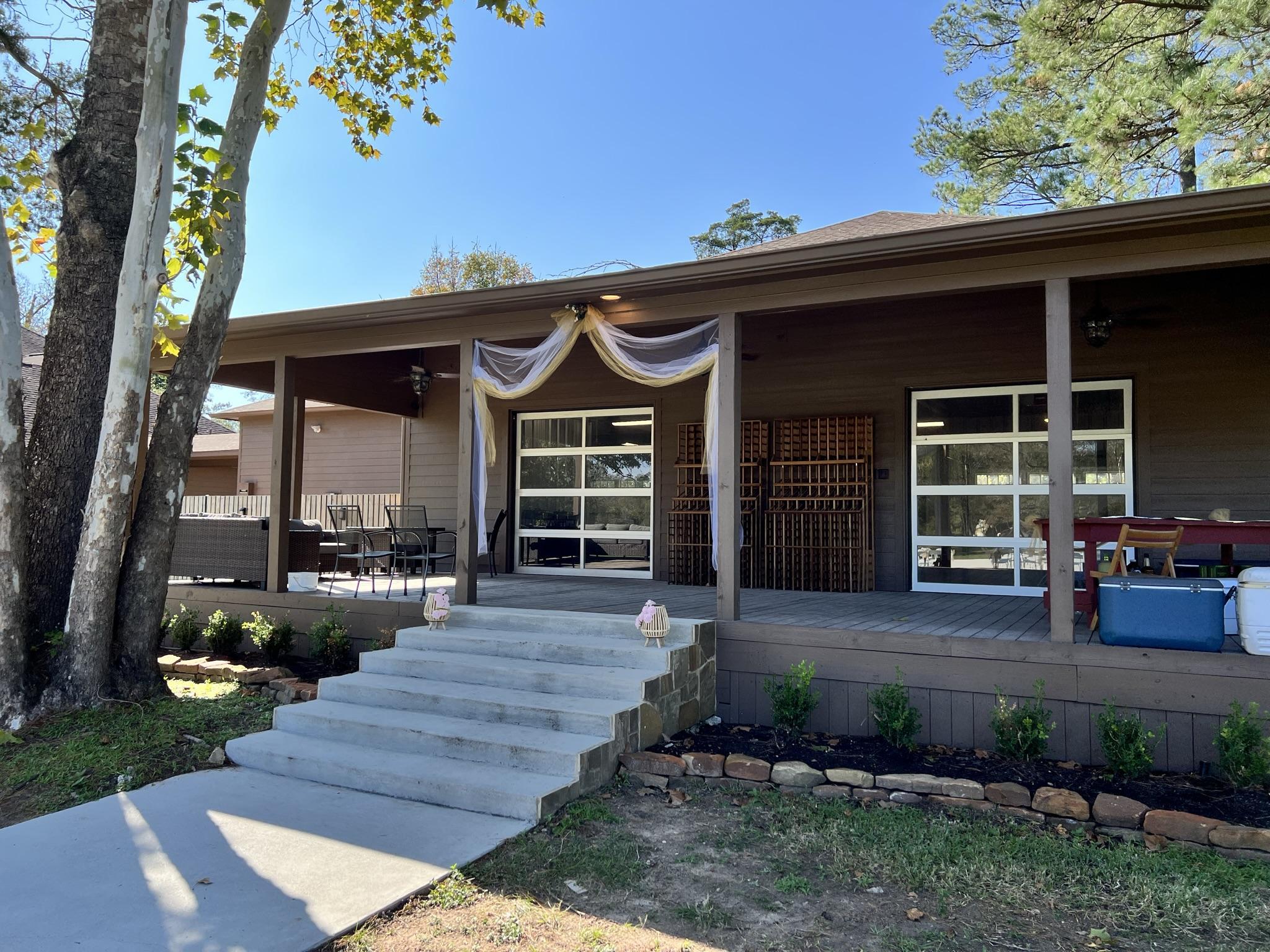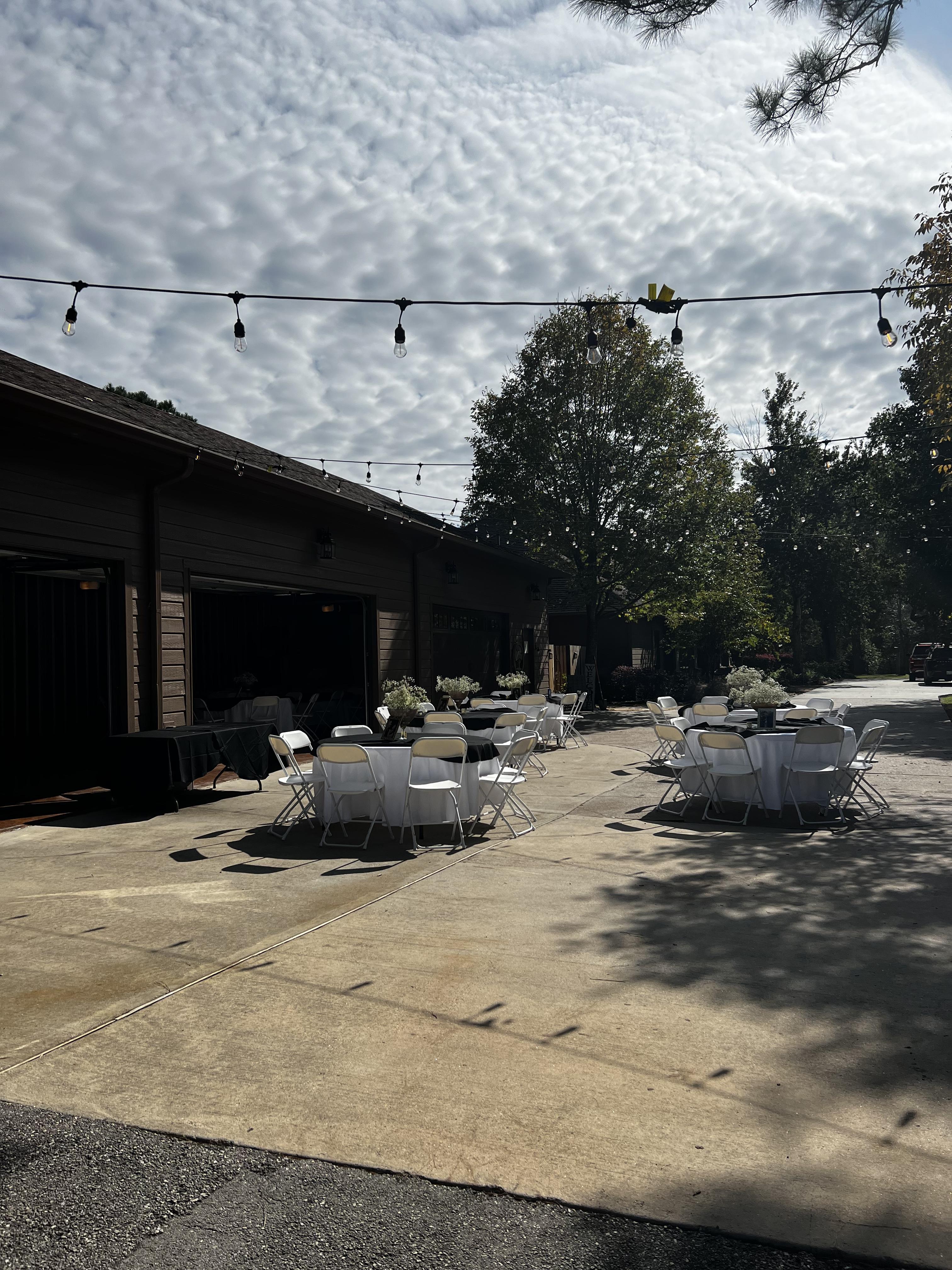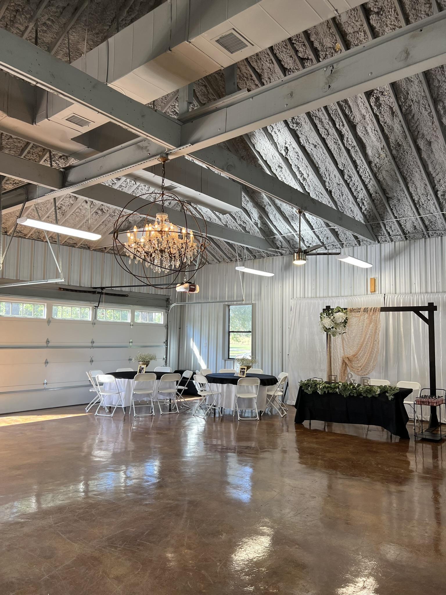 A large, air-conditioned space with a large patio attached to the back. There are three garage doors to lift when you need more space or just when the weather is feeling nice.