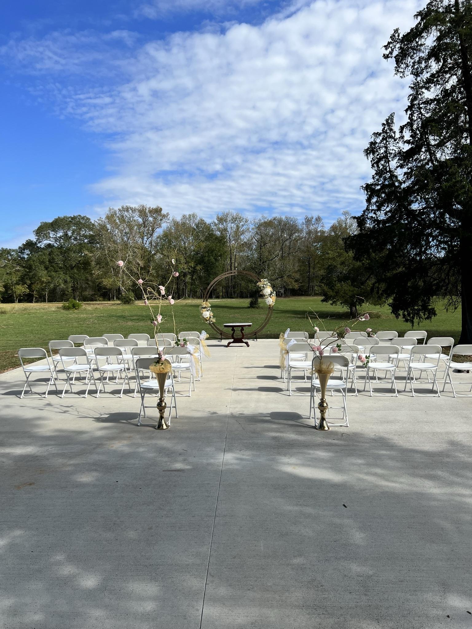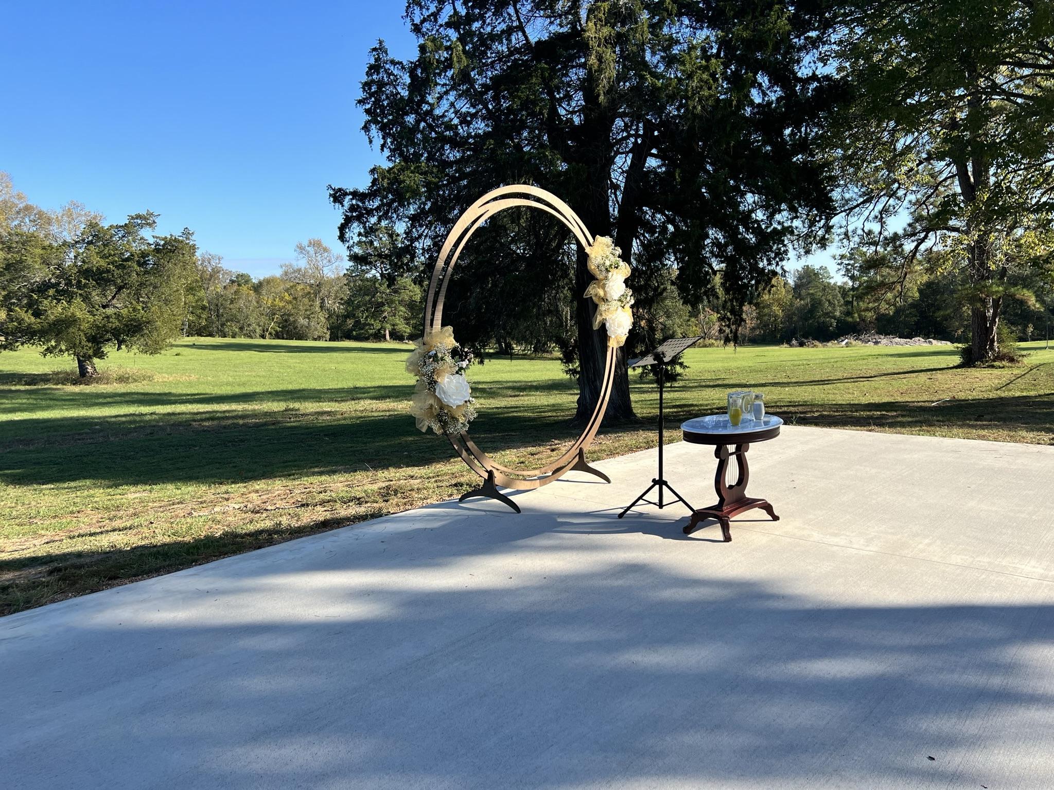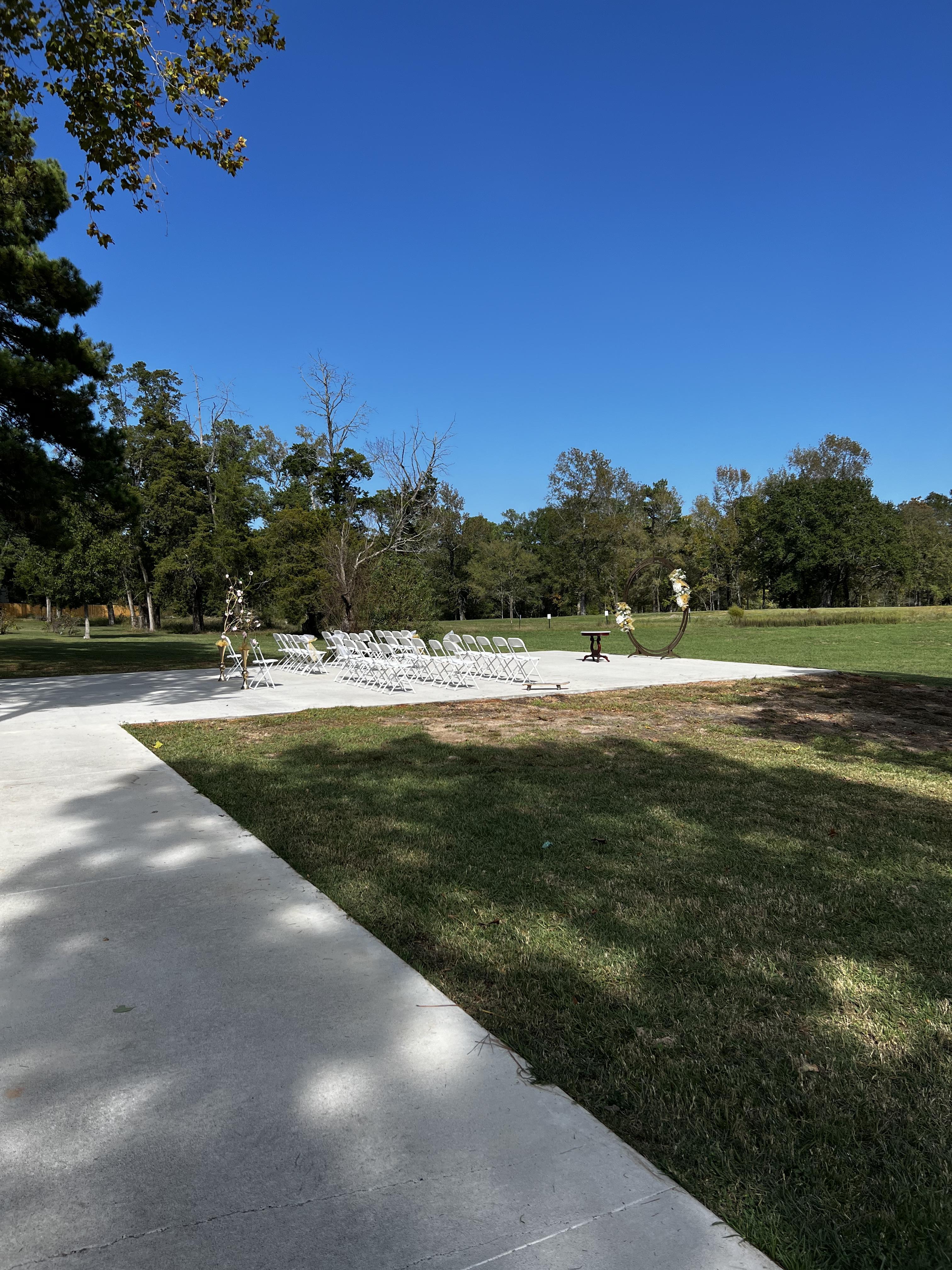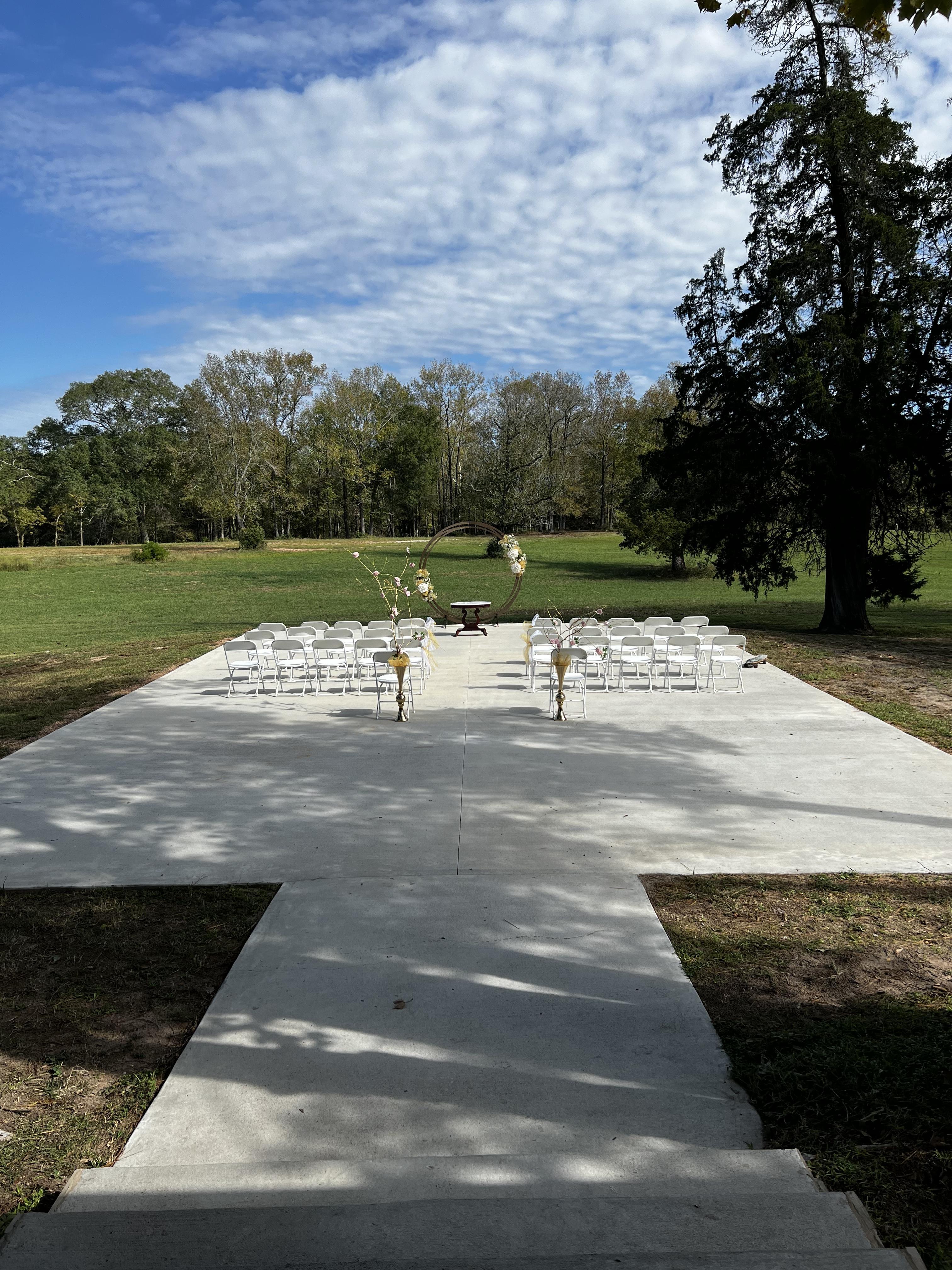 Moondance Weddings and Events is a relaxed and casual space. We are on a 60 acre ranch that has a house, very spacious garage, and lots of outdoor space. The garage, where most couples book, is fully done with air conditioning for those hot Texas days. It is attached to where most ceremonies are held. The concrete walkway and area overlooks the property to make sure your wedding photos are beautiful, nature-filled shots. We can host up to 200 guests, so we are best for small weddings. We are also a raw venue, meaning we only offer the space and nothing else.