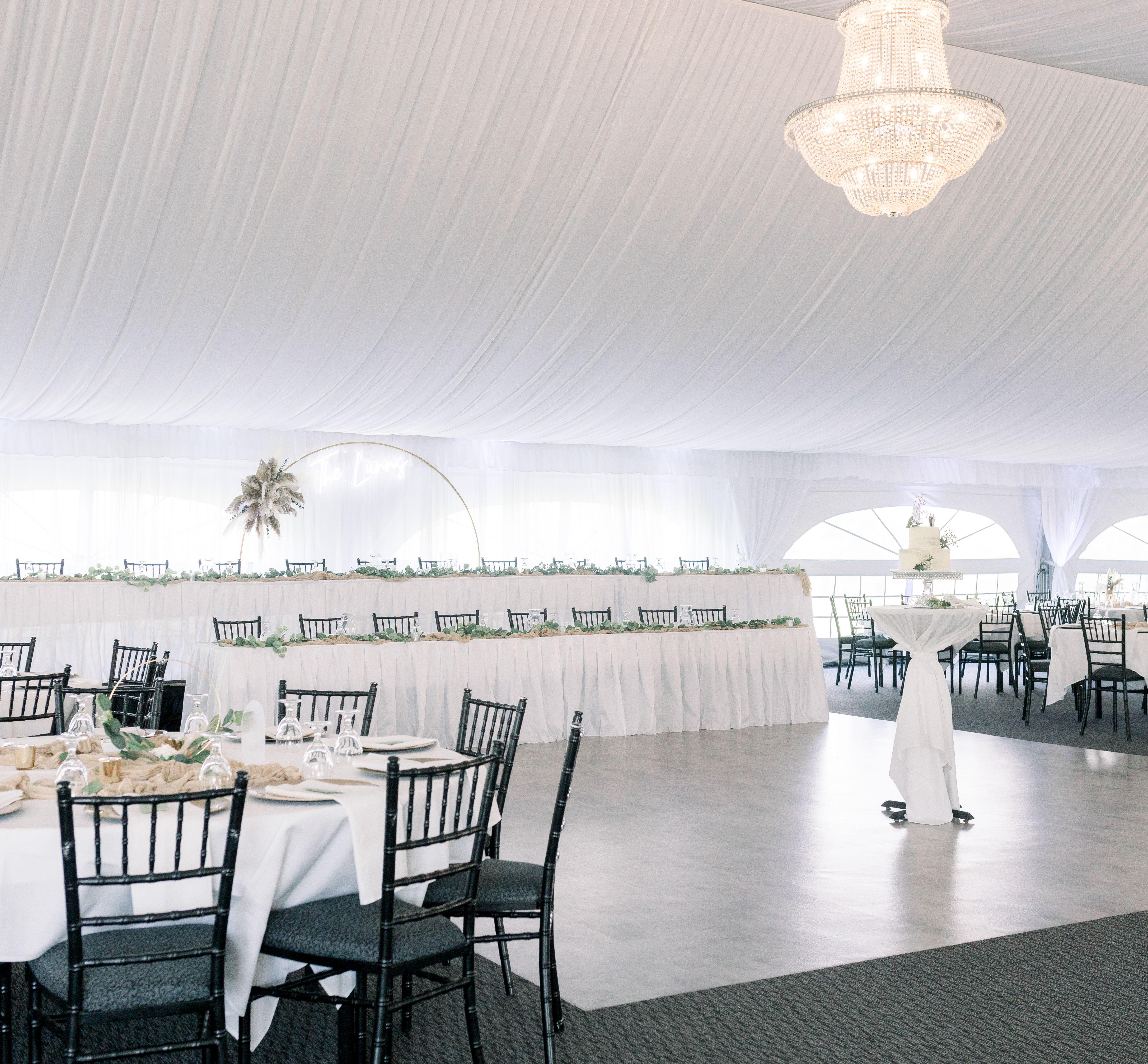 Our banquet tent is an all season indoor tent with ceiling tapestries, chandeliers, and dance floor.