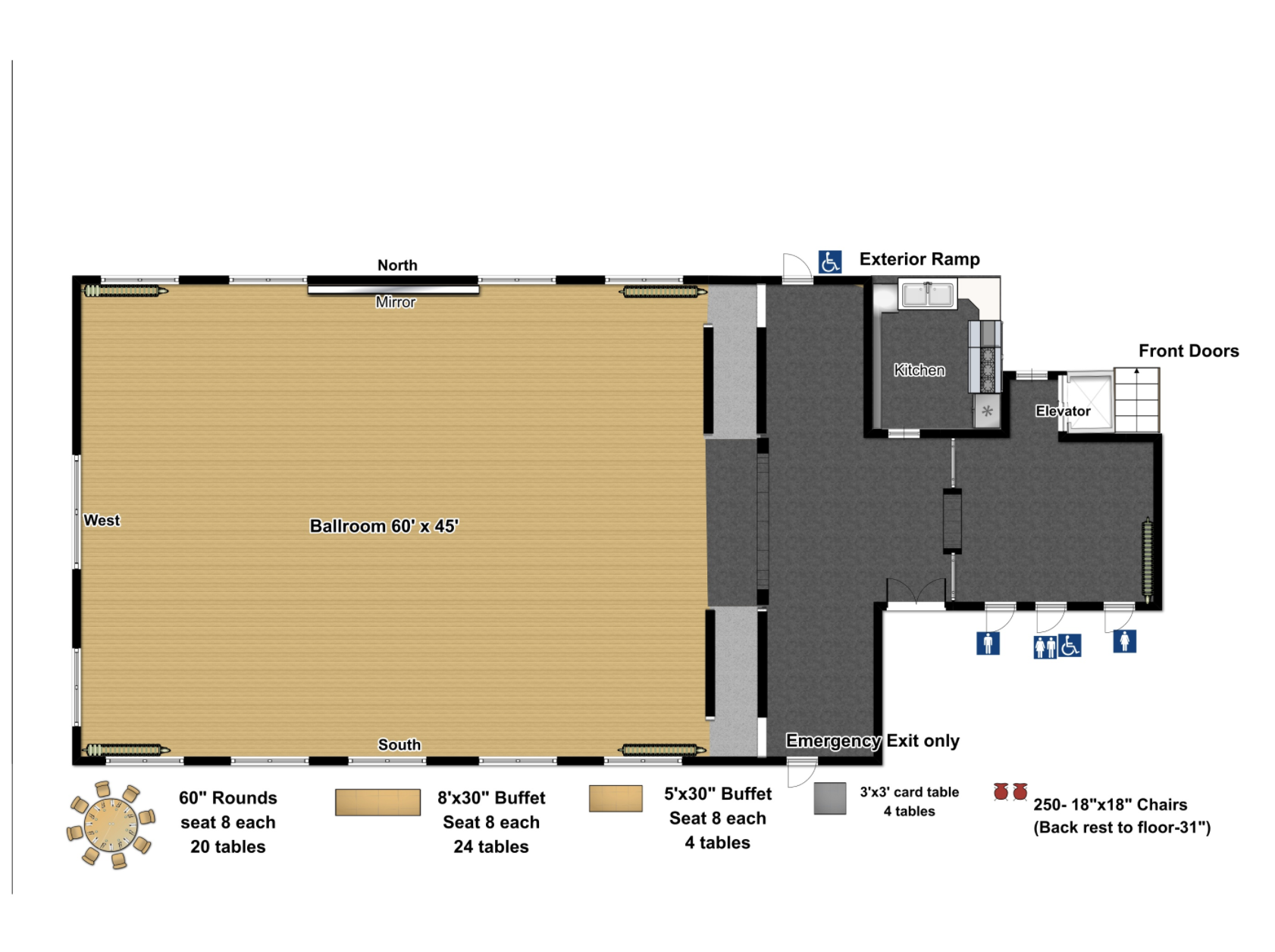 The Ballroom is 44.5 ft by 61 feet (2715 sq ft). Capacity in the Ballroom is 250 standing or chairs only. Seated capacity for dining is 160. The Ballroom includes a full kitchen.
