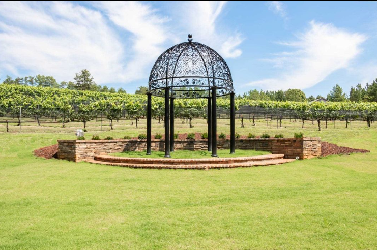 In Victoria Meadows, you'll find our custom-made arbor that sits on nine-foot-tall columns gracing the center of the outdoor platform, which acts as the centerpiece of many wine tastings, weddings, and events. The arbor features handcrafted hearts and grapes as it soars more than 20 feet above the lawn in an area secluded among the vines.
