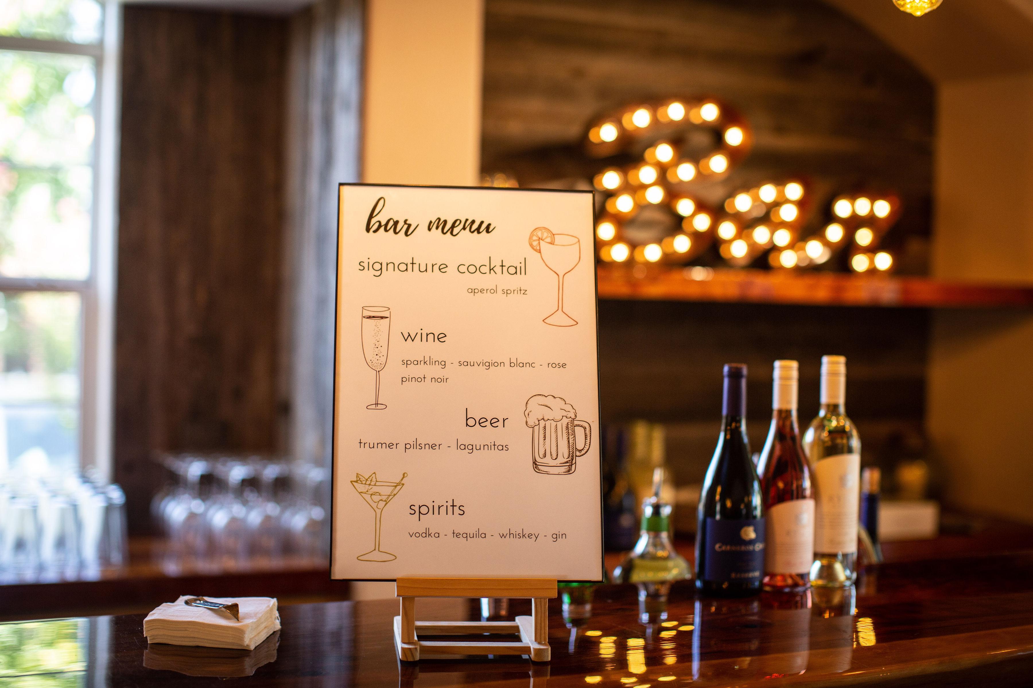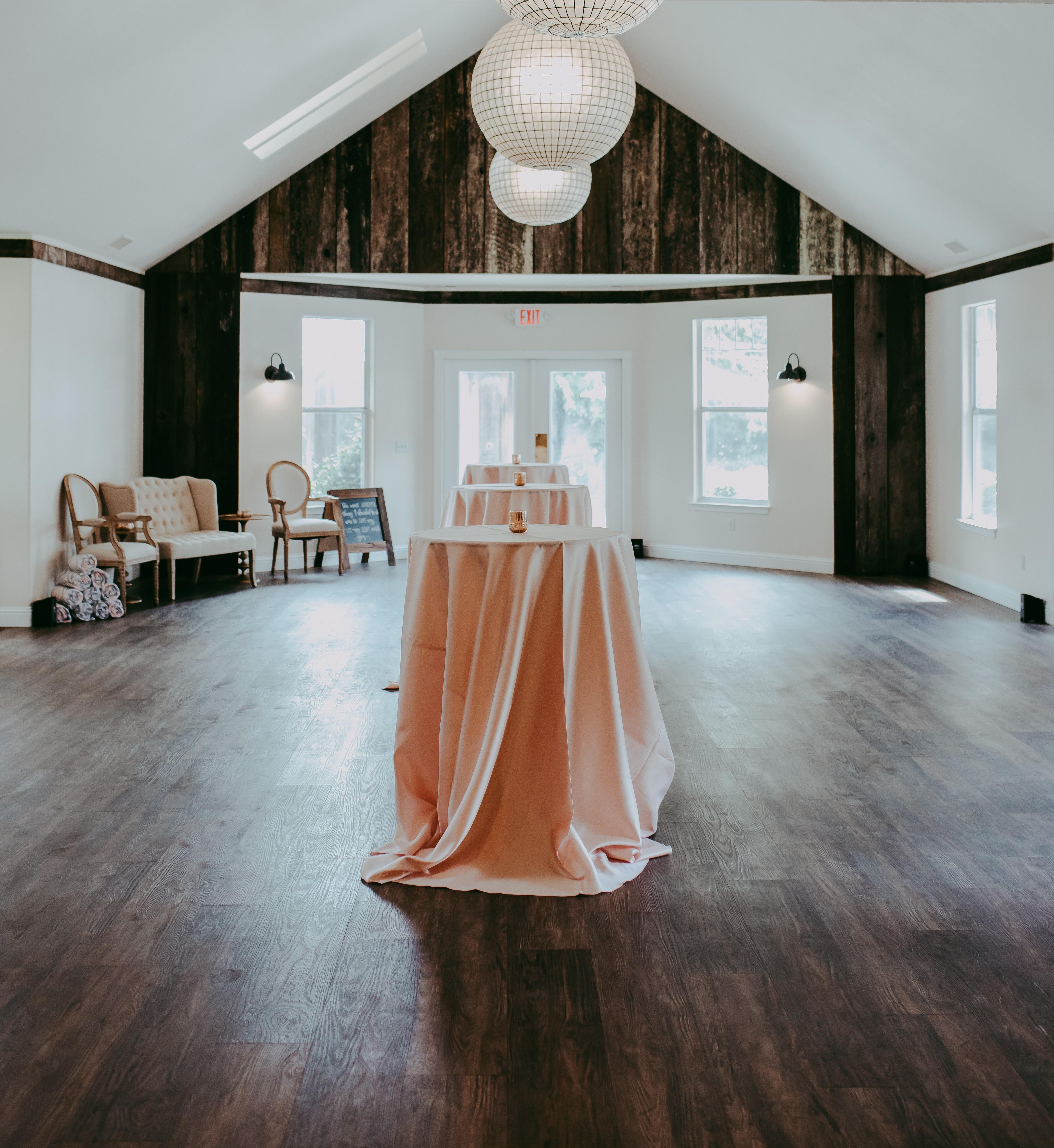 The bar features two live-edge redwood bar tops, the longest of which is 21'. The barrel ceiling and barrel staves on the front of the bar, along with the rustic lighting make our bar something special. It opens directly into the ballroom, which is tastefully accentuated with vintage barnwood that is historic to the property. Seated in chairs, there's enough room for 250 people. Seated at tables for dinner, the ballroom will accommodate 125.