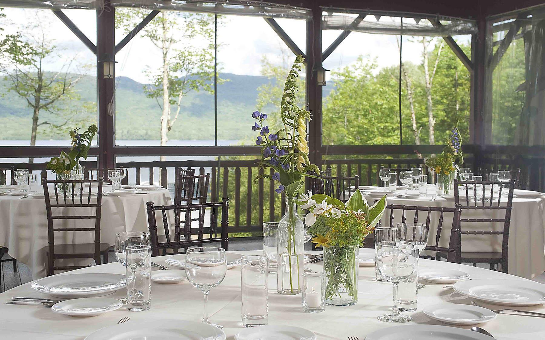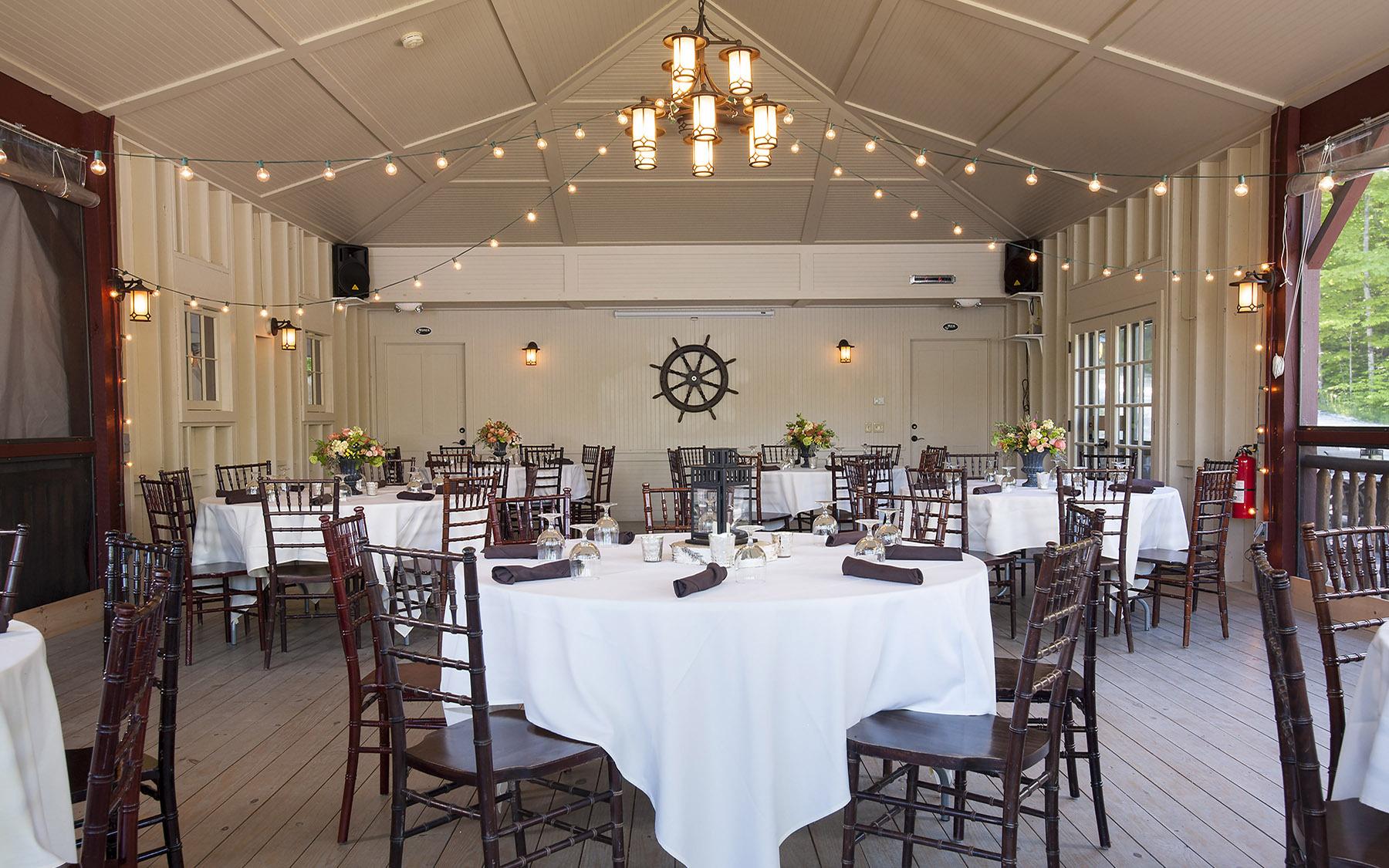 Located just yards from our private beach and +700 acre lake, our Lakefront Beach Pavilion, with its rustic Adirondack décor, fire-pit, patio and deck offers a unique Vermont reception option. Looking out through walls of windows to the spectacular lake and mountain views, the Pavilion is perfect for parties of +60 guests.