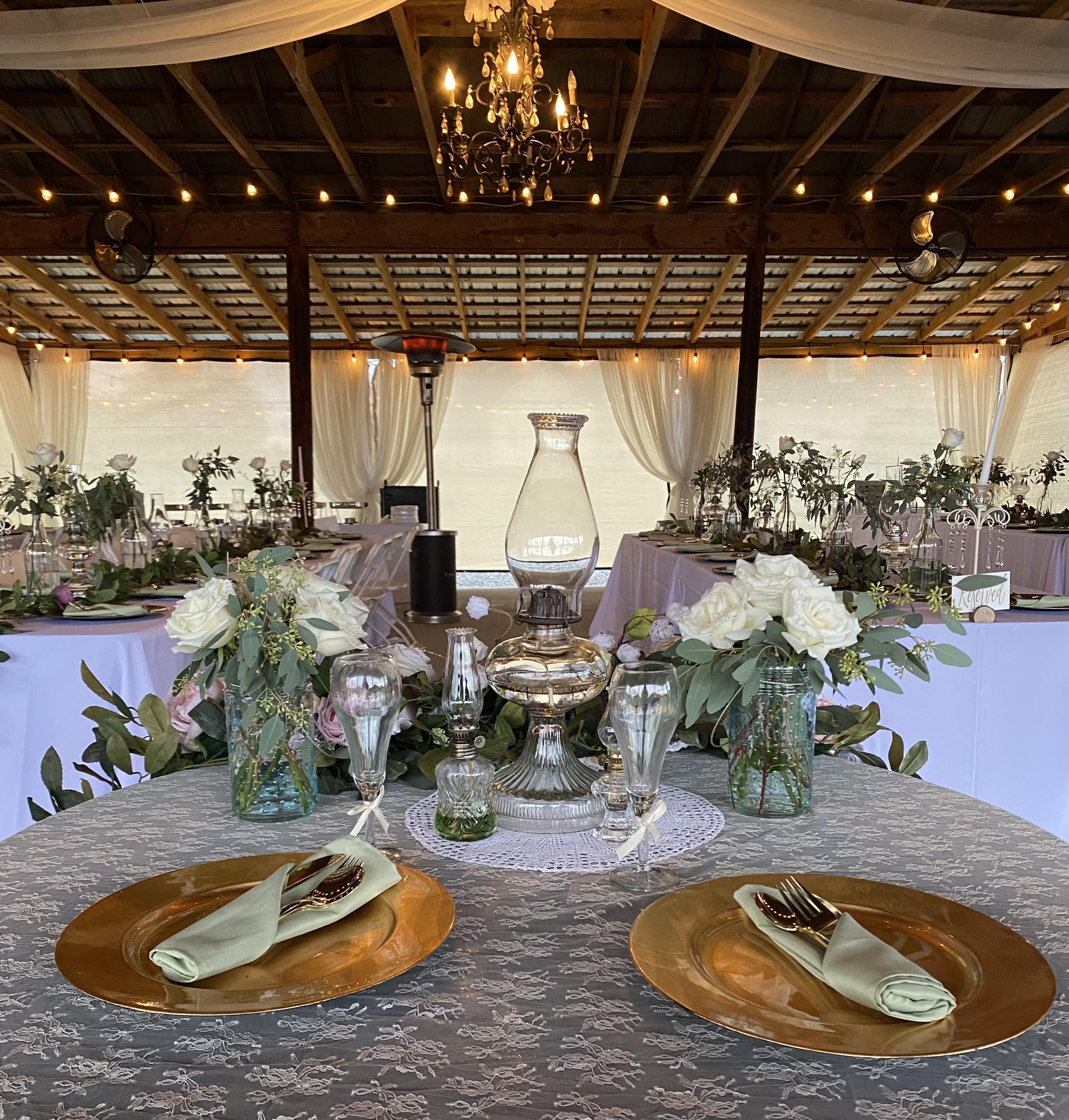The Reception Pavilion is primarily used for the wedding reception or rehearsal dinner. Other events, such as showers and birthday parties can also be held in this area. The ladies and gents restrooms are located down a hallway in the pavilion, as well as a prep kitchen.