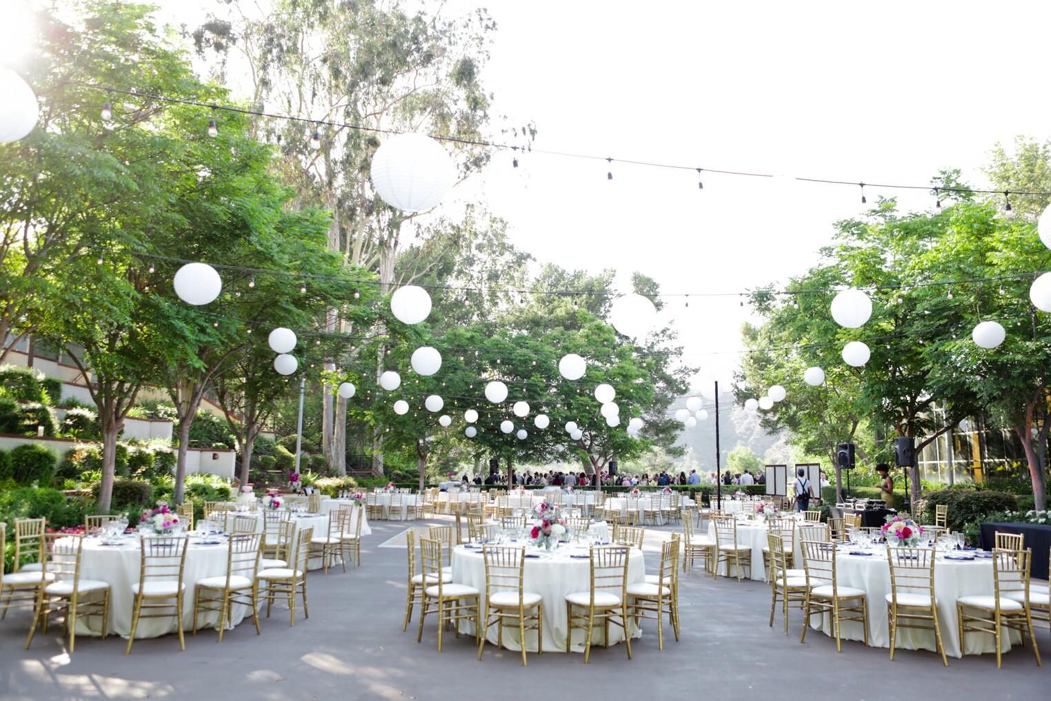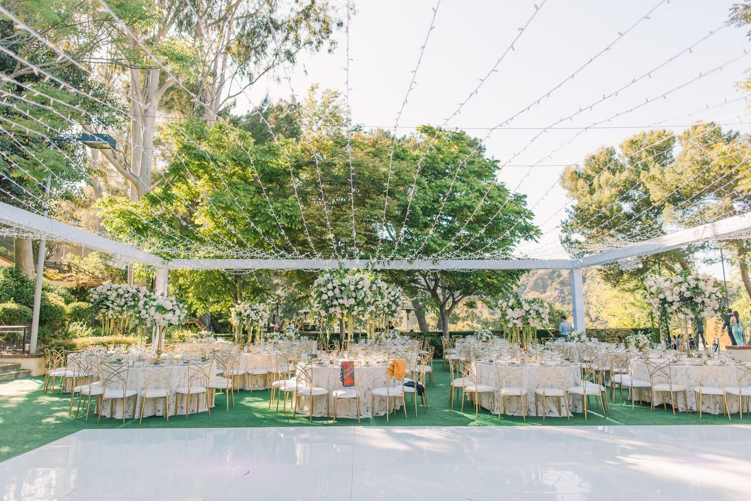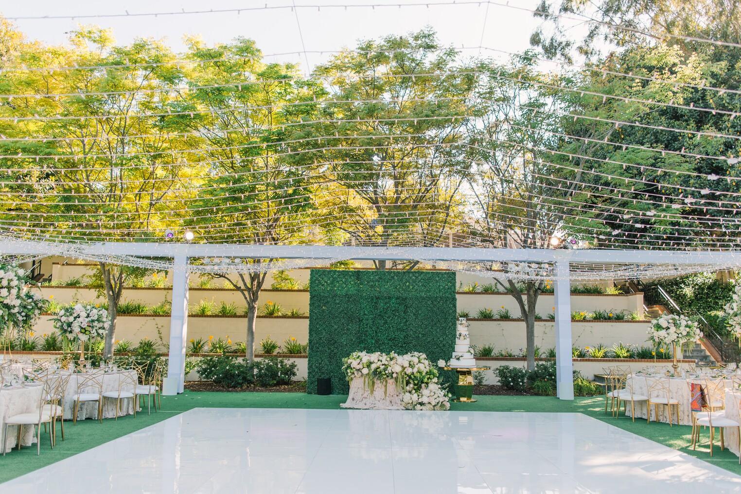 The club’s magnificent main entrance leads to a luxuriously appointed dining room highlighted by a dramatic glass atrium. Seating up to 200, the space features floor-to-ceiling windows that wrap around three sides of the room, offering breathtaking views of the emerald fairways and the impressive Santa Monica Mountains in the distance. Elegant earthy tones of the room give the Main Dining Room a charming, upscale ambiance that is easily customizable and works with a variety of color palettes. Host your reception set under strings of romantic lights and stars in the magical outdoor Garden Terrace, which can seat up to 400 guests.