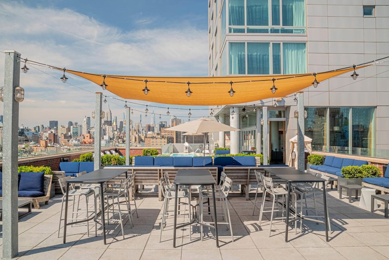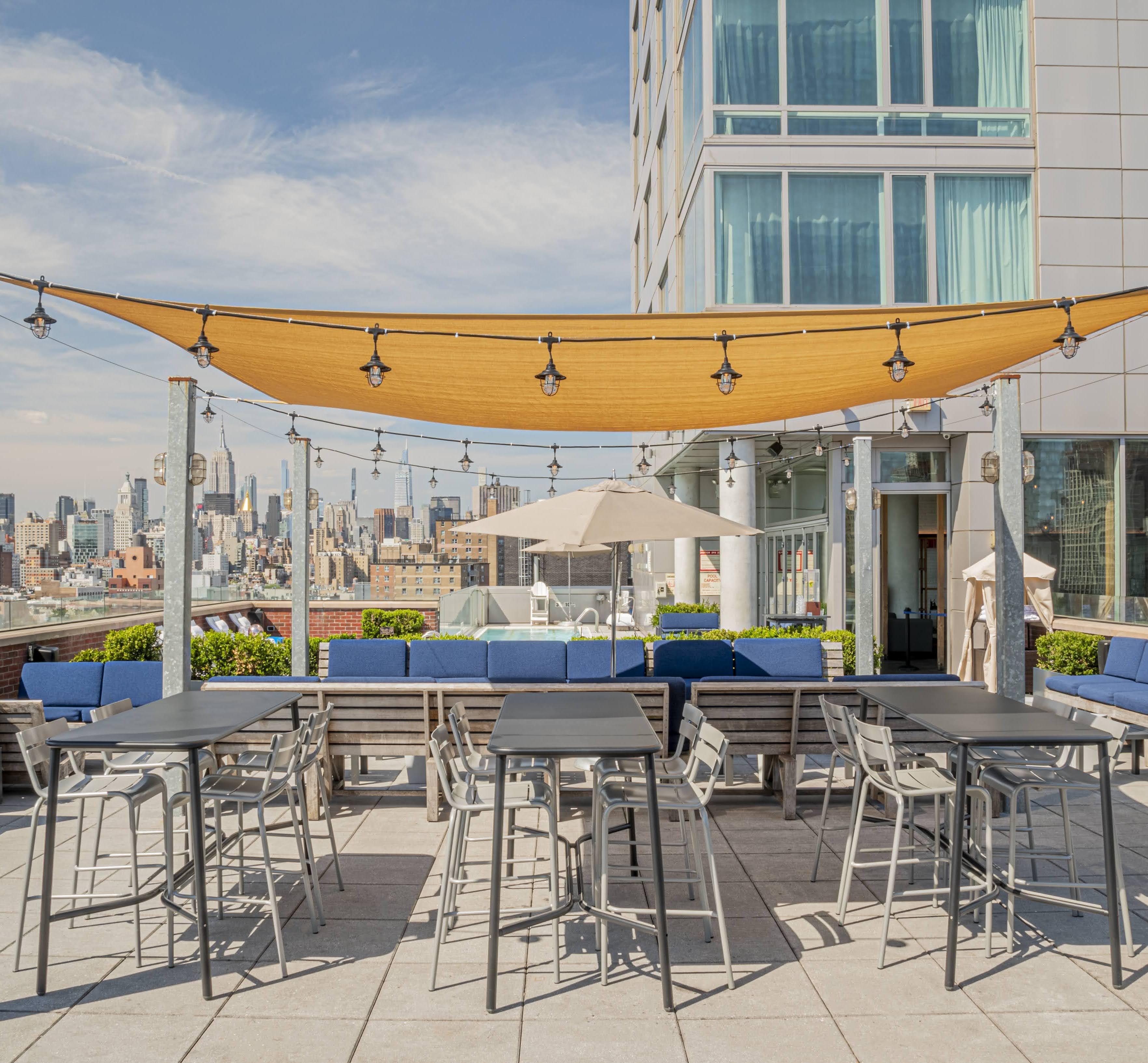 Imagine your wedding celebration with the iconic downtown New York skyline as your backdrop. Our 3,000 sq. ft. interior space offers a chic and modern setting, complemented by two stunning terraces. The intimate 750 sq. ft. eastern terrace is ideal for a romantic ceremony or cocktail hour. For a grander affair, our expansive 5,000 sq. ft. western terrace features a unique swimming pool, a stylish bar, and a variety of seating arrangements, perfect for a memorable reception under the city lights.