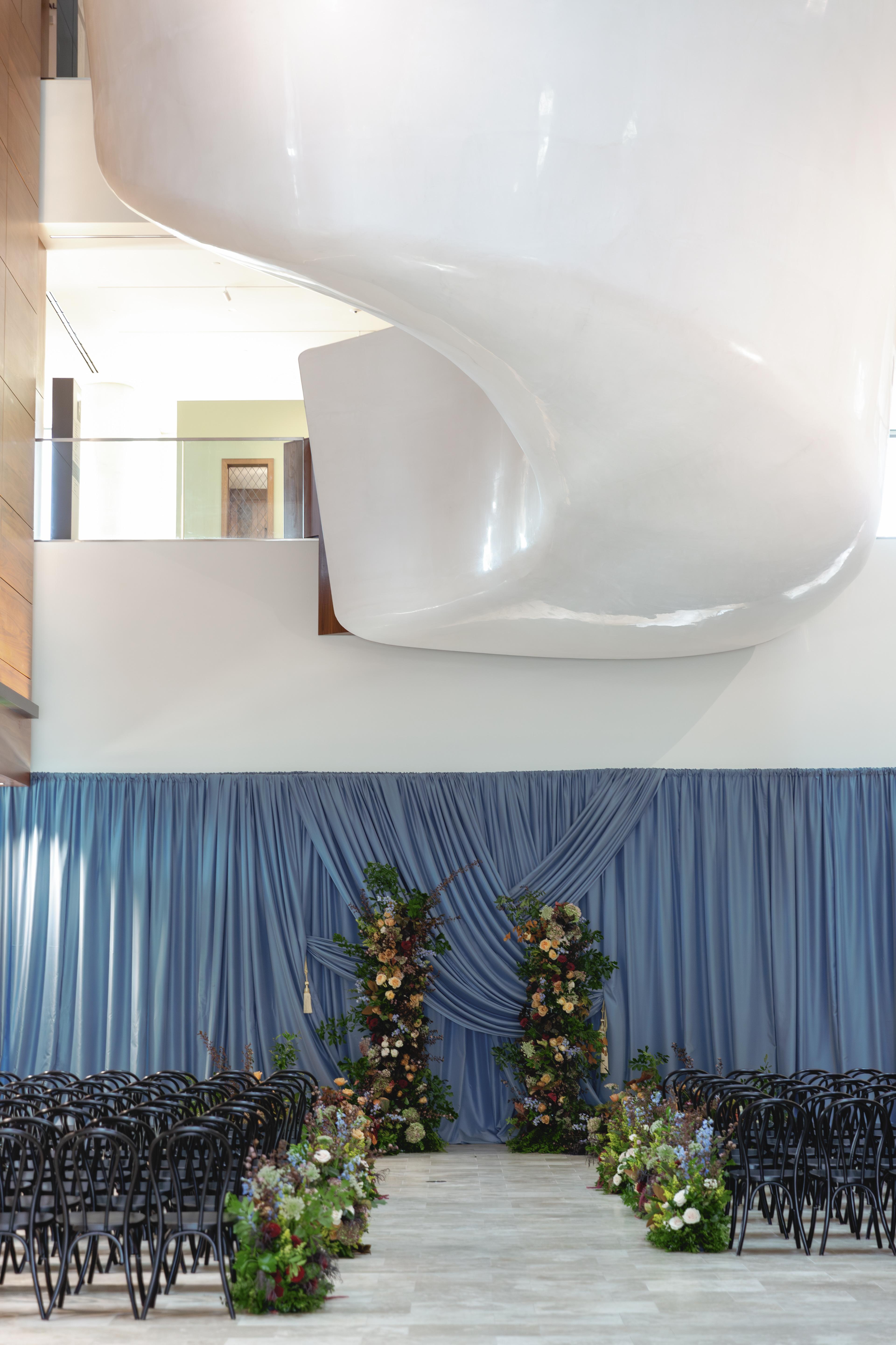 Its defining feature, the grand spiral staircase, creates a dramatic focal point, perfect for unforgettable photo moments. The spacious layout allows for creative event designs, accommodating both intimate and larger gatherings. Whether for a ceremony beneath the staircase or a lively reception, the Atrium provides a modern, elegant setting that elevates any celebration.