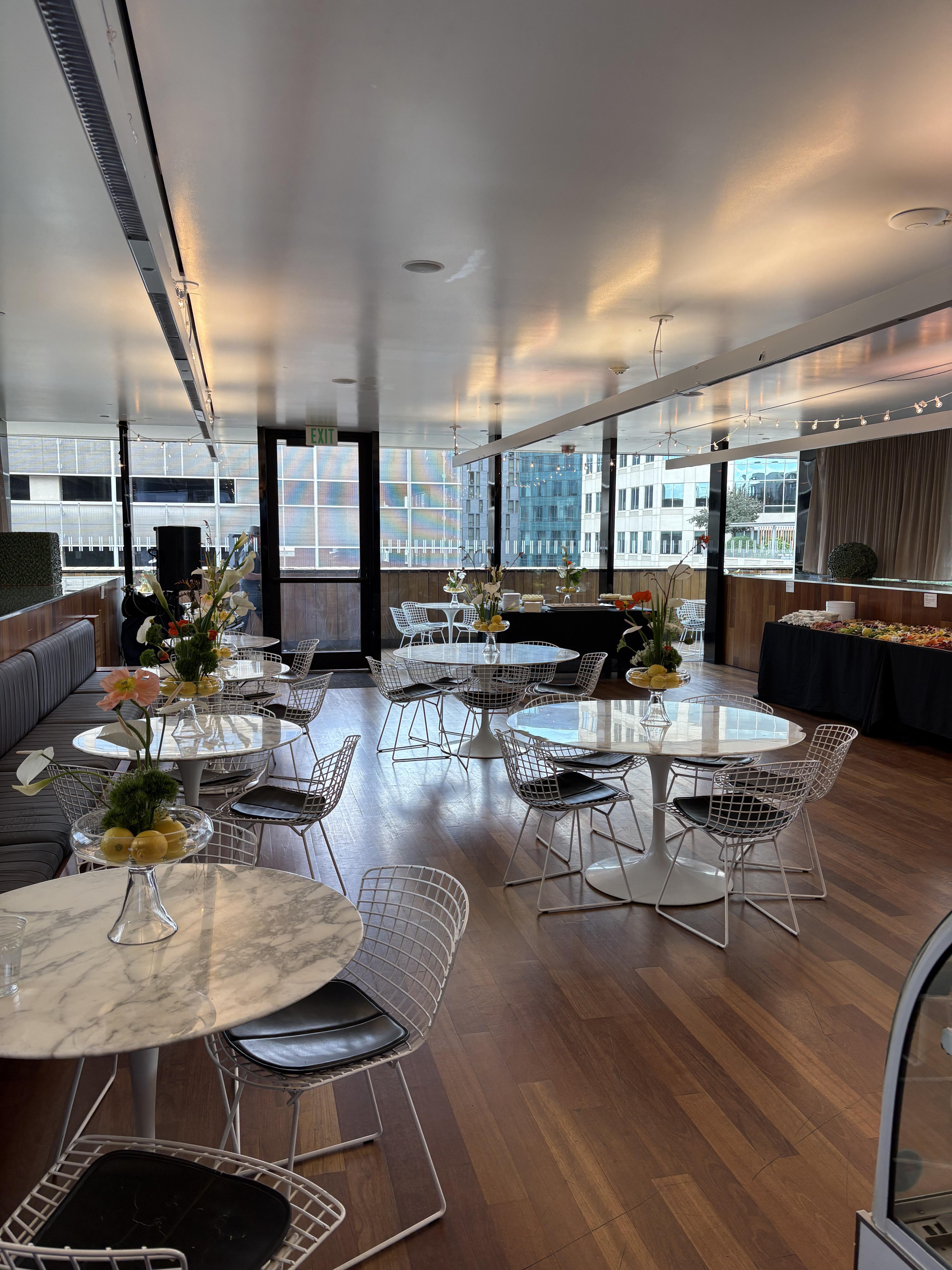The MCA Denver Café is an intimate space, well suited for small seated dinners and cocktail receptions. At 1,100 sq. ft., the Café’s warm, Brazilian Cherry wood interior provides a nearly 360-degree view of Denver's downtown skyline. Knoll Saarinen marble dining tables with white Bertoia side chairs provide luxury seating. Ceramic sculptures created by Kim Dickey inspired by the flora of June S. Gates Rooftop Garden complement this airy space. The wraparound rooftop deck hosts a south facing outdoor bar (weather permitting) along with Knoll tables and Bertoia chairs for additional outdoor seating. Galleries MCA Denver's current exhibitions are available for viewing to you and your guests during your rental. Tables, Chairs, & Bars 9 round white marble tables in the café; 40 café chairs; Plush covered bench; 4 round white tables on the rooftop; 16 rooftop chairs; 4 bar stools; 4 6’ rectangular tables; Outdoor bar (dependent on season); Indoor bar
