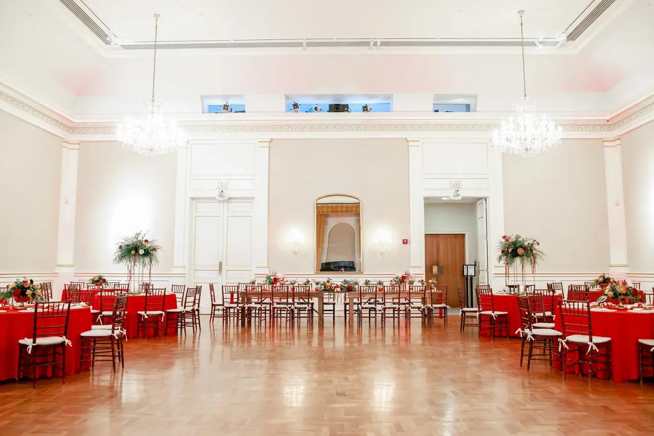 The Marly Room is an elegant ballroom in the heart of the Museum of Fine Arts. The ceilings are 22 feet-high and have 4 crystal chandeliers flanking each corner of the room. A wooden floor provides space for dancing and mingling. Adjoined to the left and right of the Marly Room are the Membership Garden and the Sculpture Garden. Photos by Amber McWhorter