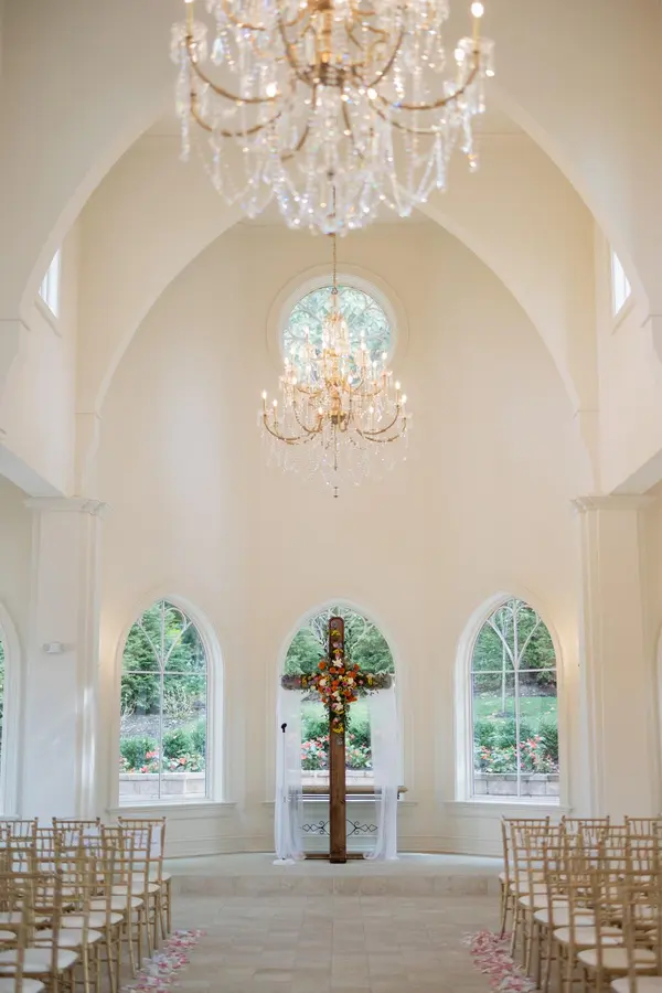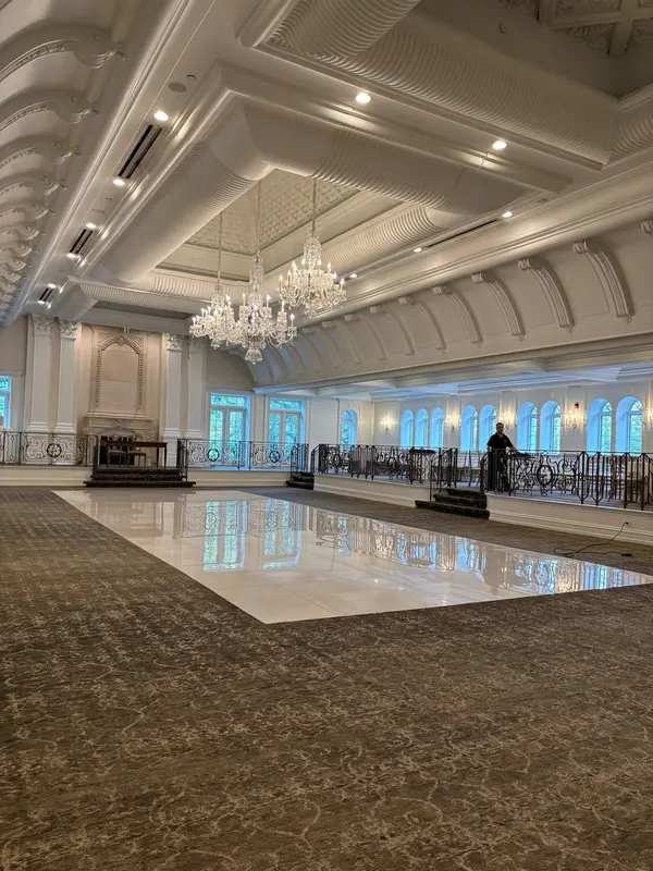 4 chandeliers - Fireplace - Oval tables (8' x 3' and 10' x 3') - Sweetheart Table - 1 Ballroom Bridal Suite with 1 Private Bathroom, 1 Main Bridal Suite with 2 Private Bathrooms, Hair and Makeup Area, 1 Groom's Suite with Private Bathroom. Polyester linens in varying colors - China, Flatware, Glassware - Cake Knife & Server - Champagne Flutes for couple - Built in dance floor