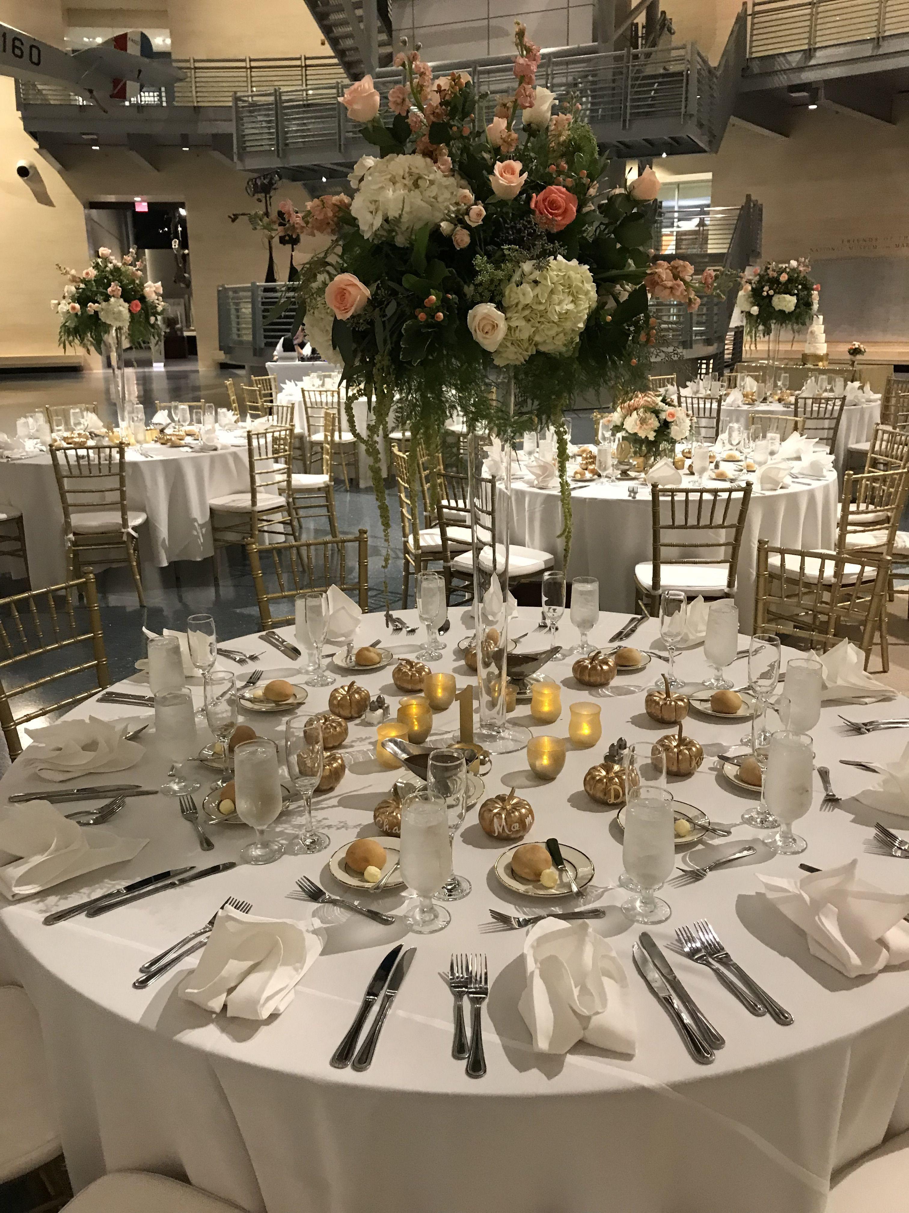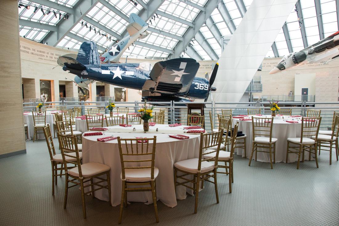 With balcony views, this intimate spaces looks out at the Leatherneck Gallery's aircraft. Whether it be a standing cocktail reception or formal seated dinner, this versatile space offers a blank canvas that can be transformed for any occasion.
