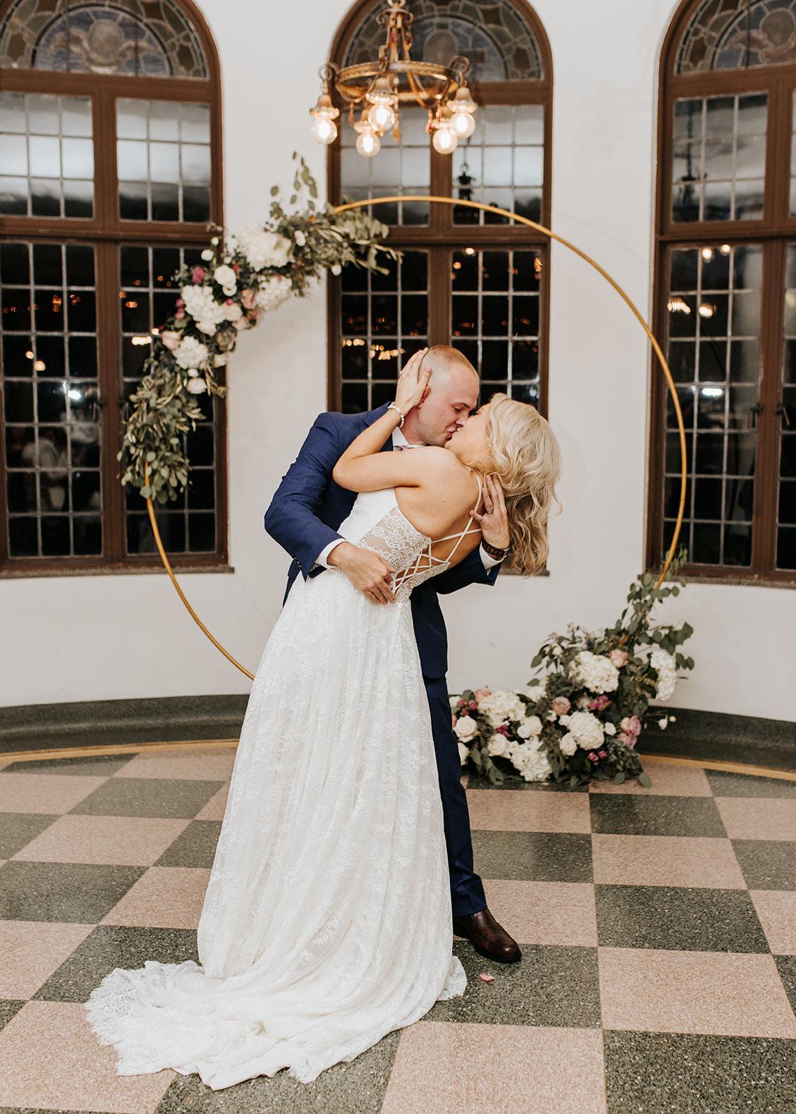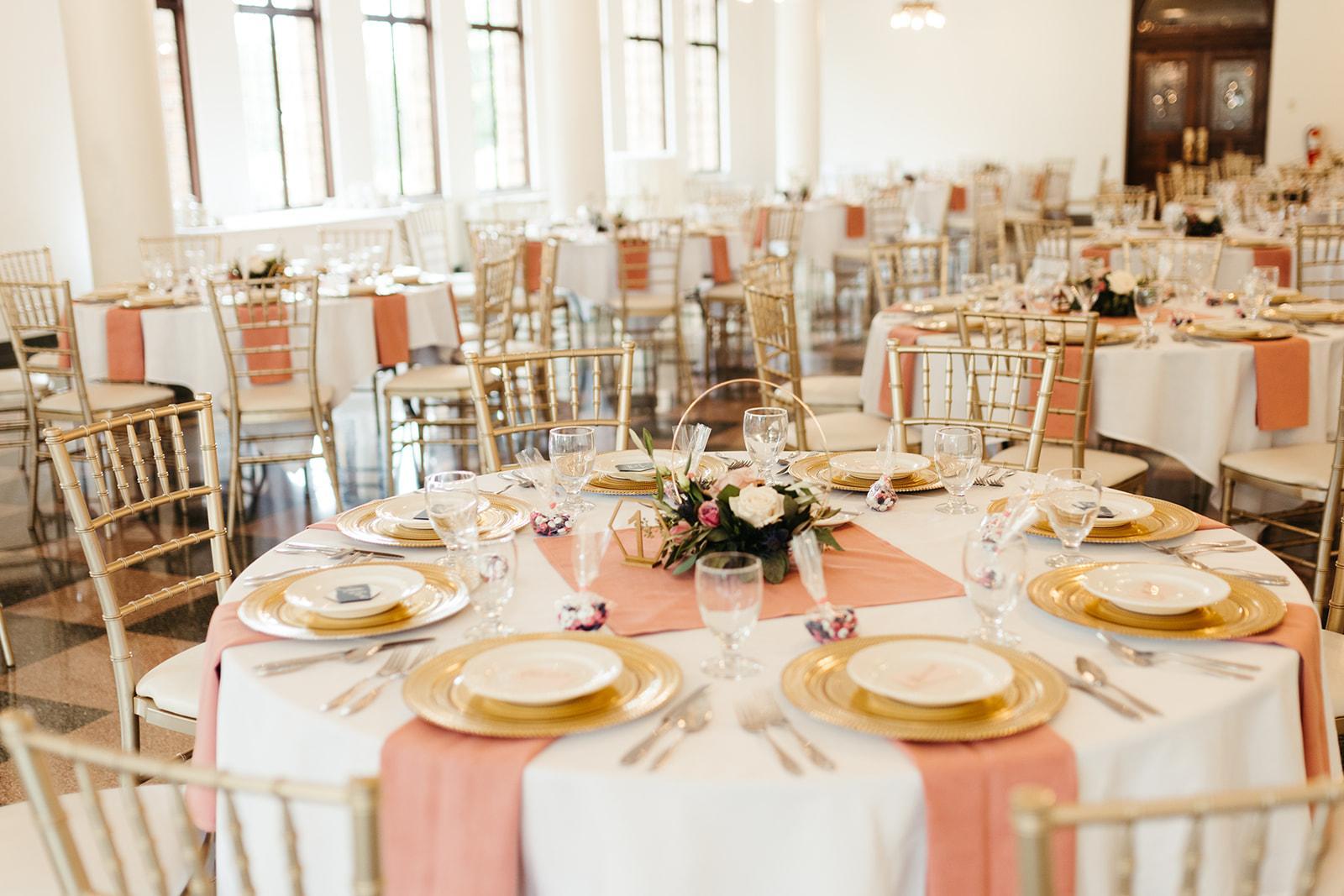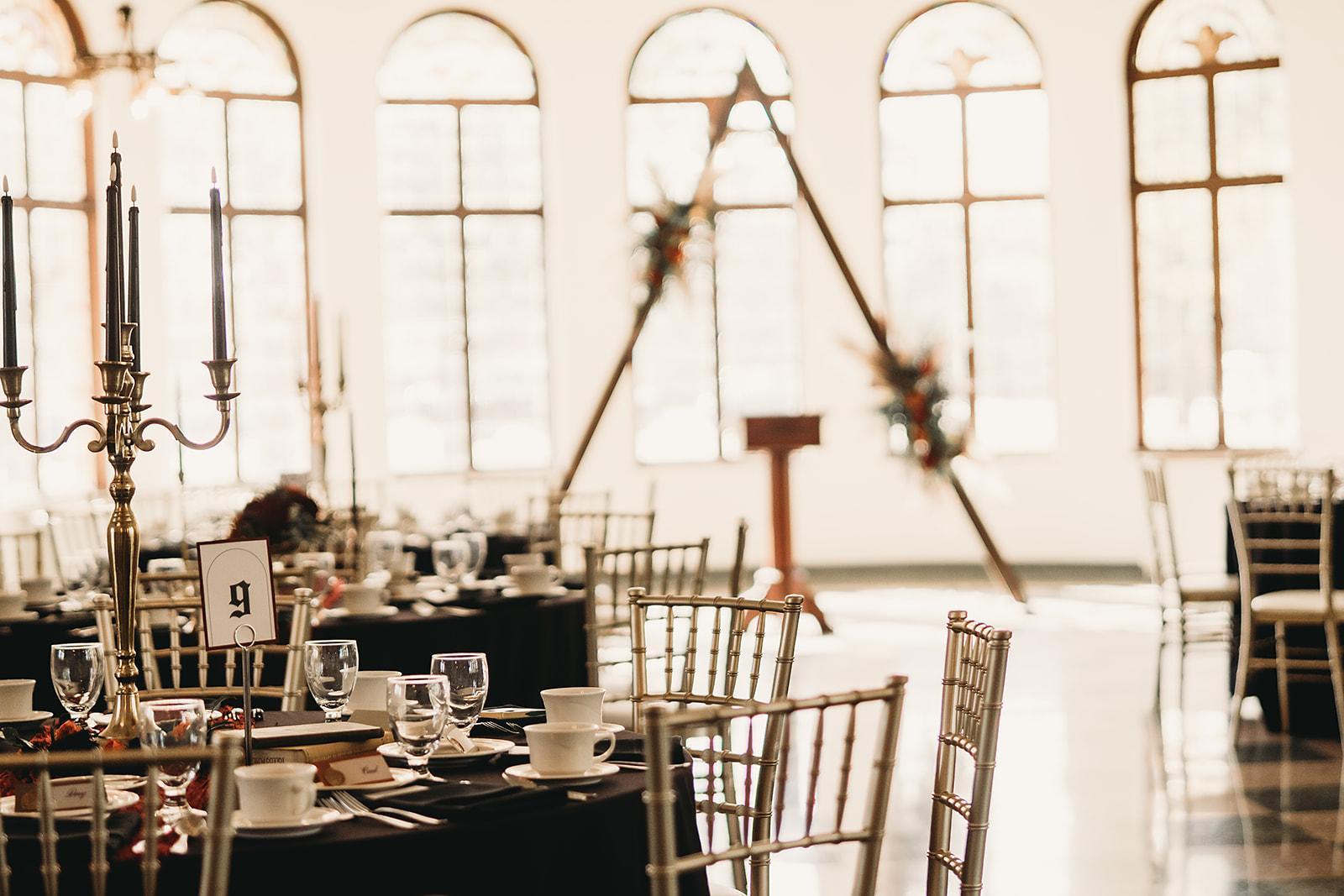 Original stained glass, classy columns and brass chandeliers grace this beautiful ballroom. The numerous windows in this ballroom to bring nature indoors while transforming the vibrant colors of the sunset. The light shining through the windows during the day creates the best photo opportunities. During the evening, the setting sun mixed with fun up-lighting or the soft glow from candlelight make Cadet West the perfect reception space.