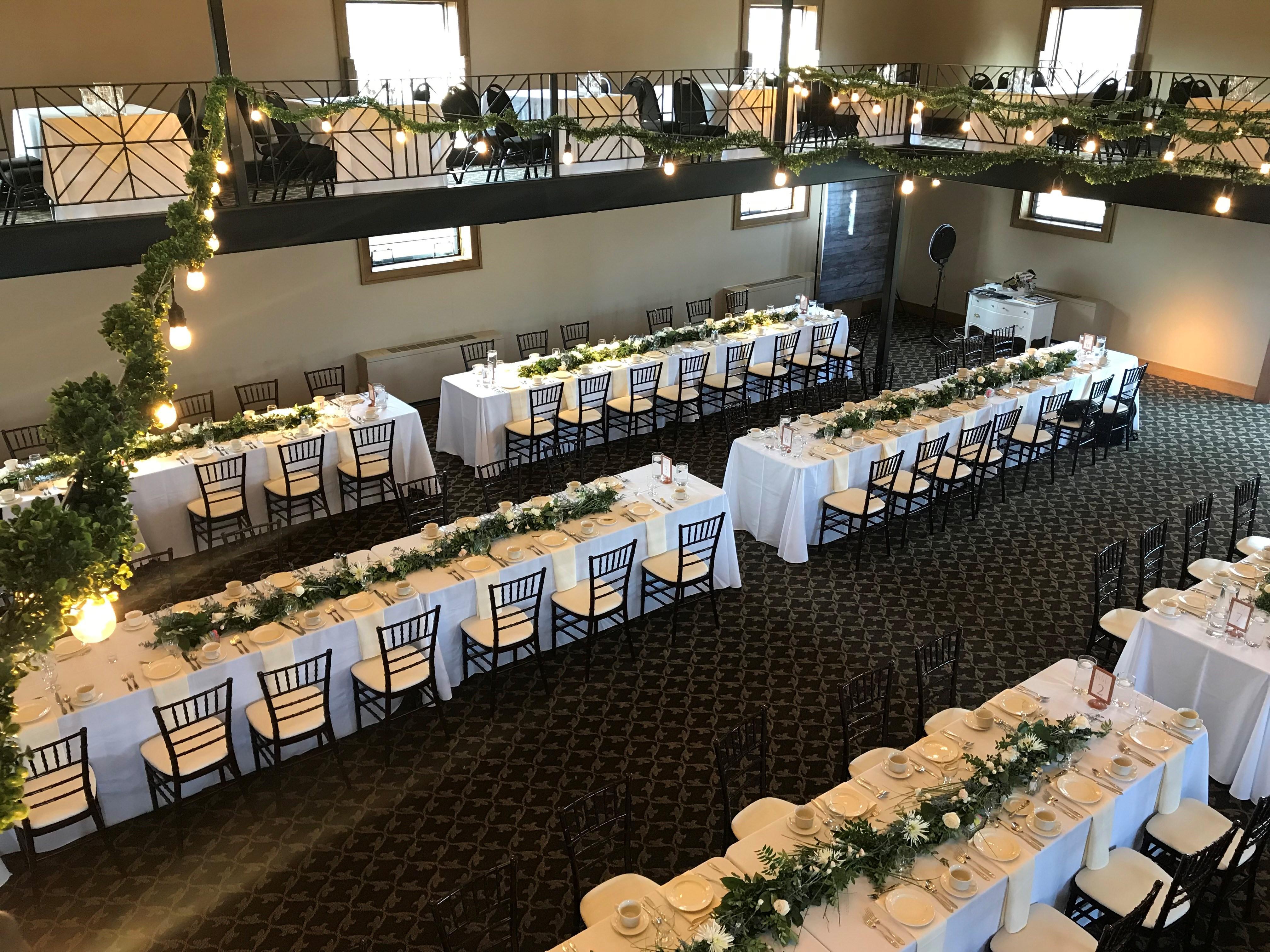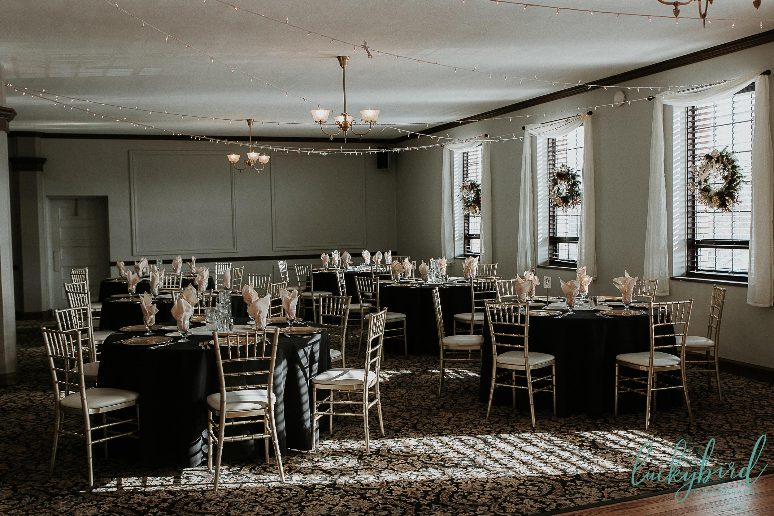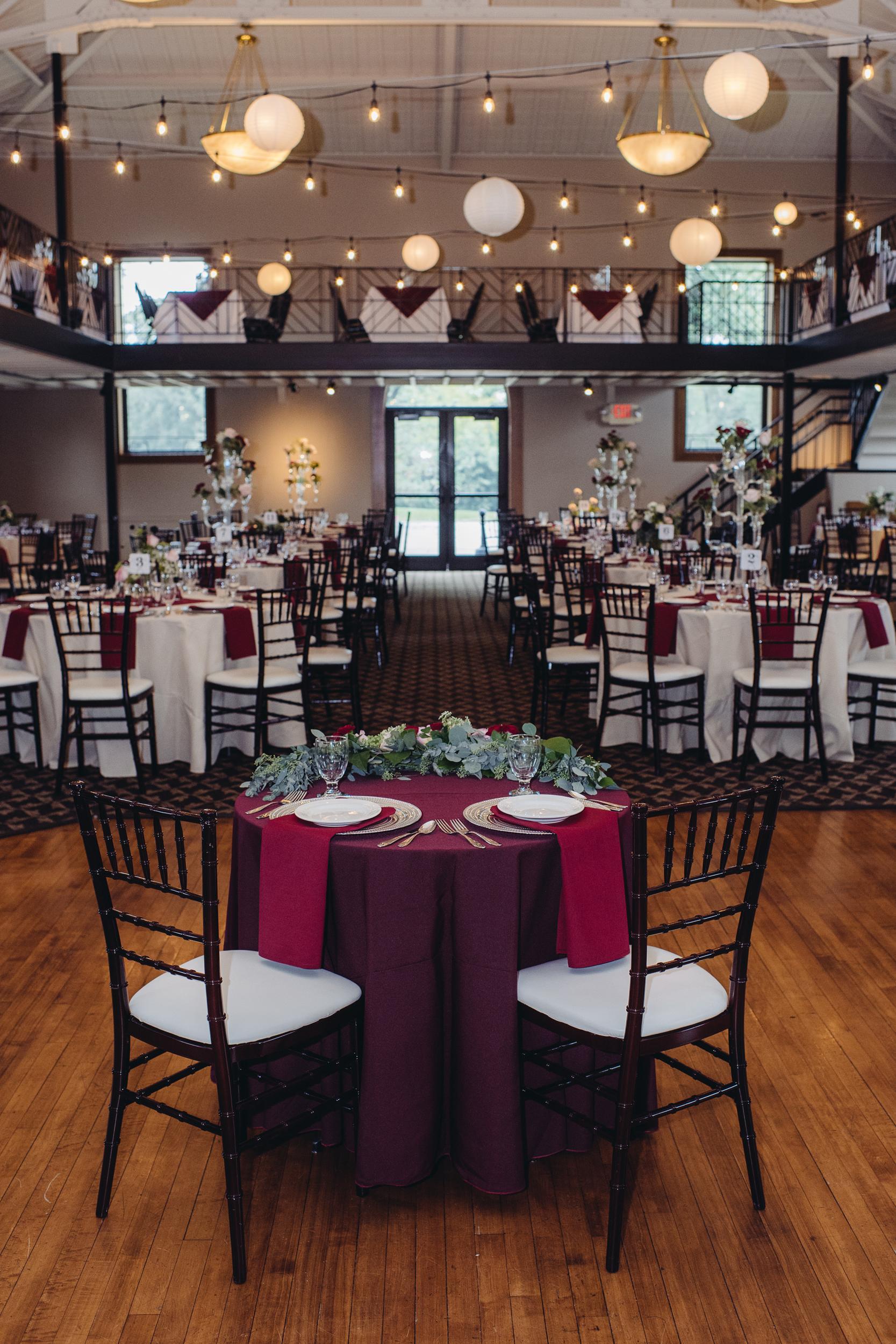 Daytime events are illuminated by natural light shining through the large windows. During evening events, flickering candlelight creates a romantic feel. Included with this ballroom is a transformative pipe and drape backdrop that perfectly complements the head table. The room's comfortable size and private location on the second floor make it the perfect location for a variety of events, including wedding receptions, business meetings, holiday events, class reunions and Greek formals.