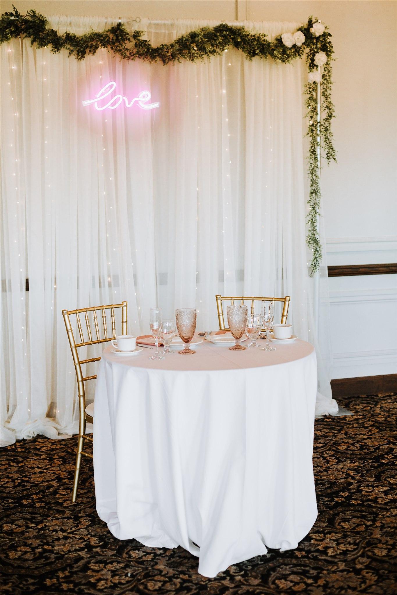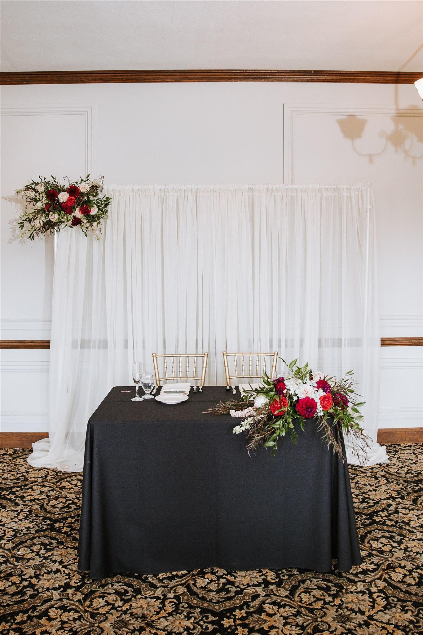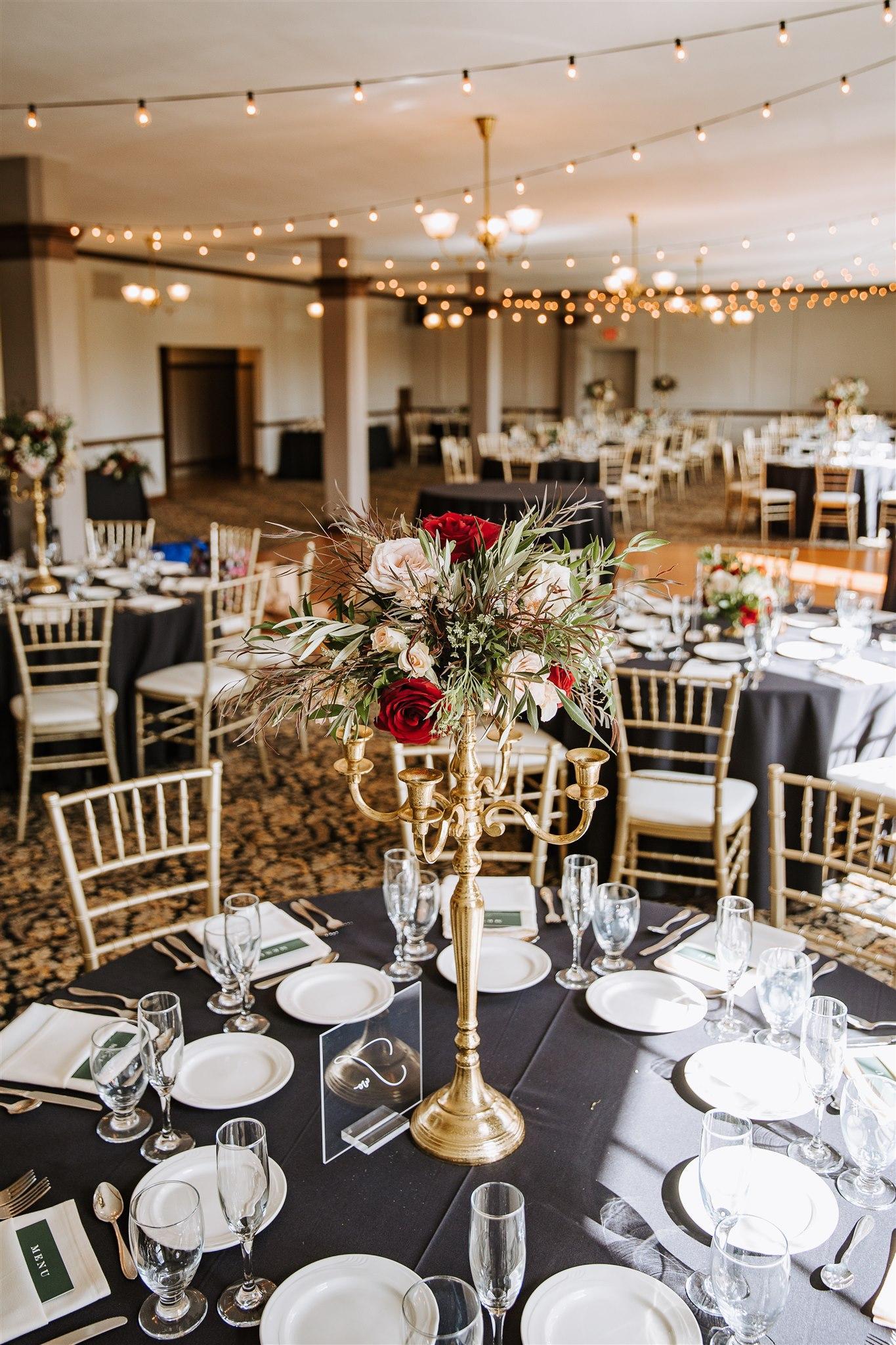 Daytime events are illuminated by natural light shining through the large windows. During evening events, flickering candlelight creates a romantic feel. Included with this ballroom is a transformative pipe and drape backdrop that perfectly complements the head table. The room's comfortable size and private location on the second floor make it the perfect location for a variety of events, including wedding receptions, business meetings, holiday events, class reunions and Greek formals.