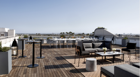 The outdoor rooftop space boasts sweeping views of Hollywood landmarks overlooking Sunset Boulevard.