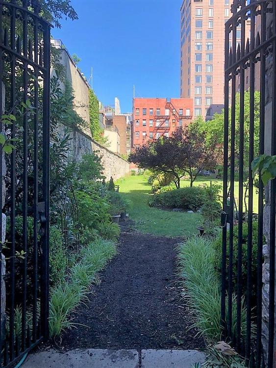 This East Village urban oasis features twelve-foot tall marble walls that enclose its half-acre of open lawn with shade trees, floral gardens and benches. Entered through two handsome wrought iron gates, the garden is reached by a hundred foot long driveway.
