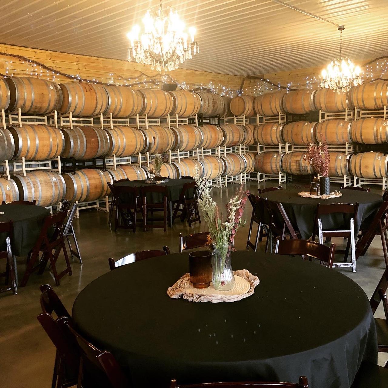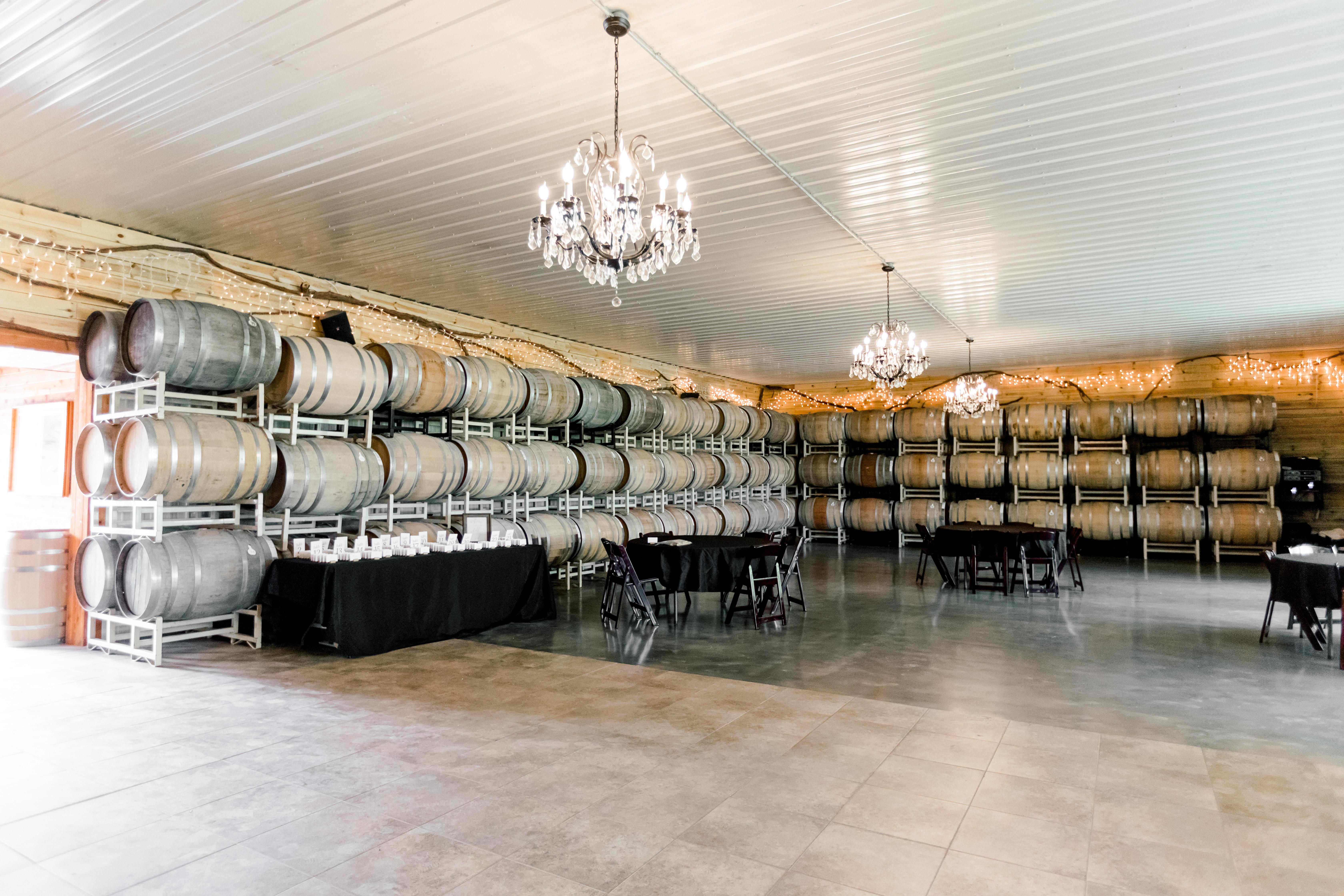The Barrel Room is a venue that has walls of barrels, an impressive wall of wine bottles, and picturesque barn doors leading to the production area. Guests are welcome to explore the winery, vineyard, and distillery.