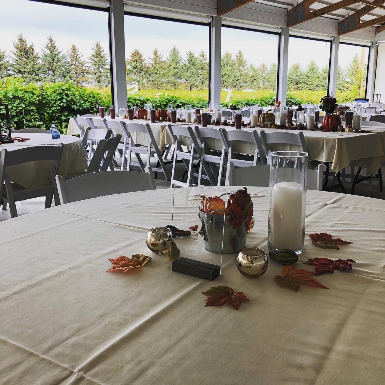 Liability Insurance Heating and A/C Lighting Bartenders Wedding Suite w/ Heat and A/C Patio Deck Parking Grassy area for lawn games High top barrels for cocktail hour 60 in. round & 6 ft & 8 ft rectangular tables Reception chairs Ceremony benches Wooden ceremony arch Set-up & Clean-Up of reception tables and chairs, ceremony chairs/benches, and high-top barrels